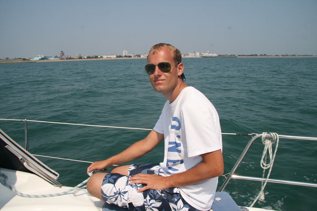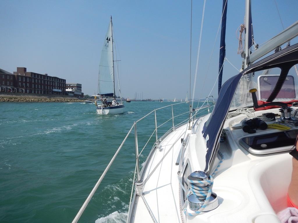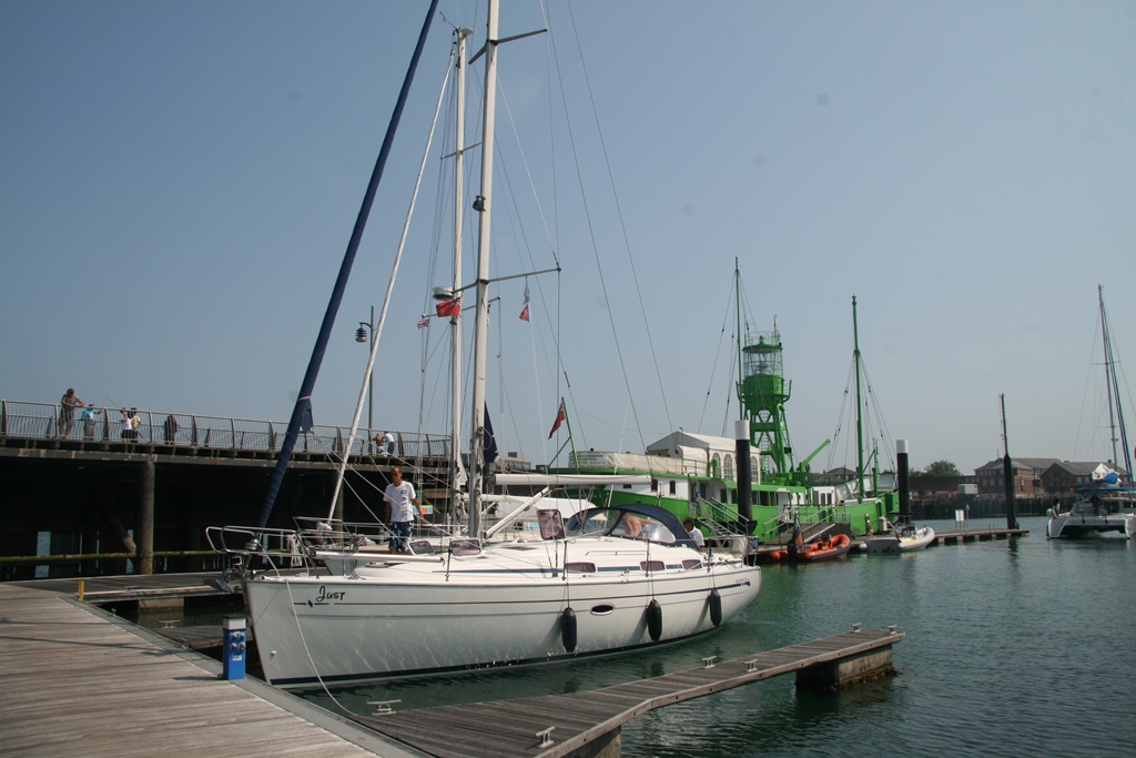 Rustig opstaan en eerst even gekeken of de ASDA open was voor een paar verse gebakken stokbroodjes. Helaas die was nog dicht. Toen ik terug was op de Just was iedereen uit bed en klaar voor de afvaart met de oven alvast aan voor de gebakken broodjes. Op zee was het rustig en weinig wind. Eerst het grootzeil uit, toen ook maar de genakker. Maar die pakte te weinig wind, dus het grootzeil maar weer gestreken. Tijd voor het ontbijt, want de broodje waren warm. Met een lekker gangetje liepen we 2 andere bootjes voorbij. Na ruim een uur was het uit met de pret, geen wind. Genakker gestreken en de motor aan, zwemkleding aan, zonnebrand gesmeerd, ligbedjes op het dek, af en toe een douche op het achterdek. Met een kaarsrechte koers naar Portsmouth toe. Eerst moesten we naar de visitorssteiger, maar bij de vriendelijke havenmeester kregen we toch een box toegewezen. Marianne en Daniel gingen de Just een beetje schoonmaken. Ik zou eerst samen met Mark boodschappen halen voor de maaltijd van vanavond, maar de plannen zijn gewijzigd. We gaan voor de verandering uit eten bij de Wetherspoon. Dus ging ik samen met Mark bootjes kijken bij de Endeavour werf waar een boel snelle boten op de kant stonden, de een nog mooier dan de ander. Na al dat moois hebben we lekker in het kuippie geborreld. De jongens hebben alle info op internet gezocht van de mooie boten. Zo genoeg geluierd, op naar de Wetherspoon voor wat te eten en lekker toetje. Na de maaltijd een klein wandelingetje richting supermarkt om te kijken naar de openingstijden voor ons ontbijtje voor morgenochtend. Nu nog even met boekje in de kuip, morgenochtend shoppen in Portsmouth en in de middag naar Cowes .