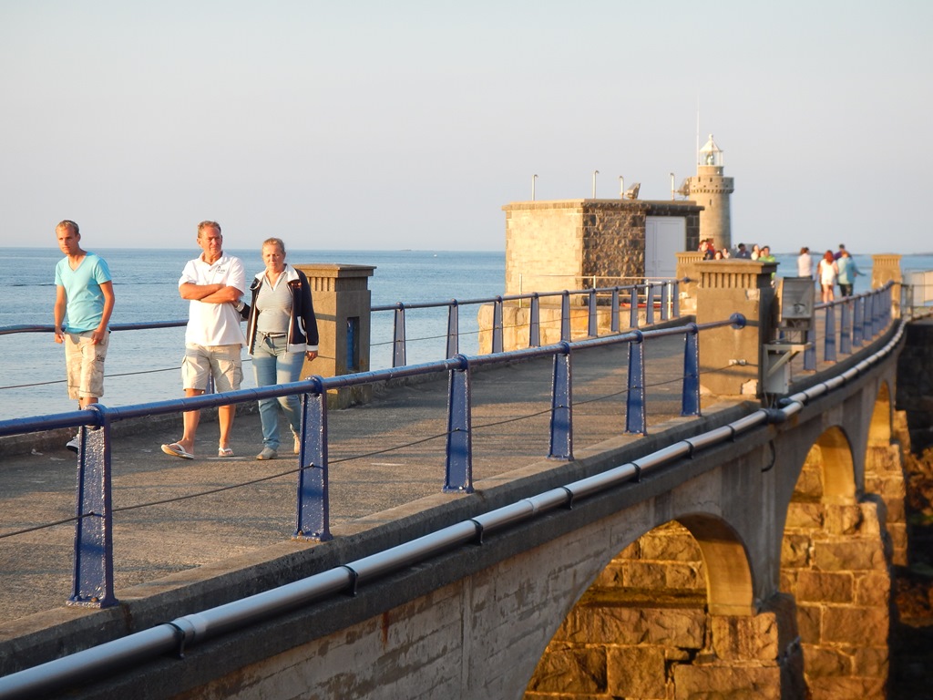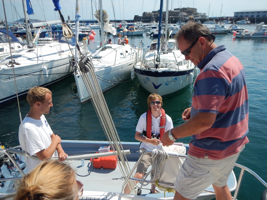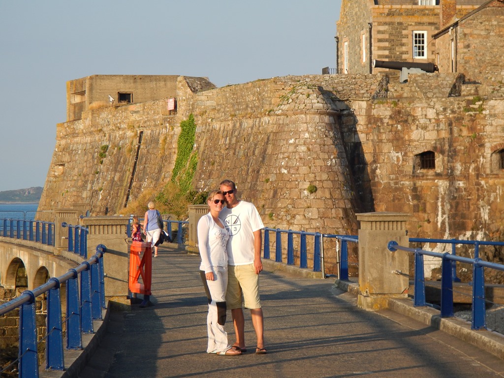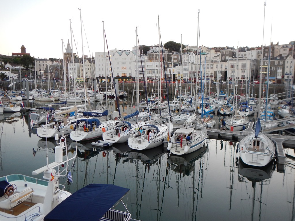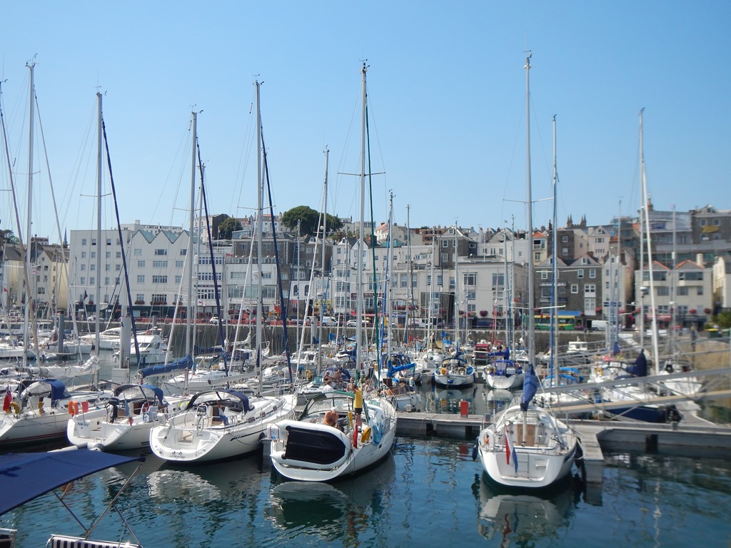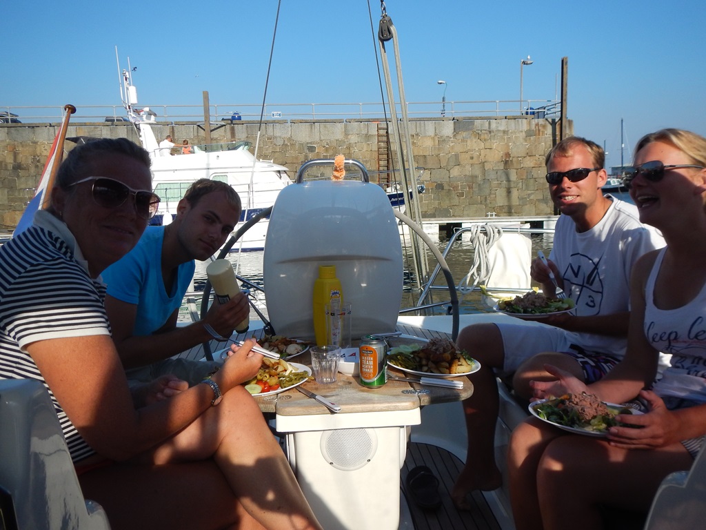We hadden besloten om rond 8:00 uur te vertrekken van ons plekje buiten de haven, waar we 7 dik lagen. s ’Nachts om 1:15 uur kwam er nog een bootje langszij. Het ging allemaal goed, mede doordat het zo’n rustige nacht was, zonder wind. Maar ik had wel medelijden met het bootje wat als eerste aan de kade lag. Om 6:00 uur zat ik al een boekje te lezen in de kuip en van het uitzicht te genieten en wachten tot de rest van de bemanning zich aan dek kwam presenteren. Even voor 8:00 uur gingen we op weg naar Guernsey. De oven ging aan om een stokbroodje op te piepen en ik ging met een notitieblokje langs de bemanning wat ze als ontbijtje wilden hebben. Al varend langs de wandelroute die we gisteren liepen, hebben we die opgepeuzeld. Het was een zonnig en windloos tochtje naar Guernsey. Wel het fokje even uitgehad, maar die hing er als een vaatdoekje bij. Met een aardig bruin tintje zijn we de haven binnengevaren. Even uitkijken naar de havenmeester in z’n bootje die ons een ligplaatsje zal aanwijzen. Oeps, we zijn iets te vroeg, dus we moeten even wachten aan de steiger tot dat de drempel 2 meter is. We werden keurig opgevangen door de havenmeesters in hun bootjes die ons een box aanwezen. Marion en Mark hadden honger en die gingen voor een ragoutje, lekker met een temperatuur van 31,4 graden. Ik ga zo wel voor een ijsje J. Tijdens het veel te warme wandelingetje door de smalle straatjes vonden we gelukkig een ijstentje en namen we allemaal maar een ijsje. Terug op de Just hebben we lekker in het kuipje gezeten en naar de nog steeds binnenkomende bootjes gekeken die steeds meer risico namen door het dalende water. En ja hoor, de maximale hoogteschaal stond op 1.40 meter, toen er nog een zeilbootje naar binnen wilde. Hij stuiterde met een paar golfjes flink over de drempel van de haveningang. Met Mark heb ik de maaltijd gemaakt, we eten aan boord een koude salade met tonijn, en als toetje yoghurt of custard met aardbeien. Na de afwas hebben we een wandeling naar het kasteel gemaakt en rustig terug naar de Just geflaneerd. Morgen naar Frankrijk. We zitten nog te dubben naar welk plaatsje en wat voor afstand we willen varen.