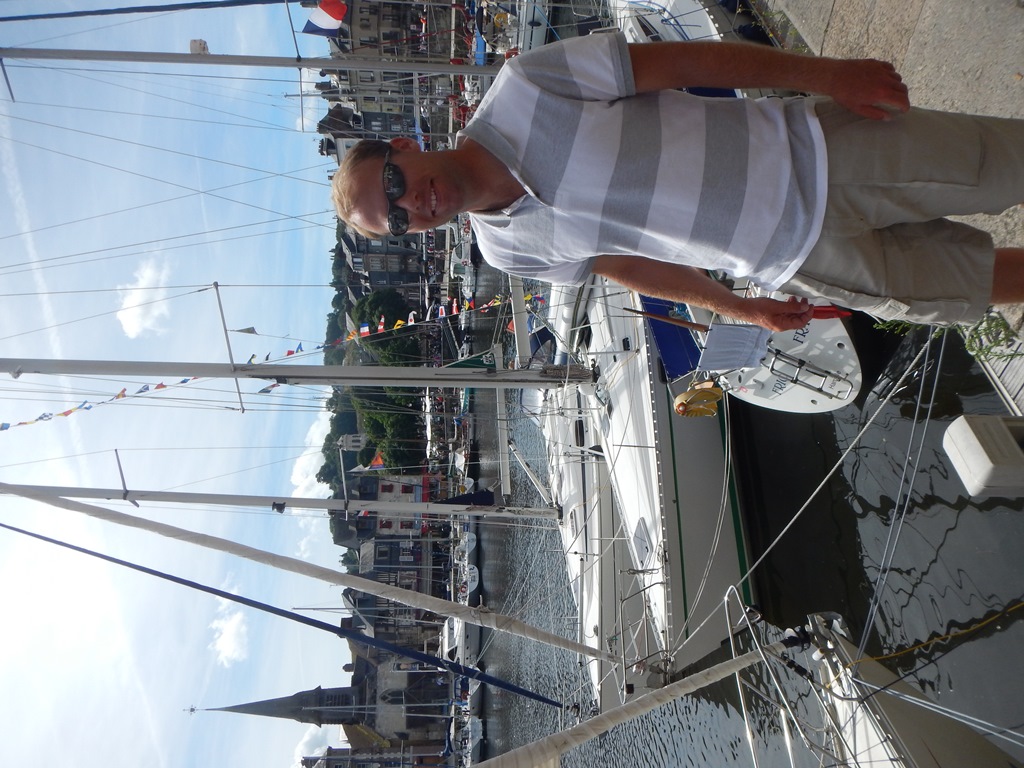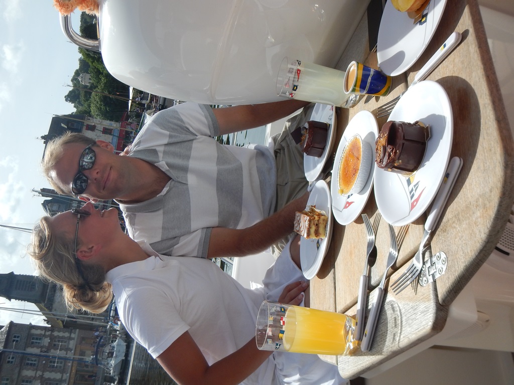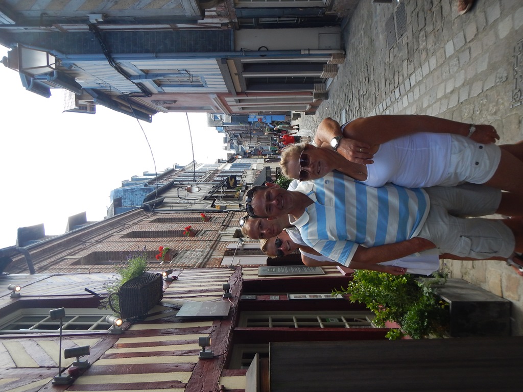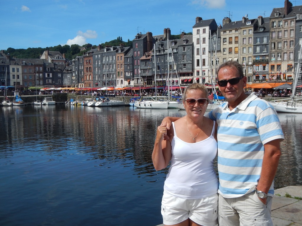 Maar eerst vroeg wakker worden, want we vertrekken om 7 uur voor een kort tochtje naar Honfleur. Het was helemaal windstil en hebben de vlaggetjes voor Mark’s verjaardag al in top gehangen. Het tochtje naar Honfleur verloopt rustig, want er staat heel weinig wind. Het lijkt hier wel weer een cruiseboot want iedereen, behalve Marion en ik, liggen languit in bed of op de bank weg te zakken. Het zonnetje gaat steeds feller branden, dus dat belooft een mooie dag. We konden mooi door een geopende sluis varen en nadat we heel even op de brugopening van 9.30 uur hebben moeten wachten, kwamen we aan in de rustige oude haven van Honfleur (le vieux bassin). We lagen snel langszij en gingen op zoek naar een boulangerie voor stokbroodjes en gebak. Heerlijk in de kuip ontbeten met een sprookjesachtig decor a la de Franse versie van Anton Pieck – Charles Dickens. We hebben er een hele luie dag van gemaakt met verjaardagsgebakje, een heel klein stukje wandelen, zonnen op het voordek, klein tukkie doe, mensen kijken, wijntje erbij en een happie. Als we van iedereen die vandaag van onze boot een foto maakte een euro hadden gekregen, dan hadden we er ’s avonds ruim van kunnen eten. We hadden al 2 restaurantjes gespot voor Mark’s verjaardagsetentje. ’s Avonds hebben we een goede uiteindelijke keus met lekkere gerechtjes. Mark heeft met smaak z’n eerste Fruits de Mer genuttigd. Terug op de Just nog tot laat in de kuip gezeten en wat met de buren sterke verhalen uitgewisseld.