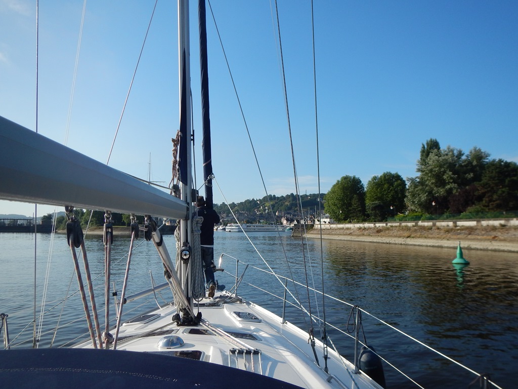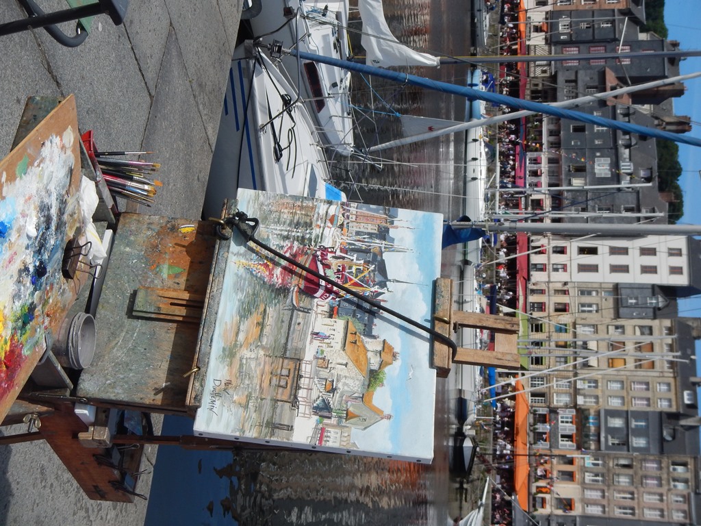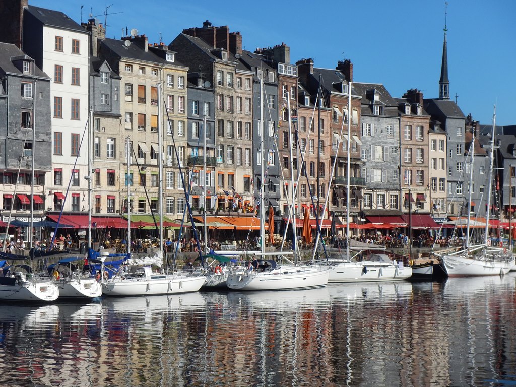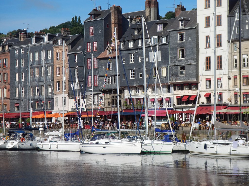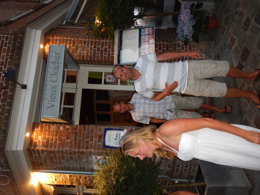 Maar eerst vroeg wakker worden, want we vertrekken om 7 uur voor een kort tochtje naar Honfleur. Het was helemaal windstil en hebben de vlaggetjes voor Mark’s verjaardag al in top gehangen. Het tochtje naar Honfleur verloopt rustig, want er staat heel weinig wind. Het lijkt hier wel weer een cruiseboot want iedereen, behalve Marion en ik, liggen languit in bed of op de bank weg te zakken. Het zonnetje gaat steeds feller branden, dus dat belooft een mooie dag. We konden mooi door een geopende sluis varen en nadat we heel even op de brugopening van 9.30 uur hebben moeten wachten, kwamen we aan in de rustige oude haven van Honfleur (le vieux bassin). We lagen snel langszij en gingen op zoek naar een boulangerie voor stokbroodjes en gebak. Heerlijk in de kuip ontbeten met een sprookjesachtig decor a la de Franse versie van Anton Pieck – Charles Dickens. We hebben er een hele luie dag van gemaakt met verjaardagsgebakje, een heel klein stukje wandelen, zonnen op het voordek, klein tukkie doe, mensen kijken, wijntje erbij en een happie. Als we van iedereen die vandaag van onze boot een foto maakte een euro hadden gekregen, dan hadden we er ’s avonds ruim van kunnen eten. We hadden al 2 restaurantjes gespot voor Mark’s verjaardagsetentje. ’s Avonds hebben we een goede uiteindelijke keus met lekkere gerechtjes. Mark heeft met smaak z’n eerste Fruits de Mer genuttigd. Terug op de Just nog tot laat in de kuip gezeten en wat met de buren sterke verhalen uitgewisseld.