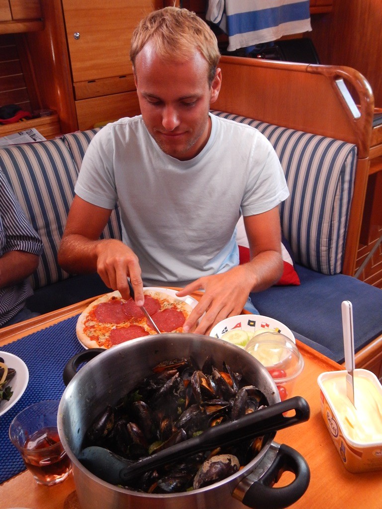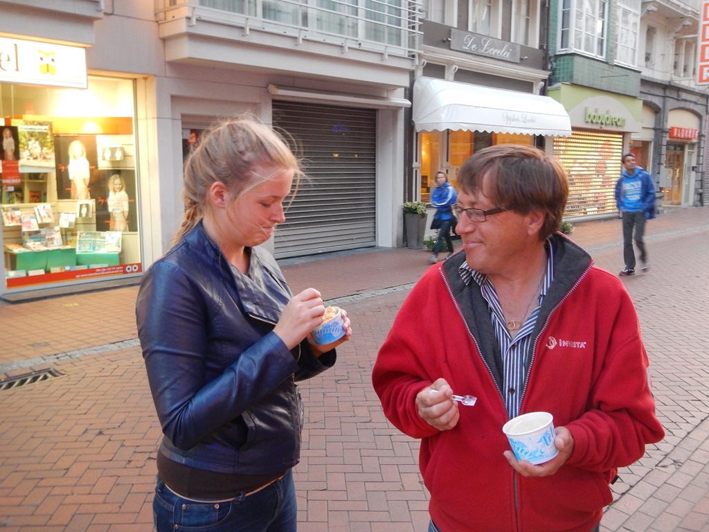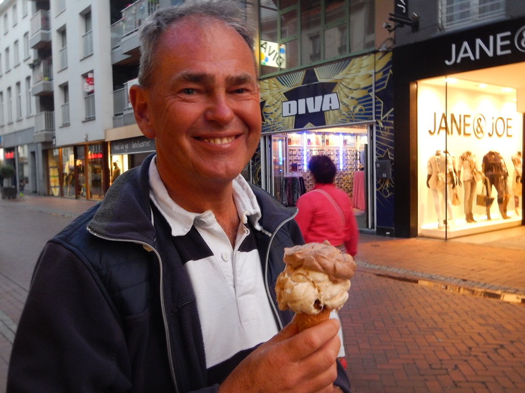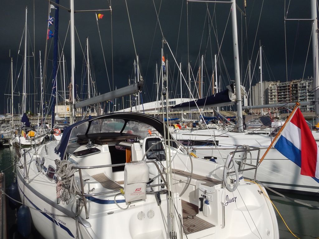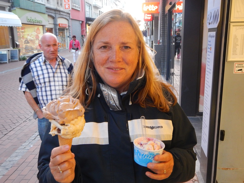 Vanmorgen wilde ik vroeg douchen, maar het begon te regenen, dus dan maar krantje lezen op de iPad. Het werd weer droog, dus alle gebruikelijke ochtendrituelen kon ik afwerken, inclusief de op de vrijdagmarkt gehaalde warme kippendijen voor het ontbijt. Toen ik terug kwam was Marianne aan het douchen, die in deze haven toch een stukje verder weg is, dan in andere havens en de lucht was zwarter dan zwart geworden. Het begon al te druppelen, ik dacht galant te wezen en ging haar halen met een grote paraplu. Nou dat was een foutje beslissing, ik kwam zeiknat bij de douches aan waar Marianne binnen stond te wachten totdat het droog werd. En wat denk je, na 10 minuten wachten was het droog en ik nog zeiknat en kon me terug op Just geheel omkleden. Na het ontbijt hebben we een beetje gewinkeld in Blankenberge en Cees zocht een banketbakker voor een verlate verjaardagstaart, wat uiteindelijk 5 gebakjes werden. Met Daniel ben ik naar de Aldi gelopen voor ons avondmaaltje. Mosselen, maar omdat het Hemelvaartsdag was is de Aldi gesloten. Wie er naar de Hemel was gevaren wist de Belgische dame niet te vertellen. Dan maar op zoek naar een andere zaak waar we mosselen kunnen kopen. Met 5 kilo kwamen we terug en voor Daniel een pizza. De zon wisselde af en toe met een klein buitje, dus was het aan boord net een weerhuisje dan zaten we binnen en dan weer buiten. Sonja hebben we les gegeven hoe maak je mosselen schoon en hoe kook je ze. Ik begreep aan het tafelgesprek dat het vanaf nu elke dinsdagavond mosselavond is bij huize Vonk. Nog even uitbuiken in een zonnig kuipje en dan nog maar eens een toetje halen bij ons ijssalonnetje. Na het ijsje twijfelen we of we langs de vuurtoren zullen lopen of iets kortere route naar de Just. We gingen voor groot. Bij de vuurtoren was alles afgezet voor een vuurwerkshow voorafgegaan door een groot spektakel op het strand en een vuurshow bij de toren. Over het grote spektakel en de vuurshow hebben we het maar niet meer, maar de muzikale vuurwerkshow was de moeite waard om voor te wachten. Snel naar de Just, file vorming aan boord bij de badkamer en een wedstrijd wie ligt er het eerst in bed. Sonja heeft gewonnen ben benieuwd of ze er morgen ook het eerst er uit is?
