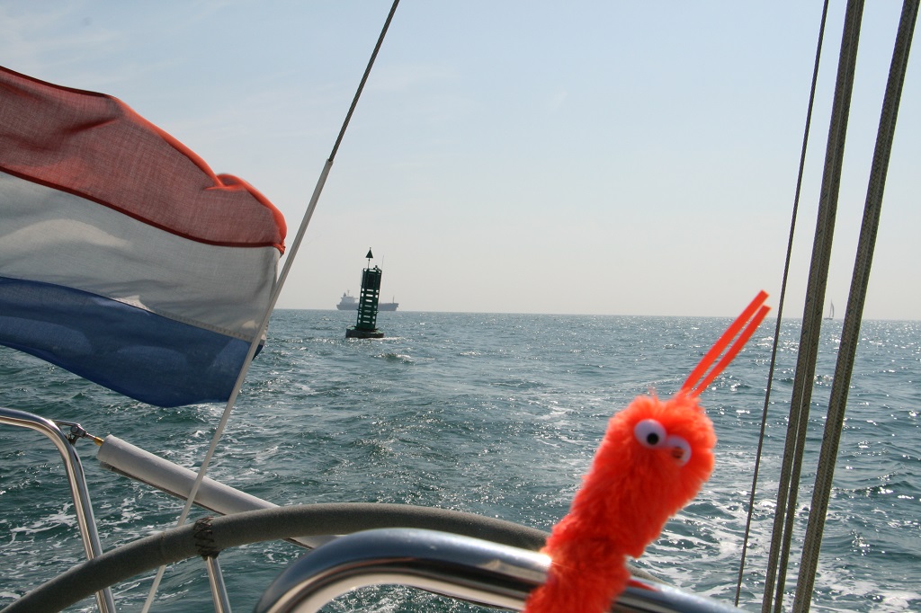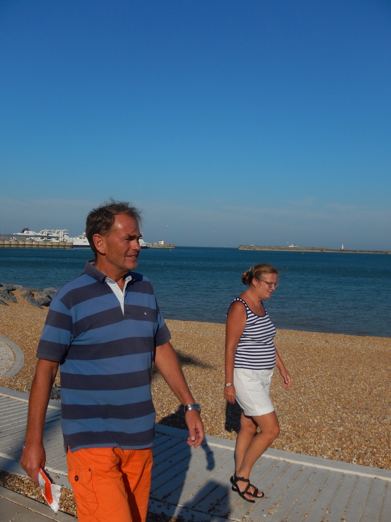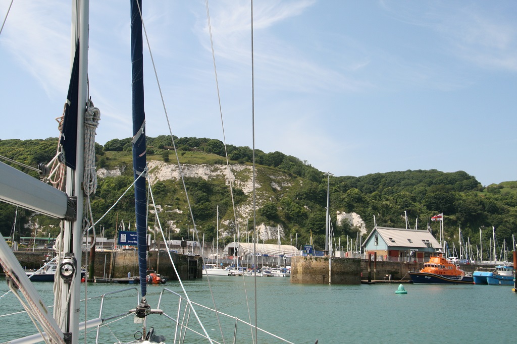 Mark wordt gemist om onze vertrektijd te berekenen. Na zoveel jaren doet Ruud het deze keer. Het wekkertje ging om 3:30 uur af, want we wilden om 4:00 uur op zee zijn om vol de stroom mee te krijgen tot de shipping lane. Marianne mag nog een paar uurtjes blijven liggen. Het is nog donker en we varen bij de lichtjes op zee en de kaartplotter. Warme kleren aan, maar echt koud is het niet met 19 graden. We hebben geprobeerd om het grootzeil bij te zetten om te motorsailen, maar er stond te weinig wind. De koers was uitgezet en Daniel kroop terug zijn bed in, nadat hij nog naar wat sterren had gekeken. Al gauw een mooie zonsopgang en Oostende en Nieuwpoort schuiven voorbij. Om 8:30 passeerde we Duinkerke en was iedereen wakker voor een ontbijtje. Marianne komt brak haar bedje uit en heeft een zeeziektetabletje nodig. Die heeft weer tot gevolg dat ze net zo snel weer onderuit zakt en verder dut op de bank. Op een hobbelig zee-tje gaan we nu op het fok richting de shipping lane, waar we om 12:00 uur aankwamen en om 13:30 uur zetten we de koers uit naar Dover. Marianne knapt weer wat op. Daniel en Ruud houden om de beurt de wacht. Het is iets koeler dan gisteren door de wind die nu zijwaarts komt. Lange broeken blijven aan. De golven komen ook zijwaarts en de boot rolt wat. We kunnen nu wel zeilen met de motor bij. In de shipping lane was het erg rustig met vrachtvaart en ferryschepen, dus weinig uitwijken. Om 15:00 uur precies lagen we in een box van Granville Marina, nadat we de boot afgespoten hadden, gingen we wat slenteren door Dover en naar de Wetherspoon Pub voor een Engels biertje en lekkere spareribs. Aan boord nog wat internet en de site bijwerken en natuurlijk de route voor morgen plannen.