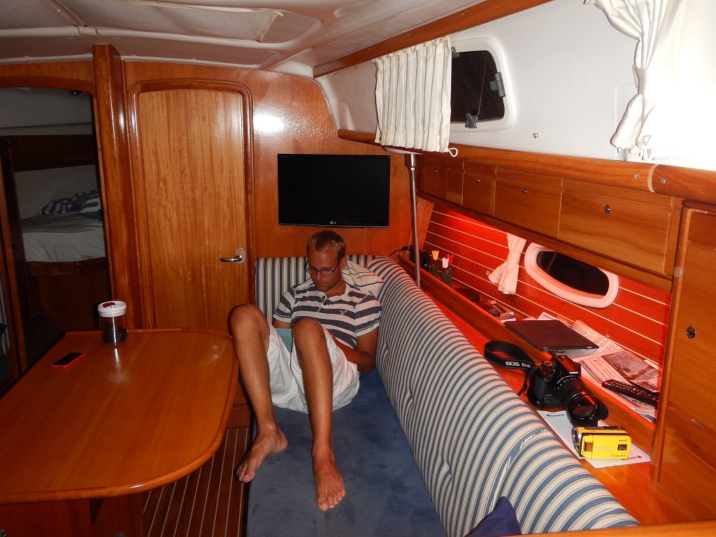 Allemaal helemaal schoon, gezond ontbijtje met fruit, kwark, Griekse yoghurt en voor de liefhebber van iets minder gezond stokbrood. Het weerbericht hebben we bekeken. We zijn klaar voor vertrek. Met halve wind varen we met bijna 7 knopen tegen de stroom in richting Portsmouth. De 7 knopen werden al snel 8 knopen, maar toen kakte de wind helemaal in en hebben we de fok ingehaald en de motor aan. De 8 knopen bleven behouden, maar wel met de motor aan. Het binnenvaren van de Solent is toch elke keer mooi, de Spinakertower, de Hovercrafts en alle ferryships en op neer naar Haslermarina met 3 knopen stroom tegen. Met de jongens de verplichtingen afgehandeld bij het havenkantoor en door gewandeld naar een supermarkt voor wat bananen, die we vanavond gaan gebruiken bij de pannenkoeken. Ook nog even langs de “Abu Dhabi” een van de nieuwe Volvo Ocean Race boten. Terug aan boord waren de dames aardig teut 😉 van de Sangria. Wij namen ook nog een drankje en zijn toen begonnen met het bakken van de pannenkoeken. We wilde nog een Mc Flurry gaan halen, maar we konden geen Boe of Bah meer zeggen. In de avond kwam Mark met Sue langs een Engelse kennis van Marion die ze had ontmoet op de Baltic cruise. Daarmee gezellig wat zitten kletsen en bootbelevenissen uitgewisseld. Morgen shopping day in Gunwharf Quays.