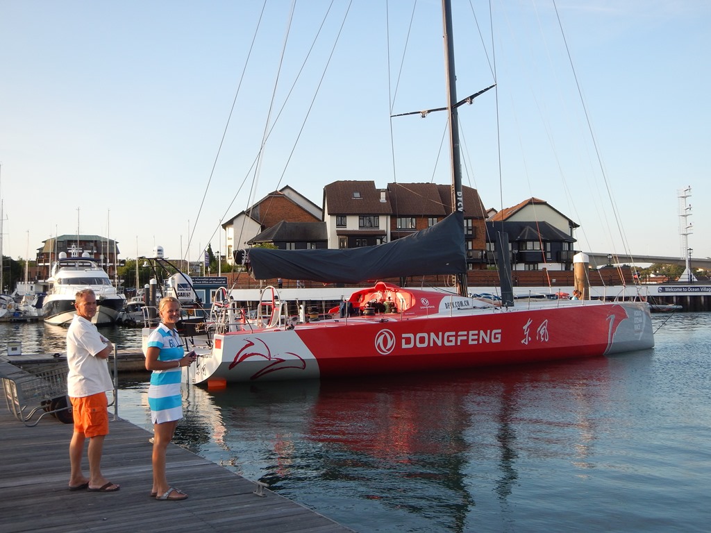 Pfff, weer een verhaal beginnen met die broodjes en douches, nou dat is achter de rug. 8:00 uur zijn we vertrokken met een beetje stroom tegen. Fokje uit en met 7 knopen richting de Needles met een lekker zonnetje in de kuip. We varen nu 3 mijl voor de Needles over Dolphin Sand en Dolphin Bank, maar de Dolfijnen laten zich dit jaar niet veel zien, behalve één klein ruggetje een weekje geleden. We hebben onze verste bestemming verlaten en zijn dan ook officieel met de terugreis begonnen, maar we hebben nog 2 weken voordat we aanmeren in Port Zelande. We gaan nog 3 nieuwe havens bezoeken, Chichester, Ramsgate en natuurlijk Londen. Bij de Needles hadden we de stroom vol mee en vlogen met 9 knopen door het water met als top 10.4 knoop. De 40 mijl hebben dan ook in een recordtijd van iets meer dan 5 ½ uur afgelegd over een drukke Solent, met veel zeilwedstrijden die tijdens de Cowesweek worden gehouden. We waren druk aan het fotograferen, toen ook de Dongfeng ons weer passeerde. Deze Volvo Ocean Race boot waren we al eerder tegen gekomen, maar nu was het heel dichtbij. Wat een boot en wat een snelheid. Vlak bij de haven van Southampton zagen we al hele hoge masten, dus waren we benieuwd welke boten er deze keer lagen. Nou dat viel niet tegen. Een hele nieuwe grote catamaran, de Leopard, een 100 voet zeiljacht met een mast van 50 meter hoog, de Daling een ruim 80 voet Oyster zeiljacht, een oude Volvo 70 en ’s avonds lag daar ook nog de Dongfeng, die we nu van héél dichtbij konden bekijken. De boot hebben we snel afgesloten en we zijn weer gaan winkelen. Mark wilde weer naar de Primark, wat na de Lidl z’n favoriete winkel aan het worden is. Toen we genoeg van het winkelen hadden, zijn we op zoek gegaan naar de Fridays om lekkere Spareribs te gaan eten. Het was even zoeken en nadat we de Toys R’us hadden bezocht (het blijven kinderen) waren we vrij snel bij de Fridays. We begonnen met wat kleine hapjes als vooraf en een drankje en toen begon het grote werk. We kozen allemaal voor een Ultimate full rack of ribs double glaze with Jack Daniel’s sauce, Marion had het als eerste op? En Marianne verdeelde die van haar met ons. Er was dan ook geen ruimte meer voor toetjes. Via de steigers in de haven zijn we langs alle grote boten in de haven gelopen en hebben daarna lekker zitten relaxen op ons Super Jacht.