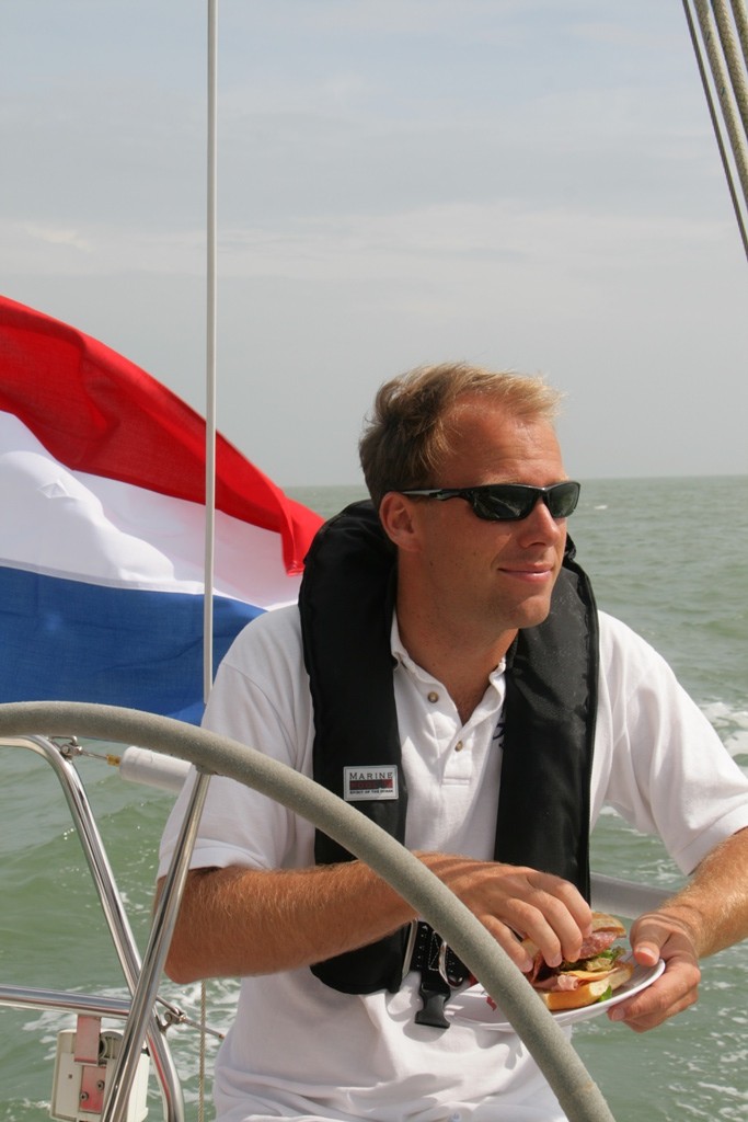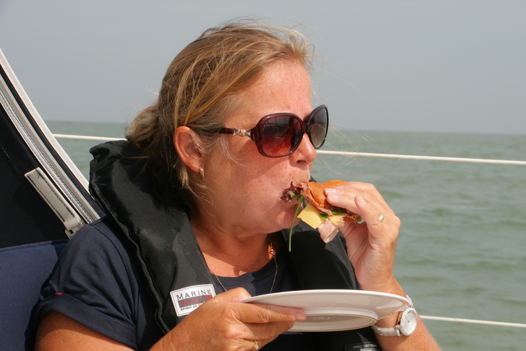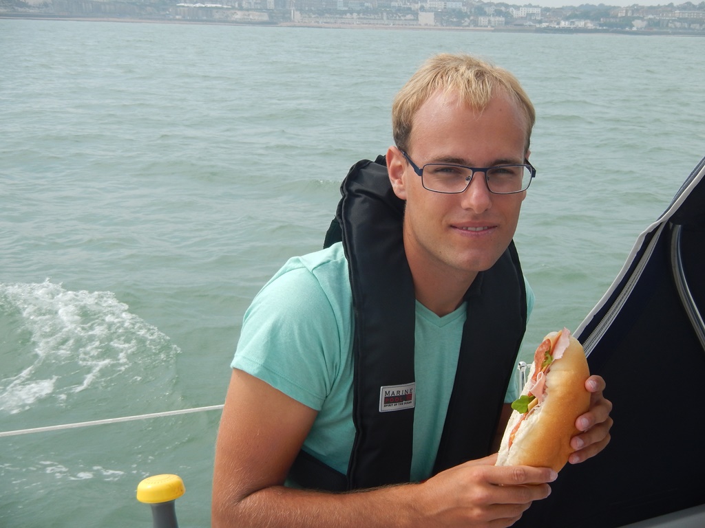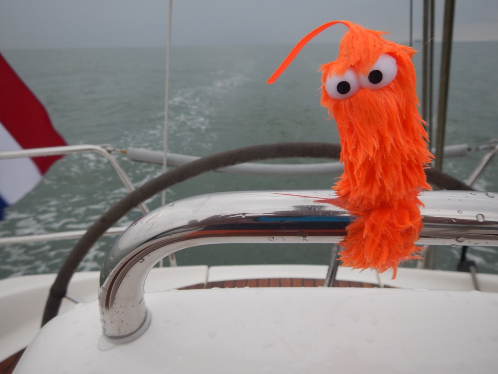 De crew mocht weer eens uitslapen. Toen ik terug kwam met de boodschappen zat iedereen hongerig te wachten op al dat lekkers. We hadden een rustige ochtend en voormiddag. We vertrekken rond 14:30 uur. Mark en Marion gingen hun treinticket regelen om vanaf Londen Towerbridge naar Londen Gatwick te reizen en wij gingen naar het centrum waar vanmorgen de markt werd opgebouwd voor wat fruit. We kwamen terug met bijna 2 kilo grote diep paarse kersen die in no time waren opgevreten. De pruimen zijn nog een beetje hard, maar die gaan snel hetzelfde lot. Rond 14:00 uur waren Mark en Marion suksesvol terug van hun ticketavontuur en hebben we de Just vaarklaar gemaakt. Buiten de havenpieren hadden we een ruw zeetje verwacht, maar het was bijna spiegelglad. Iedereen had snel z’n plekje gevonden en het maagje van Daniel begon te rommelen. Ik had hele grote zachte puntjes gekocht en hij wilde wel een broodje in de SubWay style. Het ruim gelegde broodje werd met jaloerse blikken bekeken en al snel volgden de bestellingen. Marianne, Mark en Marion wilden dat ook wel. SubWay was snel door z’n broodjes heen en werd gesloten. We draaiden niet veel later het Queens Channel op, we varen op naar Londen. Ja, en wat kwamen we allemaal tegen. Zeehondjes die lekker liggen te zonnen op een zandbank, een groot windmolenpark en de Maunsell-forten. Wij vaarden vlak langs de Red Sand Towers. Deze forten vormden in de tweede wereld oorlog de verdediging van het luchtruim in de Theemsmonding. Nu lijken ze meer weggelopen uit een Star Wars film of War of the Worlds, heel apart. In plaats van chips hebben we de zak kruidnootjes open getrokken waar vooral Marion niet van af kon blijven. Deze dag varen we tot halverwege en daarom slaan we een zijriviertje van de Theems in. Naar Queenborough waar speciaal voor Londengangers moorings zijn geplaatst om te overnachten of te wachten voor een gunstiger tij. In dat riviertje hebben we de voorbereiding gedaan voor het avondmaal spaghetti met een sausje en sla en komkommer. Wat precies klaar was toen we aan hadden gelegen aan de mooring. Tijdens het eten waren er ook anderen die trek kregen, muggen! Wij de luiken dicht en zeker 10 muggen platgeslagen. De wind begon toe te nemen en gierde aardig door de mast met de regen erbij en een bijna volledig afgesloten boot wordt het een lekker nachtje.