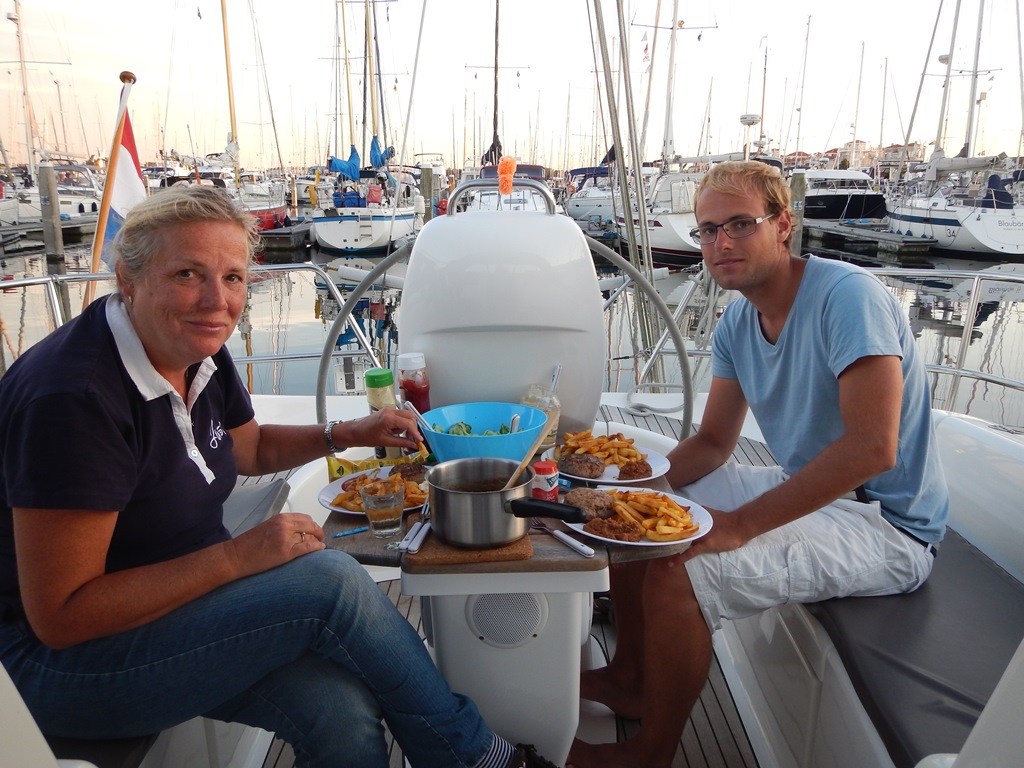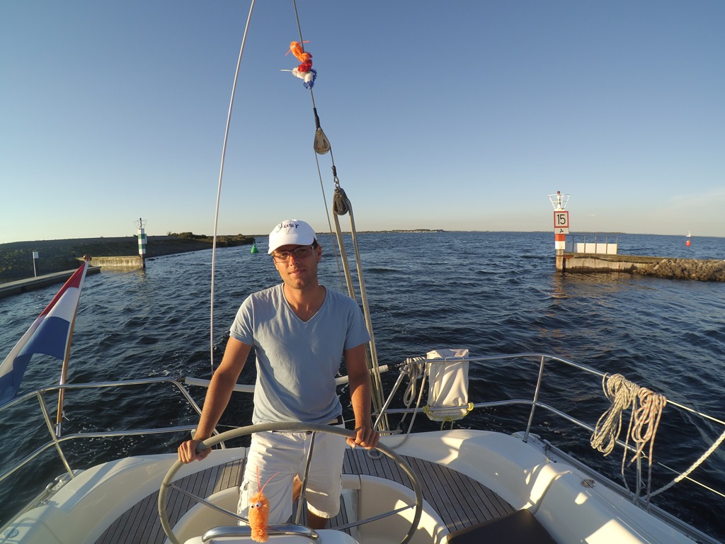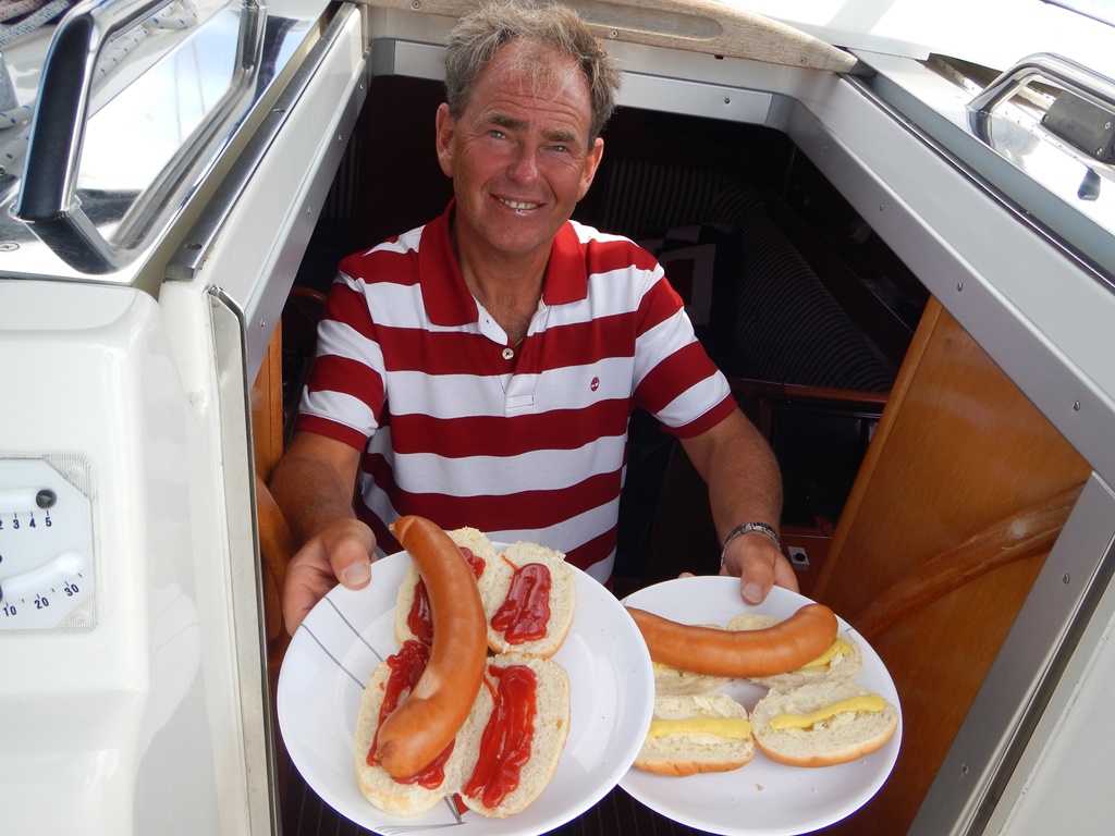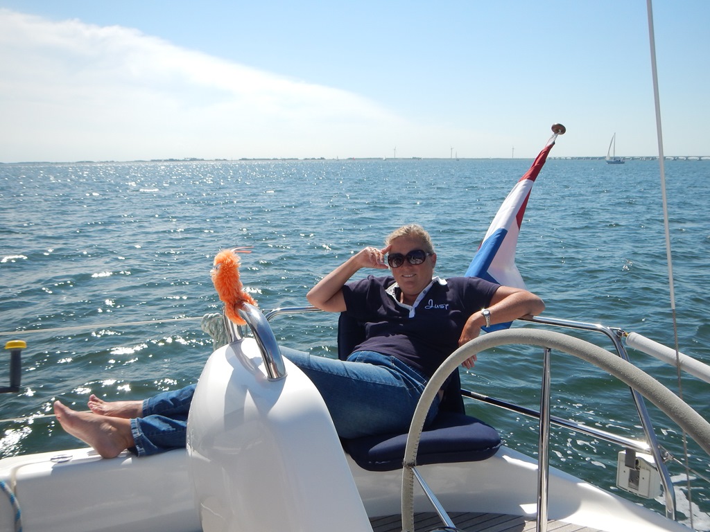 Dat was een kort nachtje, het wekkertje ging al weer. 6:00 uur opstaan voor de laatste etappe naar de thuishaven. We hadden een mooi koersje in gedachten, maar ook nu weer vol wind tegen. We hebben geen zin om op te kruizen en de dieseltank is vol, gas erop. Bij het ronden van de kaap van Walcheren hebben we de fok uitgedraaid en met nog een klein beetje stroom mee zeilen we richting Roompotsluis. Precies om 12:00 uur kwamen we daar aan. We moesten lang wachten, ruim 3 kwartier. Lunchtijd de grote 250 gram per stuk wegende knakworstjes staan op het vuur, die zo lekker op een broodje gaan. Bij de Zeelandbrug kwamen we mooi op tijd aan en we dobberen nu met 4 knopen naar het laatste obstakel: de sluis van Bruinisse. En het was weer een zooitje. Voordringende bootjes, stewards die nog nooit gevaren hebben, die verkeerde aanwijzingen geven, dwarsliggende bootjes. Het wordt tijd voor volgnummers uitgeven op volgorde, maar wij zijn er zonder kleerscheuren uitgekomen. Nu nog 2 uurtjes naar de haven. Nog iets bedenken wat we gaan eten, want we kunnen geen restaurant meer zien. En de voorraadbank zit nog aardig vol. De jaarlijkse zak kruidnootjes is nog dicht, alle blikken babi pangang, noedelsoepjes, pastijtjes, pakken pure hagelslag en veel chips en nootjes. We hebben voldoende voorraad voor nog 3 ½ week vakantie. Ja, we hebben wel gemerkt dat Mark en Marion er dit jaar niet bij waren. Morgen gaan we de Just schoonmaken en vaarklaar maken voor de weekeinden. Wij kijken terug op een geslaagde vakantie. Niet volgens de planning, maar wij hebben geen 1 dag verwaaid gelegen en elke dag een leuke invulling kunnen geven.