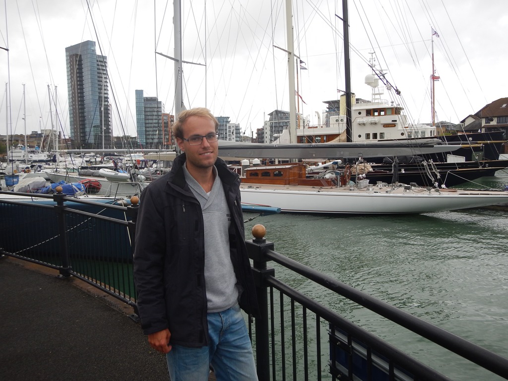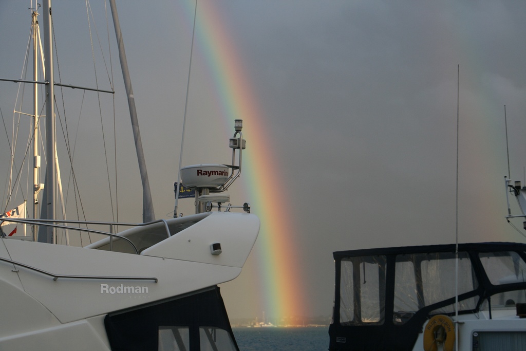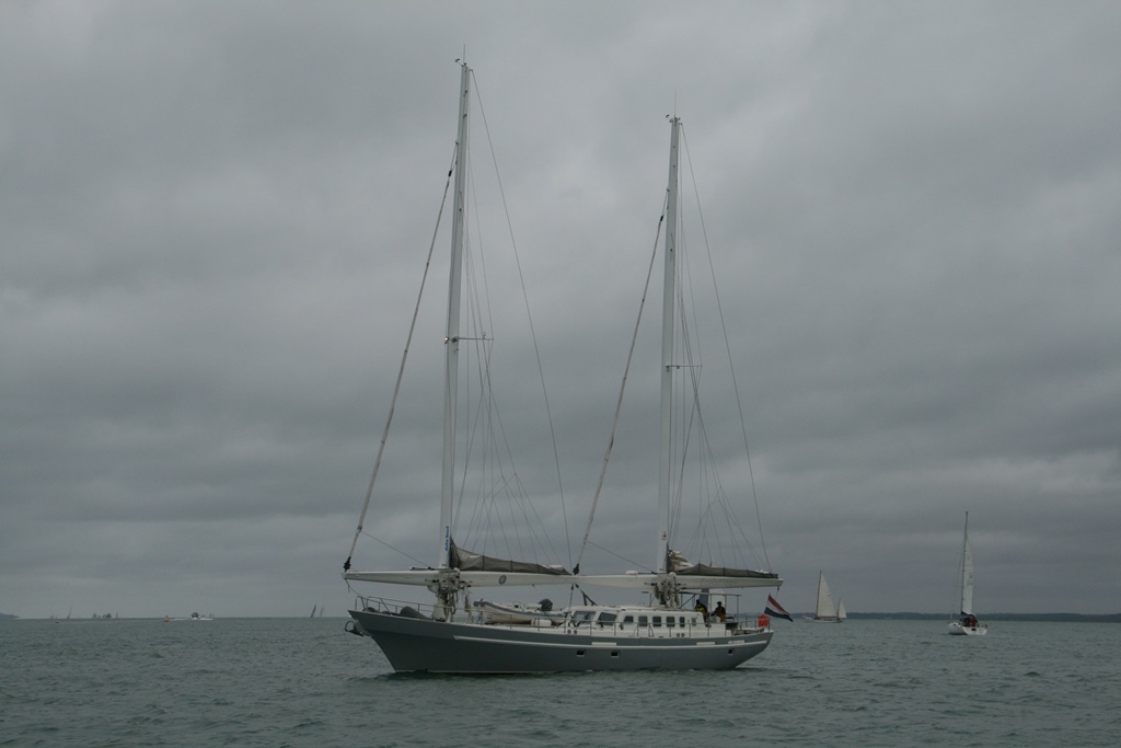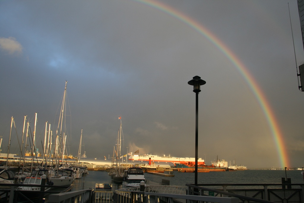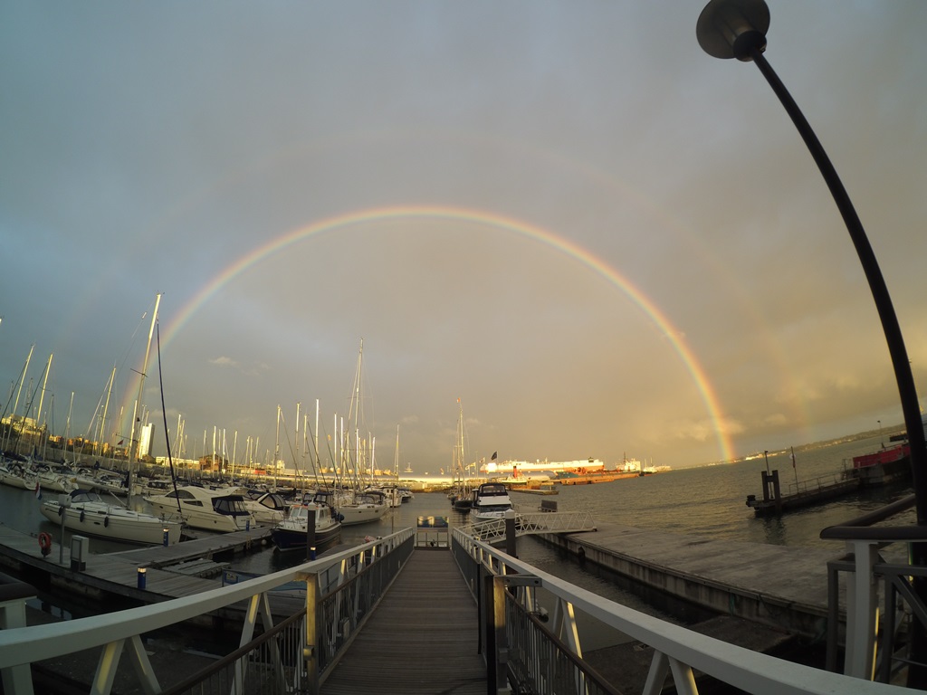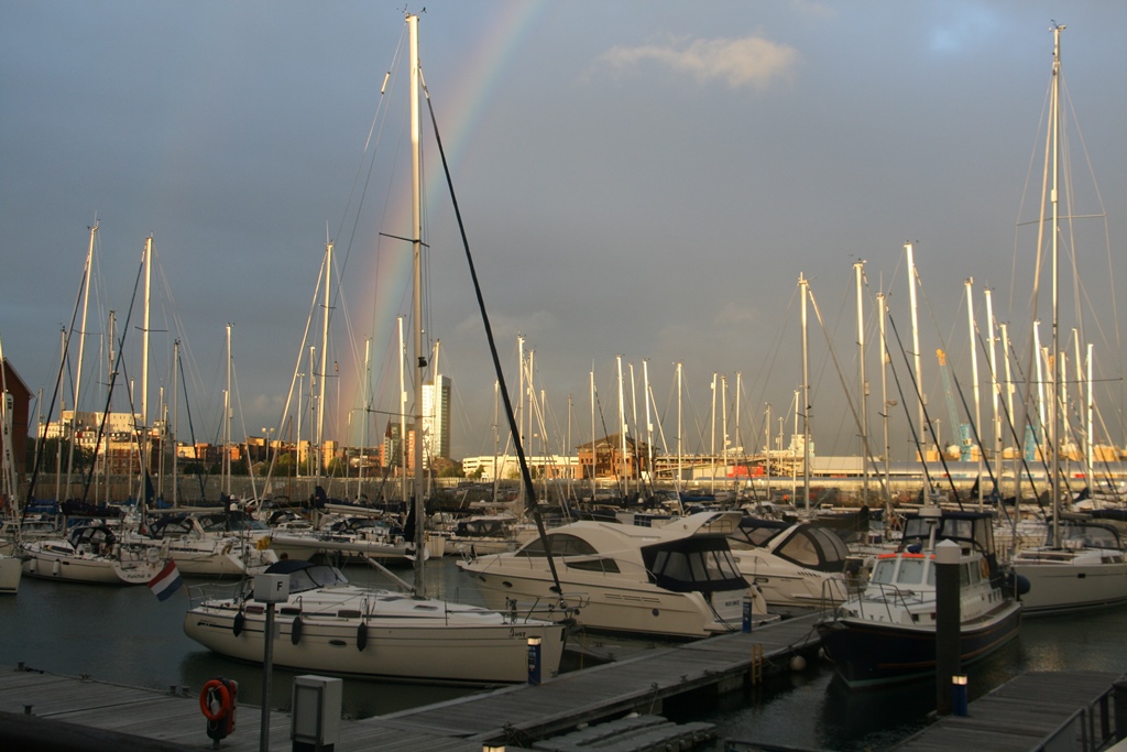 Zo dat is gezellig wakker worden op zondagochtend. De regen zachtjes tikkend op het zolderraam euh… op het dek, beetje krantje lezen, wie wil uitslapen doet dat en tijdens het ontbijt een zacht gekookt eitje. Volgens een soort buienradar ging het om 11:00 ophouden met regenen. We hebben onze zeilpakken voor de zekerheid maar aangetrokken en zijn een half uurtje later uitgevaren. We hadden nog hoop dat we een J-Classe boot zouden passeren, maar helaas die waren aan de horizon verdwenen. Wel andere mooie grote zeilschepen, waaronder ook de Ecolution, het zeilschip wat van Wubbo Ockels is geweest. Halverwege onze trip begon het weer te miezeren, wat langzaam overging in steeds dikkere druppels. Na het passeren van het cruiseschip de Queen Elisabeth konden we onze haven indraaien. We hadden een mooi beschut plekje in de voor ons nieuwe haven. Normaal hebben we een andere haven in Southampton, waar de mooiste jachten afmeren. Maar deze is met 50% korting en dat scheelt toch snel 25 euro. Het werd toch nog droog en via internet hadden we ook een top pizzeria gevonden. Maar eerst even de benen strekken. Via de 15e eeuwse city wall zijn we in de hoofdstraat beland. We hebben een beetje lopen winkelen en op zoek gegaan naar Casanova, de beste Italiaan in Southampton. De klandizie viel een beetje tegen, 1 tafeltje bezet, maar het was dan ook pas 17.15 uur, terwijl wij toch nog een beetje Nederlandse tijd voelen in onze maagjes. Maar we kregen heerlijke voorgerechtjes voorgeschoteld en prima pizza’s. Voor een toetje was echt geen ruimte meer. Even voordat wij wilden opstappen kwam er toch nog een stel binnen, misschien is het in Southampton niet gebruikelijk om op zondag te gaan uit eten. We wandelden terug via de haven, waar we vorige jaren lagen. Natuurlijk hebben we even wat foto’s van de 3 J’s gemaakt, die daar waren. De Lionheart, Velsheda en de Ranger lagen gezamenlijk naast elkaar. Deze oudjes deden niet onder voor de Leopard, een moderne, bijna even groot race monster. Aan boord hebben we de was uitgezocht. Er is hier een mooie laundery en de waszak puilde uit. Als licht verteerbaar toetje kregen we een volledige, hele brede regenboog. Zo mooi had ik het nog nooit gezien.