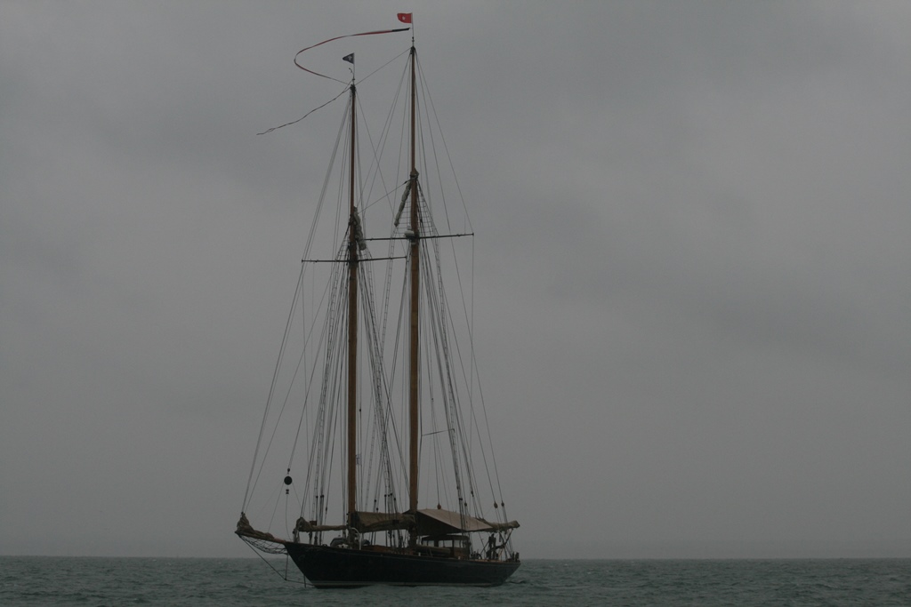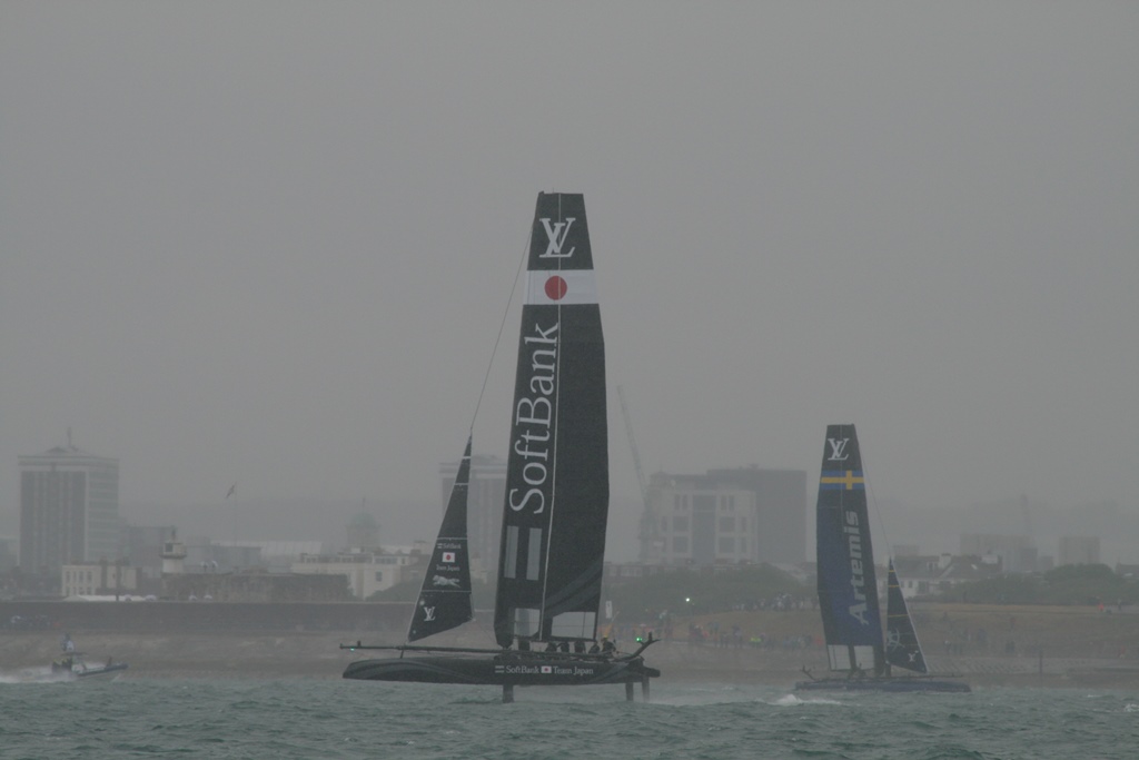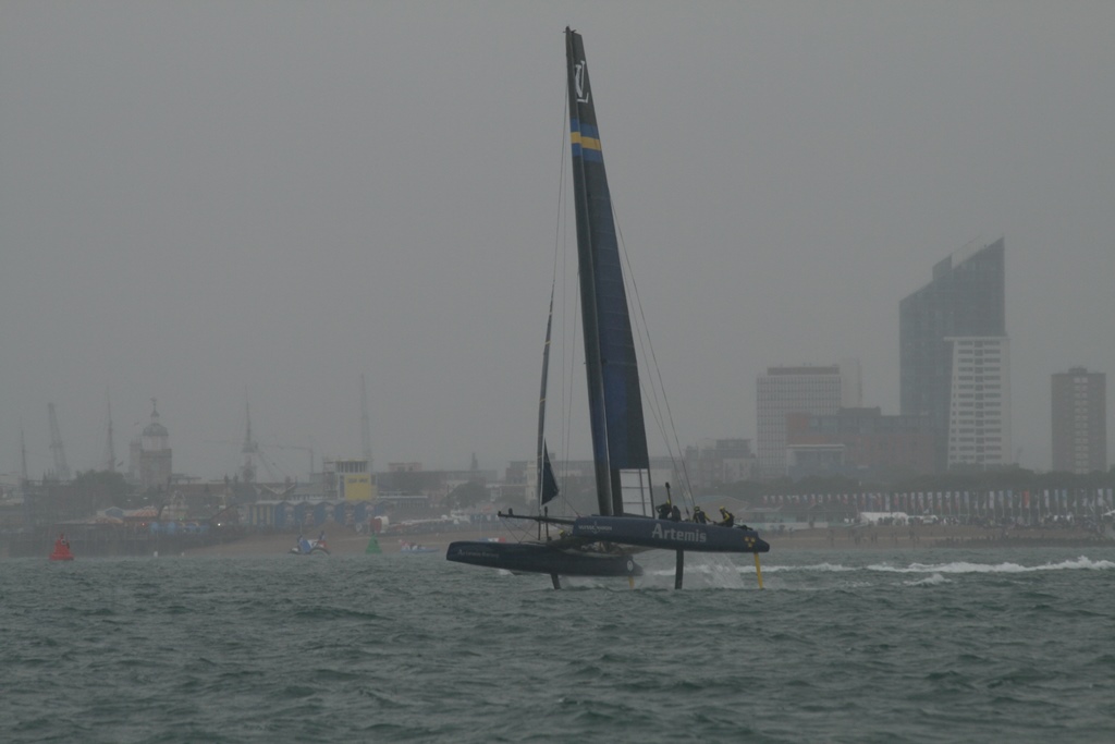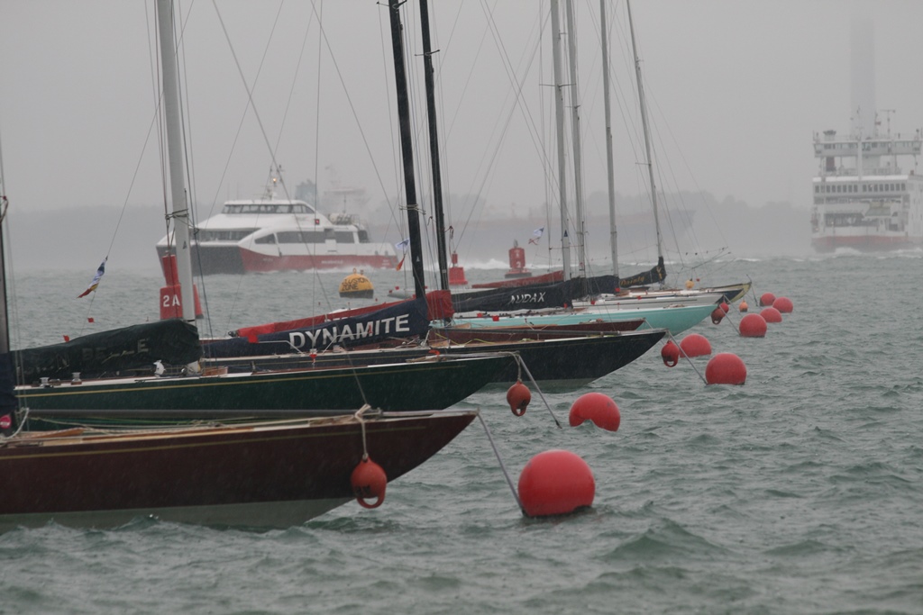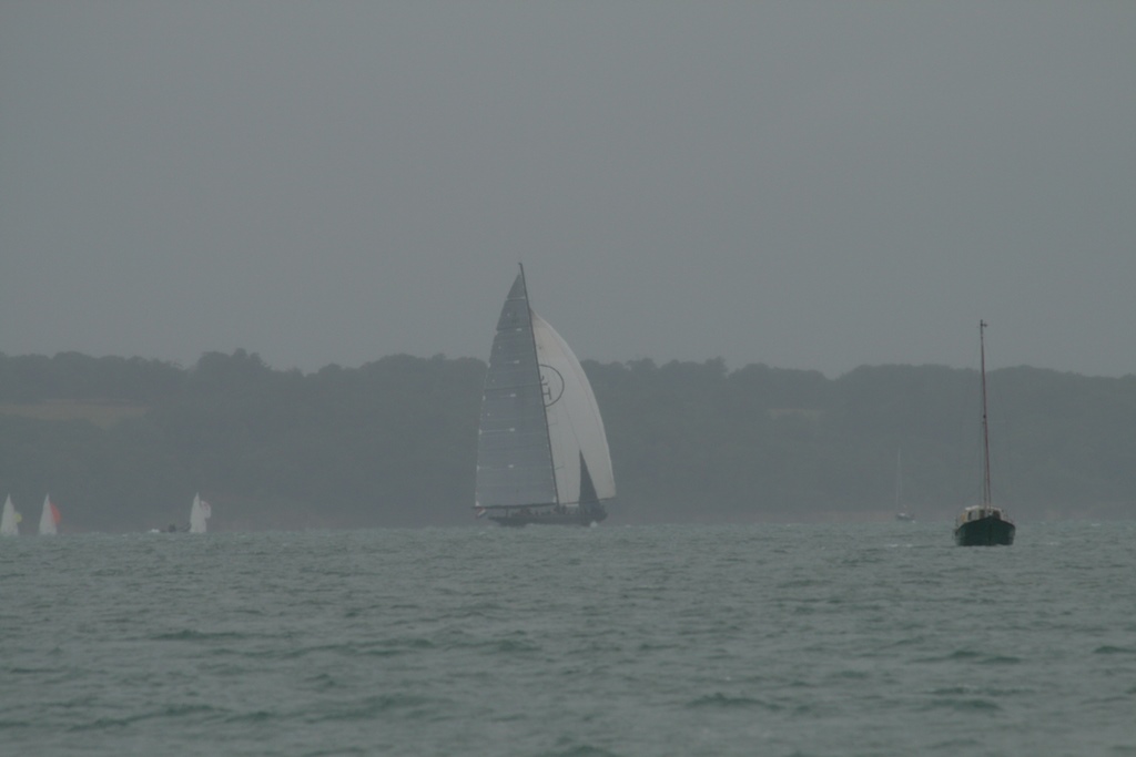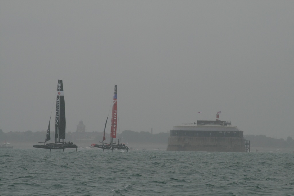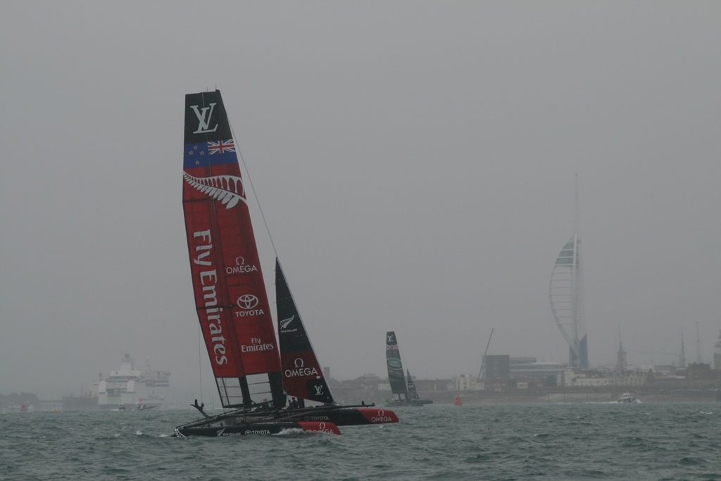 @%*&^(@#$ Wat een takkeweer, het begon al in de nacht te miezeren. In de ochtend was het weer droog, maar net voor we wilden vertrekken begon het langzaam te druppelen. Zeilkleding aan en een extra poncho daar overheen. Op naar Portsmouth voor de Red Arrows en de races van de America’s Cup. Wij waren op tijd vertrokken en zijn nog iets omgedraaid omdat er een mooie J-Classe onze richting opkwam. Maar helaas hij ging overstag en hees z’n spinnaker en stoof weer van ons af. Onze koers hebben we weer verlegd en we waren ruim op tijd voor de airshow. Daniel had al op twitter gelezen dat ze waren opgestegen en onderweg waren. Maar 12:10uur geen Red Arrows, 12:20uur nog steeds niet, twitter maar weer bekeken en daar stond helaas de airdisplay kan geen doorgang vinden door het slechte weer. Dat is een tegenvaller, dan maar nog een uurtje ronddobberen voordat de race begint. De eerste catamarans kwamen al aan. 13:20 was de eerste start, waar we een mooi uitzicht op hadden. Direct na de start zijn we met de race opgevaren (er was iets snelheid verschil) waarvan Daniel veel foto’s heeft gemaakt. De regendruppels werden dikker en wij zetten koers uit naar Cowes. Zeiknat kwamen we daar aan en hadden nog net één van de laatste plekjes. Snel onze natte zeilpakken uit en lekker onderuit. Was een beetje nutteloze dag, geen J-Classe boot van dichtbij gezien, geen Red Arrows, maar wel de America’s Cup Race van dichtbij meegemaakt en we hebben een 6 uur lange douche gehad. Ach, het kan niet altijd meezitten.