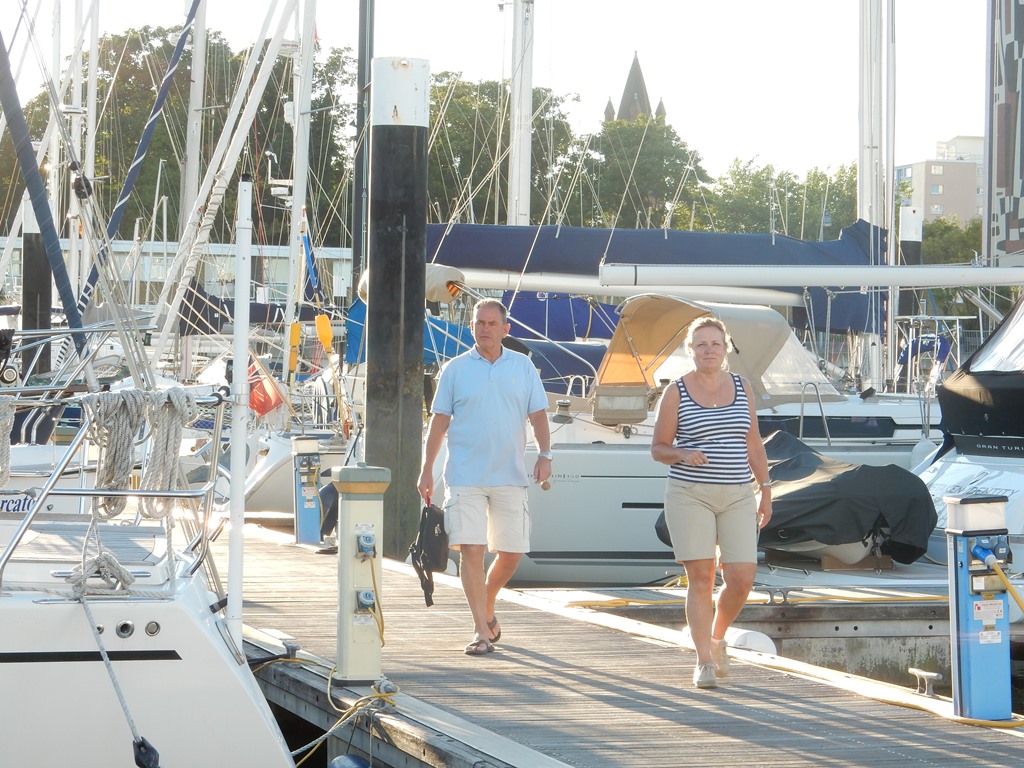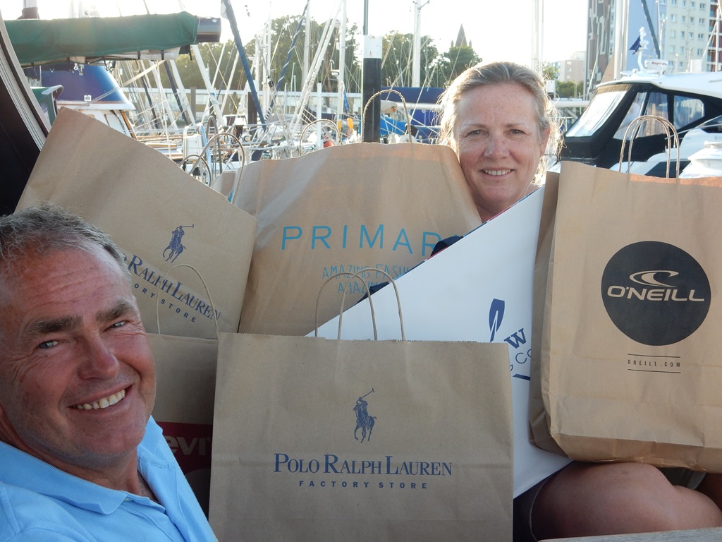 Een lekker vers stokbroodje bij een uitgebreid ontbijtje. Vandaag varen we niet. Het is shopping day in Portsmouth. Lui ochtendje, we willen uitgerust aan onze shop experience beginnen. Even na het middaguur gingen we met het pontje van Gosport naar de overkant. We zijn al vaker hier geweest, maar altijd direct naar Gunwharf en ook hebben we weleens langs de seafront gewandeld. Maar nog nooit het centrum bezocht. We liepen langs veel authentieke Engelse pubs en moderne flats. Het centrum was bijna een kopie van Southampton. Om half 3 hadden we zoiets van we willen ook nog naar de Wharf. Bij de universiteit was het Bull day. Er liepen veel Batman, Superman en Zorro capejes rond. Bij de Wharf was het even wennen, want we kwamen nu anders binnen dan normaal. Snel onze oude route oppikken en via Gant, Timberland, Ralph Lauren, O’Neil, Levi’s, CrewClothing en veel tassen later belandden we bij de Water Margin voor een buffet. Het pontje bracht ons weer terug bij de haven, waar we lekker onderuit gingen en onze planning door namen. Wat gaan we doen Poole, Southampton, Kanaal eilanden of toch de start meemaken van de Louis Vuitton Cup met als opening de Red Arrows? We denken er nog even over na.
