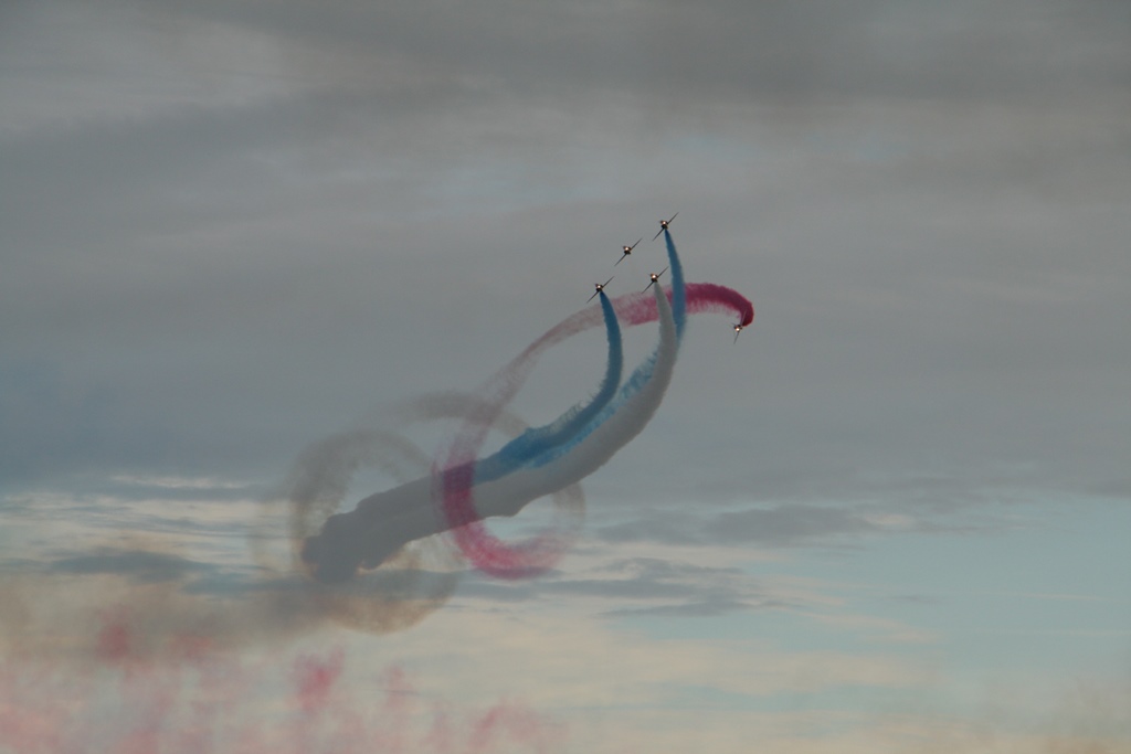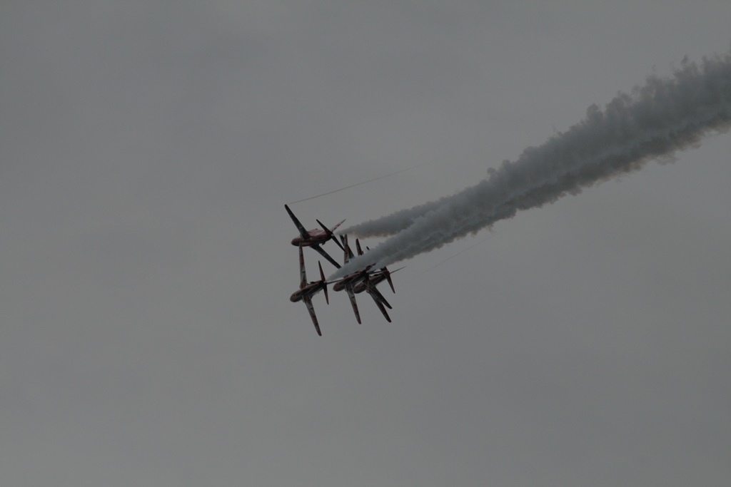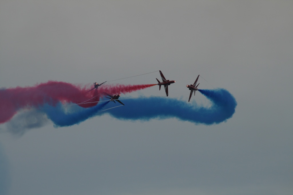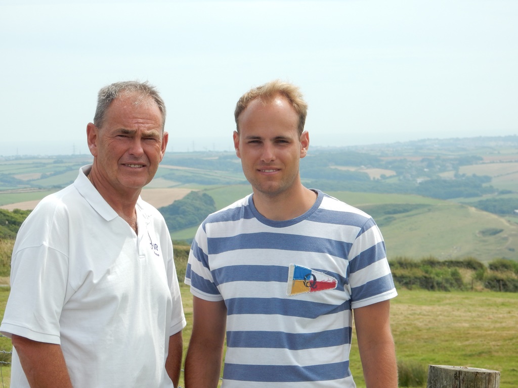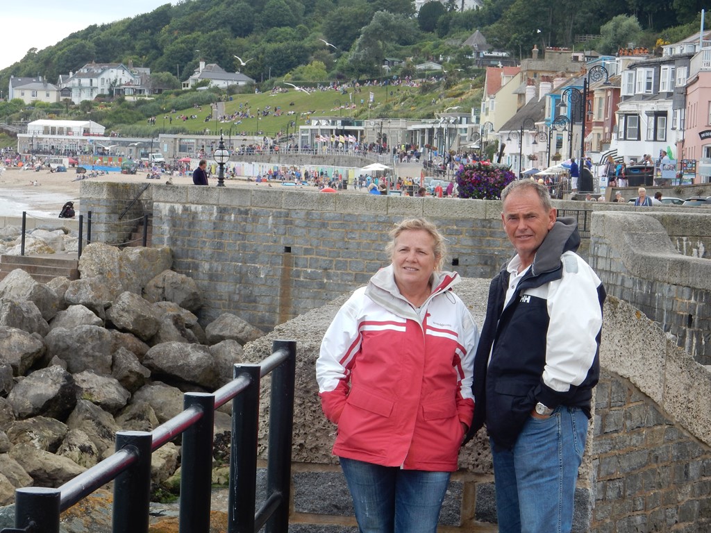 Na de brug meerden we af in een box, snel wat broodjes halen en ontbijten. Met Daniel ging ik de huurauto ophalen. We hadden een Opel Corsa gereserveerd maar kregen een Opel Astra Coupe GTC, prima karretje. Nu nog proberen aan de juiste kant van de weg te blijven en dat heel de dag vol houden. Met volle tassen vertrokken we uit de haven, een picknicktas, een strandtas, een fotorugzak, een geldzak en een slechtweertas. Gelukkig hadden we een grote kofferbak. Ons eerste doel was een wandeling bij The Fleet en de Jurassic Coast. Een mooi natuurgebied. We reden langs de Park And Ride waar we zouden parkeren om de Red Arrows te gaan kijken. We hebben daar op de kaart gekeken wat we zouden doen en besloten om maar gelijk te parkeren en op die heuvel te picknicken op z’n Engels. We namen de Ride naar Lyme Regis, wat een verrassend leuke badplaats bleek te zijn. Gezellige boulevard, droog vallende haven, authentieke winkeltjes, op z’n Engels Bowlende oude dametjes en een hele mooie track langs een Footpad. Na een terrasje namen we plaats op het kiezelstrand, waar we eerste klas zaten voor de spectaculaire The Red Arrows Airshow. Super gaaf. Met het busje terug naar de parkeerplaats en daar gekeken waar we nog heen konden rijden. 2 opties waren te ver: Stonehenge en Darthmoor. Maar als 3e mogelijkheid hadden we een mooi fabuleuse landschap. Tenminste, er stond area of outstanding natural beauty op de website. Nou het enige wat we gezien hadden waren een paar koeien en voor de rest ruim 10 kilometer of miles een zeer smalle weg ter breedte van 1 auto met aan weerszijde een hoge heg van ruim 2 meter. De takjes schuurden af en toe langs de auto en dat lag niet aan m’n rijstijl. Achter de heg was het inderdaad een mooi landschap, maar we hebben er erg weinig van kunnen zien. Na dit avontuur zijn we richting Weymouth gereden door een zeer heuvelachtig en steeds donker wordend landschap en dat op weggetjes waar je als nette Hollander niet harder zou mogen rijden dan 50 Km. Hier mochten wij 60mile rijden. Niet normaal, maar we zijn schadevrij bij de haven aangekomen. Marianne en Daniel namen nog een ragoutje en ik zette alle filmpjes en foto’s op de laptop, die we nadien nog even bekeken hebben. Ik redde dat niet en zocht m’n slaapplekje op.