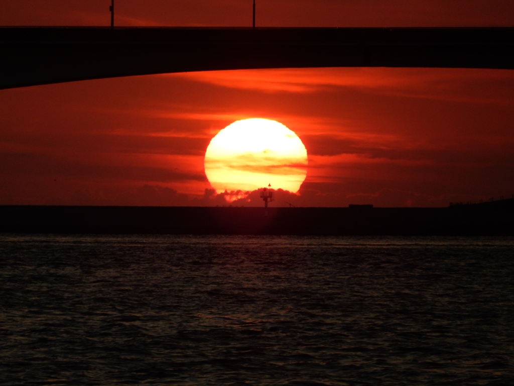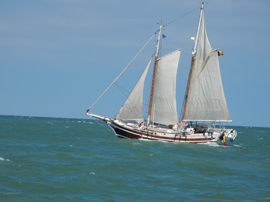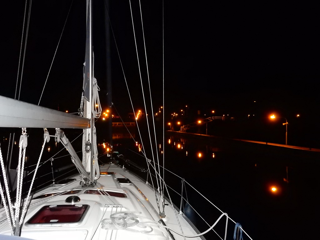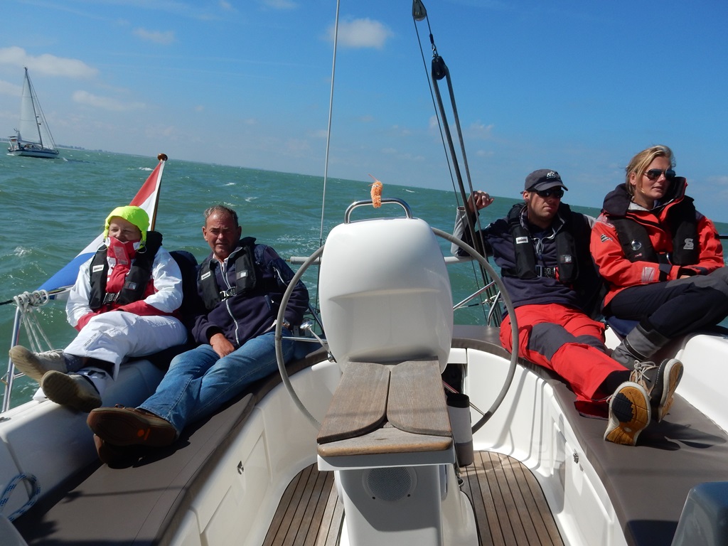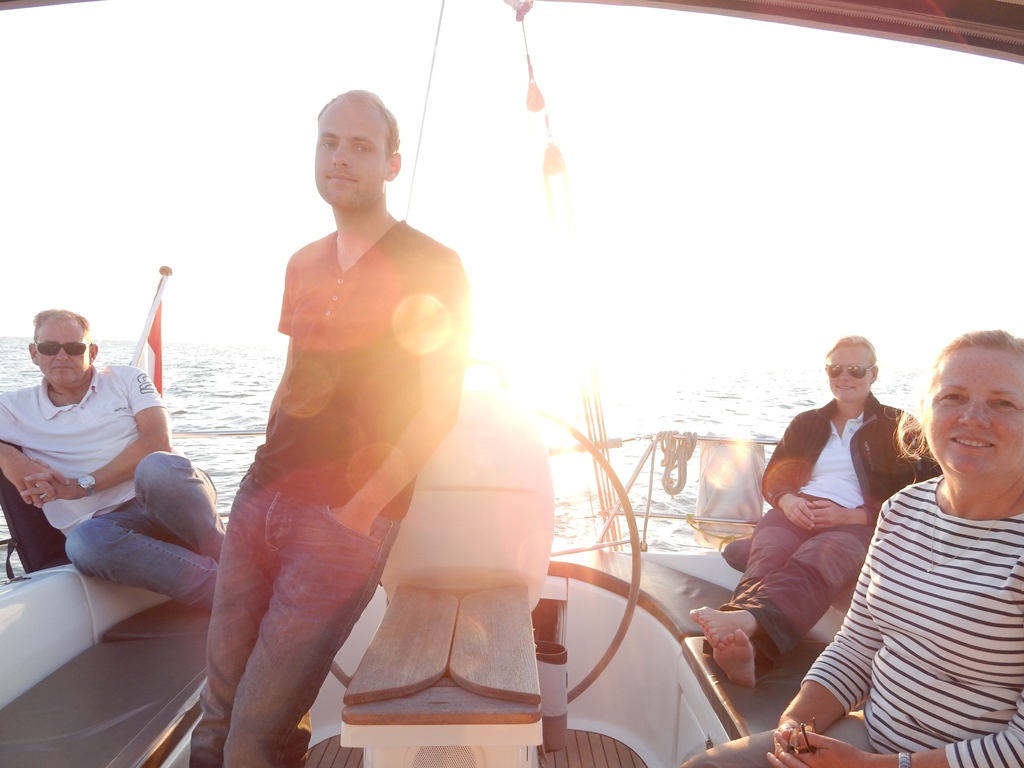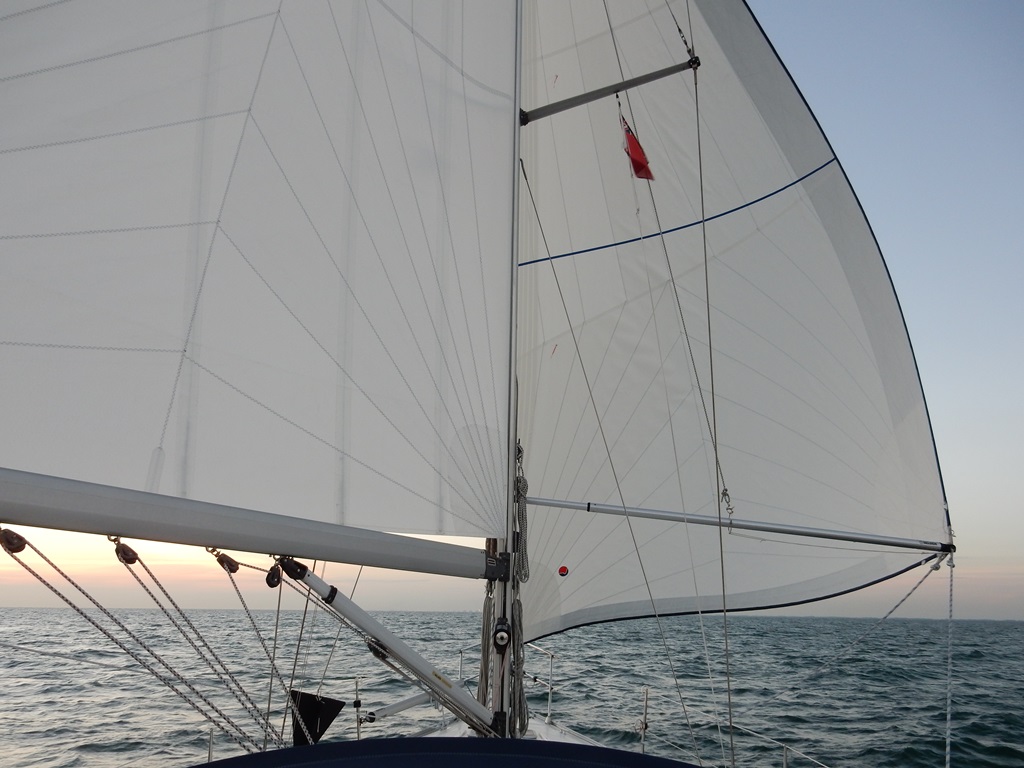Maar weer eens vroeg op. 01:15 ging het wekkertje en een half uurtje later gooiden we de landvasten los. Marianne regelde weer de communicatie met Dover Port Control en we mochten langs de breaker pier naar de East uitgang. De eerste paar mijl was het een woelig zeetje. Maar dan werd het al snel iets minder. We zagen een zeilbootje onze kant opkomen met een AIS track van een Drunken Sailor. Dat was ook opgemerkt door een Ferryboot, die een felle schijnwerper in onze beide zeilen scheen. De drunken sailor verlegde z’n koers en wij gingen sterren kijkend de shipping lane in. Mark loodste ons vanaf de laptop door de shipping lane en Daniel hield toezicht vanuit de kuip. Het was vrij rustig en Daniel ging languit sterren kijken en kneep af en toe een oogje toe. Mark hield het voor gezien na de Shipping lane en Marianne kwam aan dek een uurtje later gevolgd door Marion. Daniel vertrouwde ons ook de Just toe en ging nu lekker languit in z’n hut. Met de dames hebben we tot Duinkerken gevaren. Daarna gingen de broodjes de oven in. We hadden een heerlijk koersje met wel veel stroom tegen. Om dat de compenseren zorgde de motor voor een paar extra knoopjes. Na het ontbijt hield ik het ook even voor gezien. En zo op ons gemakkie vaarden we Nieuwpoort en Oostende voorbij. Marion had contact met Albert (vader), die ons bijna heel de tocht had gevolgd. Maar hij vertelde ook dat het morgen weer flink ging waaien en dat we maar even de laatste weerberichten moeten checken. Nou dat was een tegenvaller. Vanaf 06:00 uur morgenochtend weer bijna overal tegen de 25 knopen wind. En dit nieuws kregen we een 1 uurtje voor de haven van Blankenberge. Wat doen we? De bedoeling was om morgen weer om 02:00 uur uit te varen. Nemen we dat risico of varen we nu door? De knoop is doorgehakt. Geen ijsjes in Blankenberge. Voor het eerst varen we daar aan voorbij. De doppinda’s en zakken chips worden open getrokken. En toen kwamen de verhalen, Marianne had zich zaligheid beloofd om nog een uurtje naar het strand te gaan, Marion lekker relaxte met een wijntje in de kuip van het zonnetje genieten en de mannen wilden wel 3 ijsjes nog vandaag. Maar de realiteit is, dat we inmiddels Zeebrugge voorbij zijn en dat de eindbestemming nog alle kanten op kan gaan. Ons eerste doel is de Roompotsluis. Uiteindelijk hebben we een ankerplekje ingenomen achter de Mosselbank. De 3 obstakels die we moesten nemen en die voor oponthoud konden zorgen zijn we soepel door heengevaren. De Roompotsluis ging bijna gelijk open voor ons, met nog een bootje werden we snel geschut. We zijn van zee dus de pannen gingen op het vuur. We hadden in Dover al inkopen gedaan voor een eenvoudige spaghetti maaltijd, dus die stond in no time op het tafeltje in de kuip. Met enig rekenwerk en hulp van het toerental van de motor waren we ook precies op tijd voor de opening van de Zeelandbrug. Waar we met een hele mooie zonsondergang doorheen gingen. Het was bijna windstil en we gleden de Oosterschelde op, waar de sterrenhemel zich voor de 2 maal deze dag zich openbaarde. Mars, Saturnus en Antares werden als eerste gespot en natuurlijk de Grote Beer. Rond middernacht bij de Grevelingensluis was het verrassend rustig. De sluiswachter werd door Marianne opgeroepen en nadat die voor de tweede maal werd aangeroepen, werd hij wakker en ging de sluis voor ons gereed maken. De anders zo drukke sluis hadden we voor ons alleen. Bij het uitvaren van de sluis hadden we in de boeggolf lichtgevend plankton, wat een heel speciaal effect gaf gedurende het laatste mijltje tot de Mosselbank. We hadden een stille hoop, dat we daar heel misschien een ligplaatsje konden innemen, maar alles lag al 2 of 3 dubbel. Dan maar voor anker. Omdat de wind zou gaan aantrekken namen we een plekje in de beschutting van de Mosselbank en ook daar waren we niet het enige bootje. Toen we stevig achter het anker lagen kon je door de beweging van de ankerketting en het heldere water het lichtgevende plankton weer duidelijk zien. Heel apart en leuk. Maar nu snel slapen. Het was een lange, verrassende tocht.