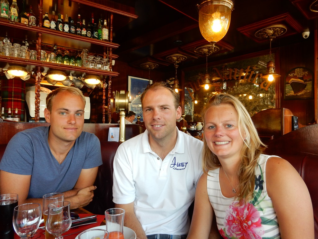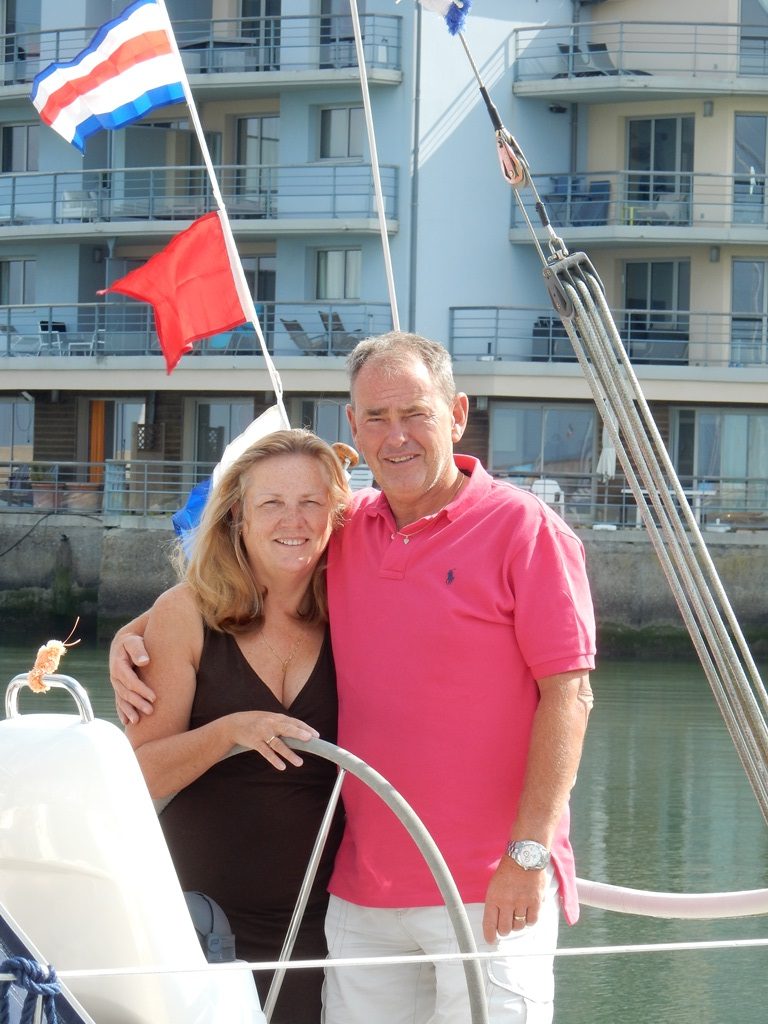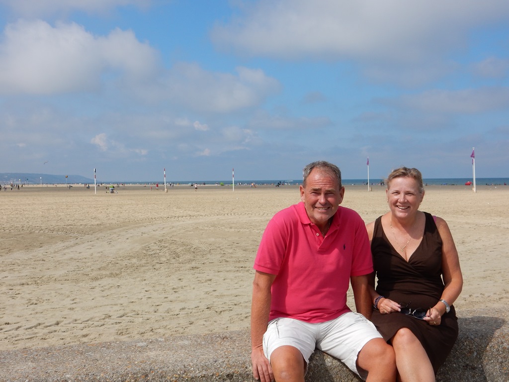 Vanmorgen vroeg de auto weer retour gebracht. Op de terugweg ging ik langs de patisserie om lekkere gebakjes uit te zoeken voor Marianne’s verjaardag. De Franse stokbroodjes en croissantjes ook meegenomen en een pain de campagne voor Daniel. Iedereen mocht vandaag z’n roes uitslapen, zodoende gingen we laat ontbijten. De boot werd feestelijk gedressed met allemaal vrolijke seinvlaggetjes. Marianne werd verwend met haar kadootjes en daarna zijn we sjiek aangekleed gaan flaneren op de braderie in Deauville. Alle toegangswegen waren afgezet met vrachtauto’s en er waren zwaarbewapende patrouilles. De mensen waren er wel relaxed onder en door het mooie weer was het druk. Bij alle standjes en restaurants hielden we stil om te kijken of er wat voor ons was. Het publiek is chique, de auto’s ook en de winkels nog chiquer. De Deauville’s kleding was ondanks de hoge kortingen nog stervens duur en ook bij de restaurantjes zagen we niks. Dan maar naar Trouville. Op de hoek nog voordat we in Trouville waren, was er een leuk uitziend restaurant Brasserie Nautica. Het zag er erg gezellig uit en er waren een paar prima menu’s. We hebben dan ook lang zitten lunchen. Een zeer goede keus. Mark twijfelde lang over de fruit de mer en er werd flink gehusseld met de menu’s. Iedereen moest van elkaar meeproeven. ‘s Morgens hadden we het al gehad over de inplanning van de komende dagen, langs de Franse kust of toch de Engelse? De Fridays in Brighton gaf de doorslag, we zetten koers naar Engeland. Maar eerst nu nog wat zon pakken op het strand en Marianne nam zelfs nog een duik. Nu is het wachten op hoger water tot we kunnen uitvaren.