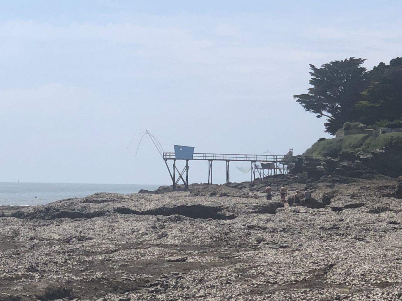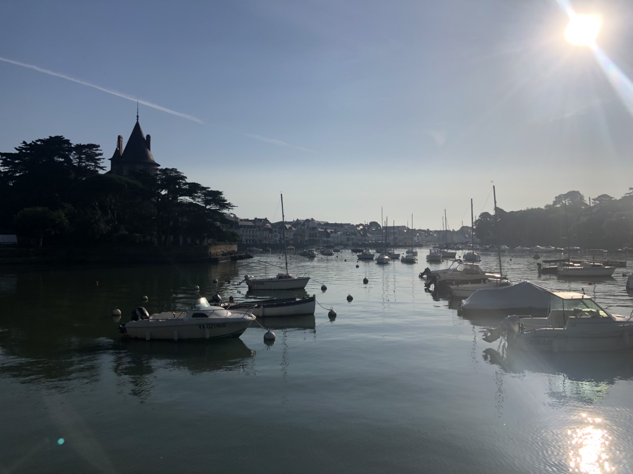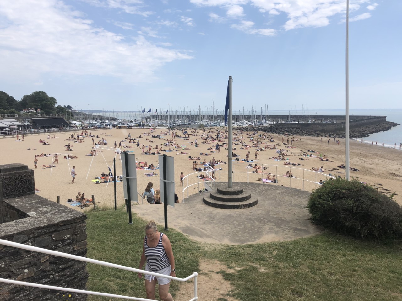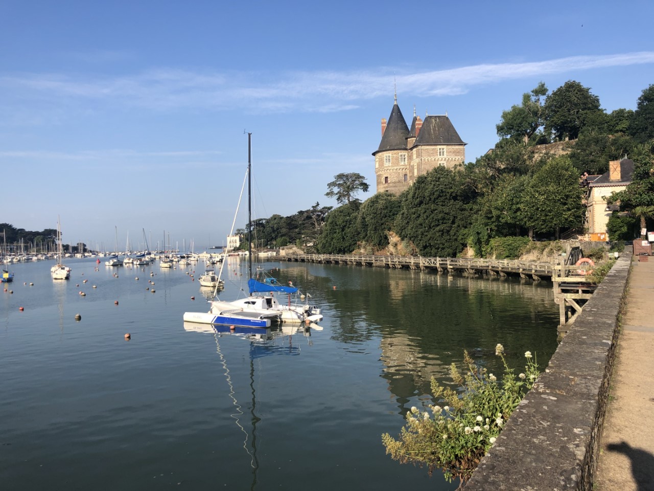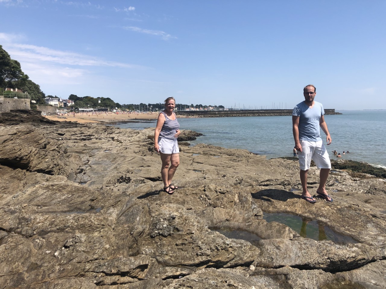 Het was zoeken naar een bakkertje. Degene die we gisteren hadden gezien was gesloten, maar Google Maps bracht uitkomst. De tafel was al gedekt en de Franse stokbroodjes smaakten weer perfect, waarom kan je deze niet in Nederland kopen? Na het ontbijt hebben we wat lopen slenteren door de kleine straatje en trappen van Pornic. Er was ook weer een plaatselijk marktje. De zon brandde flink en in die smalle straatjes leek het wel een oventje. Op de Just was het gelukkig wat koeler en hebben we onze voetjes wat rust gegeven. Gisteravond in de kuip hadden we wat last van muggen en ik kon nergens het netje vinden van de kajuitingang om ons een steekvrije nacht te bieden. Dus heb ik die zoektocht maar hervat voor vanavond. In de middag zijn we naar het strandje gewandeld. Eerst langs allemaal “Pippi Langkous huizen” en terug over rotspartijen, die bedekt waren met oesterschelpen. Aan het einde van deze klimpartij kwamen weer bij het strandje. We hebben een goede indruk van Pornic en het is weer tijd voor een nieuwe haven.