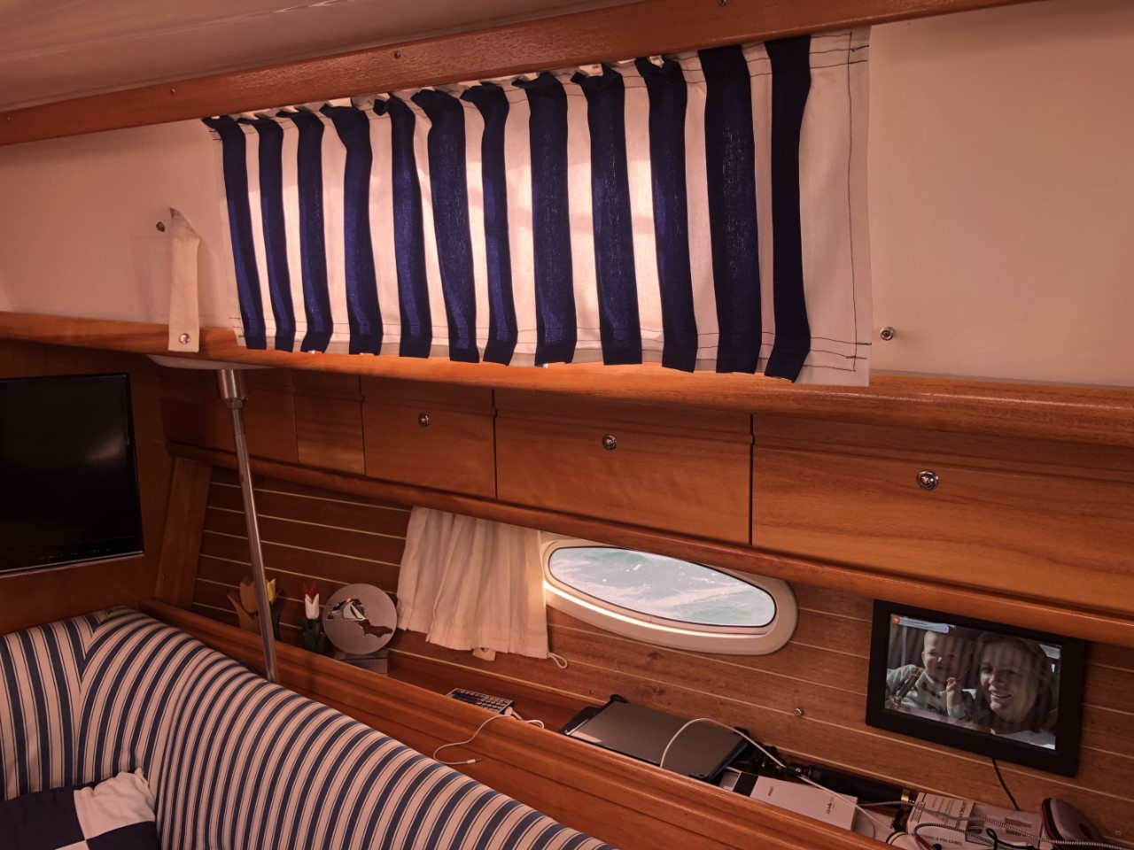Voor het eerst geen heldere blauwe lucht tijdens het wakker worden maar een grauw grijs wolkendek. Dat is even wennen. Marianne ging verder met het pimpen van de Just, nieuwe blauw-witte gordijntjes en ik blies wat lucht in de bijboot.