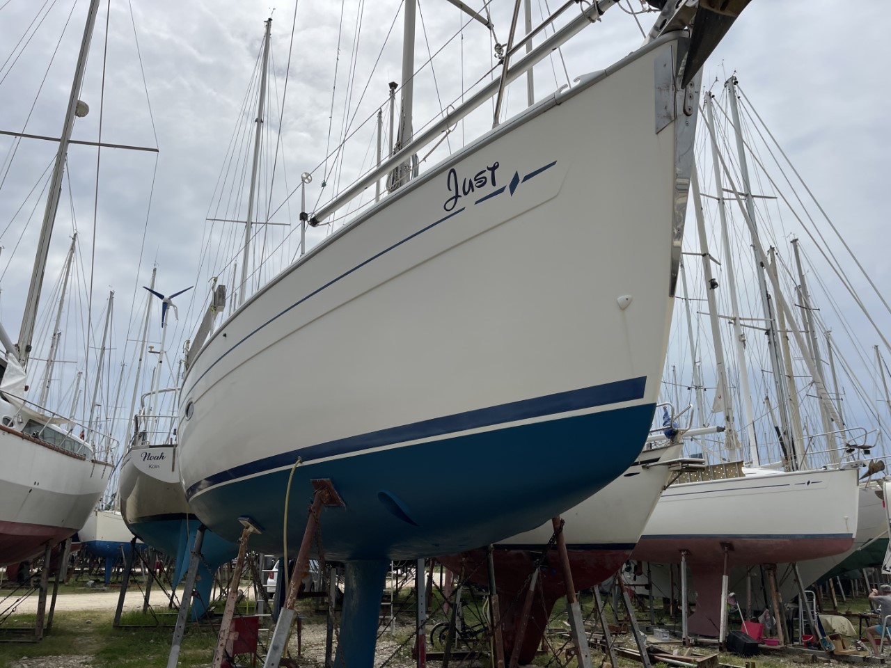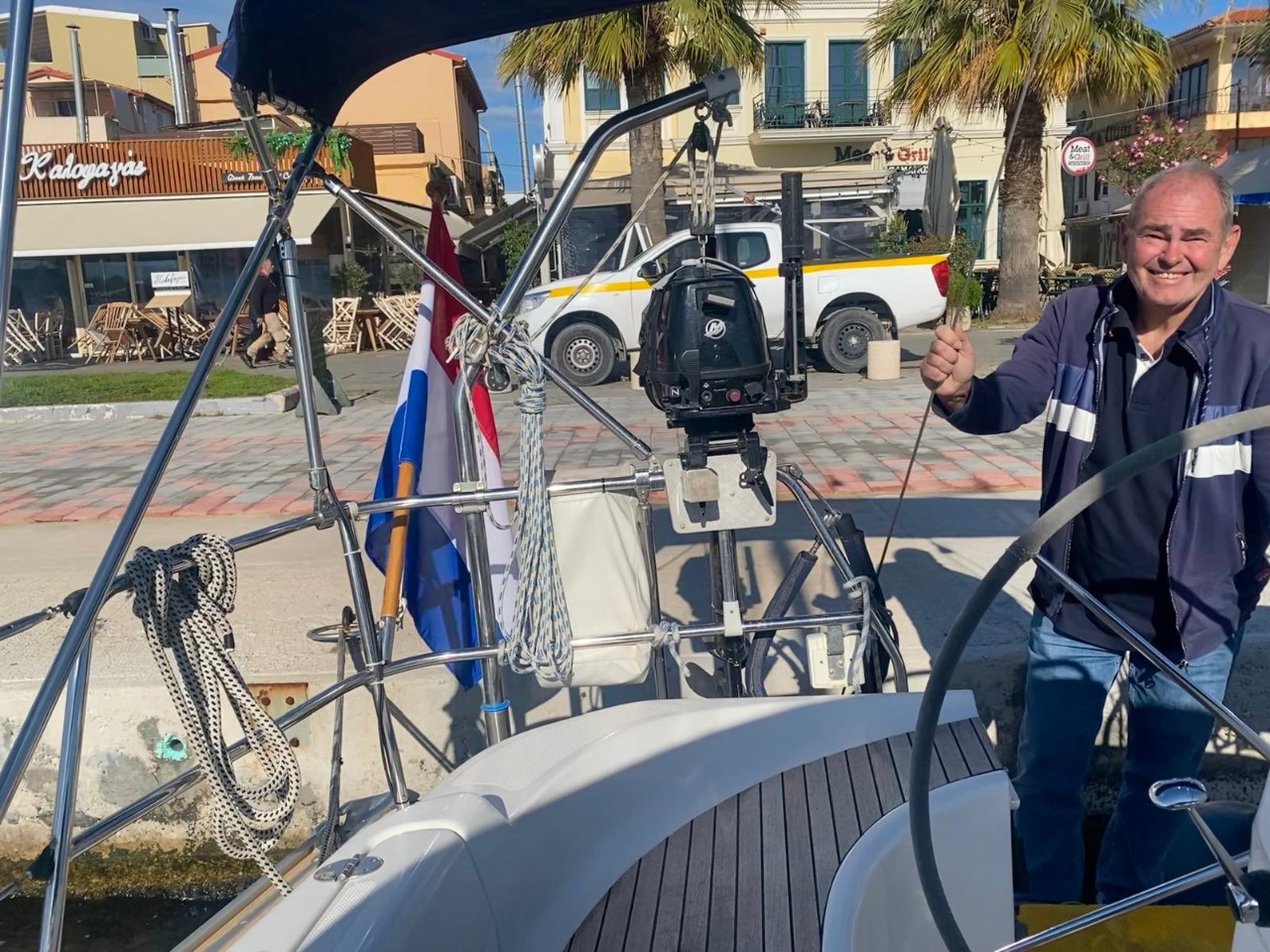 Ik vloog vroeg weg van Schiphol en stond al om 09:30 uur naast de Just. Gelijk heb ik geregeld dat de Just op 22 april te water wordt gelaten, want op die dag komt Marianne tegen de avond in Preveza. Ik heb 9 dagen om de Just een beetje te poetsen en een laag antifouling te smeren. Het weer viel een beetje tegen, wisselvallig met af en toe een fikse bui. Met het shuttlebusje ben ik voor de nodige proviand tweemaal naar Preveza geweest en één keertje naar Vonitsa. De Just is schoon en geverfd, mooi op tijd. Ik had geregeld dat ik aan het einde van de dag door het haventeam in het water werd gereden en aan het ponton kon wachten op Marianne. Die stond na de landing binnen een half uurtje naast de Just, gezellig weer met z’n tweetjes. De nacht was iets minder, er stond een stevige wind en we werden van het ponton geblazen met stevige rukken aan de landvasten. We zijn dan ook heel vroeg vertrokken naar een ankerplekje. Daar hebben we tot en met donderdag 25 april heerlijk gelegen achter ons anker. Op vrijdag zijn we naar de stadskade van Preveza gevaren. Er was alle ruimte en we kozen daar een ligplaatsje gunstig bij het water- en elektriciteitspunt.