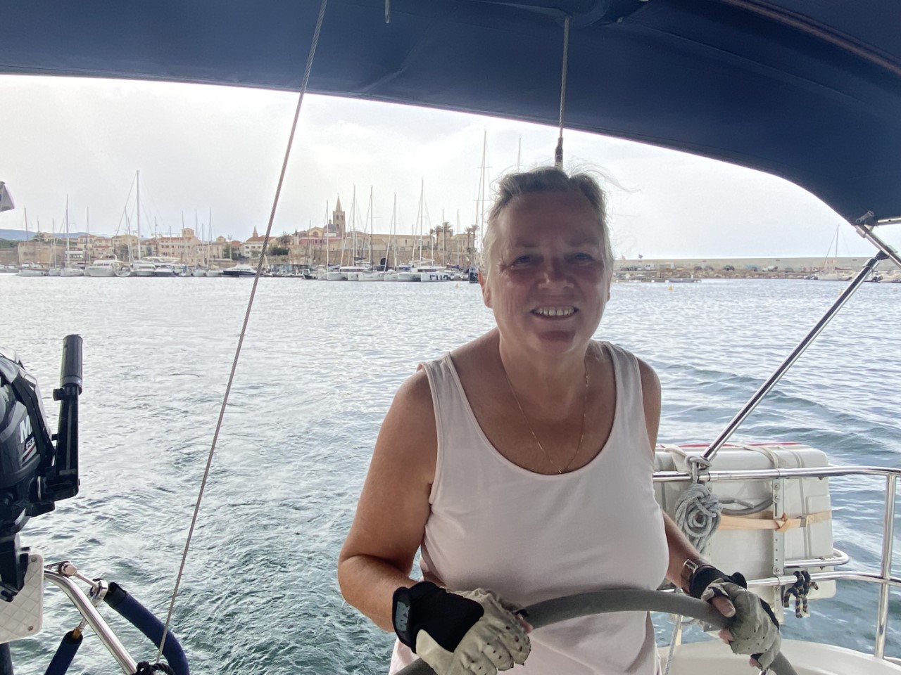 Aangekomen bij de grote baai van Porto Conte voorbij de kaap zien we allemaal witte kopjes op de golven met een wind op de kop van 18 knopen. We kijken elkaar aan, zo van dat hadden we niet verwacht. We hebben het roer nog even omgegooid om naar een ander ankerplekje te varen, maar we hebben toch de eerder ingestelde koers vervolgd. We hopen dat het dieper in de baai beter zal zijn. Niet dus. We hebben toch een ruime ankerplek ingenomen, waar we weliswaar flink op de wind liggen. Als meevallertje staan de golven op de boeg, zodoende hebben we slechts een lichte schommeling. Het relaxen kan beginnen. De E-boekjes worden gepakt en Marianne gaat de maandadministratie creatief te lijf.