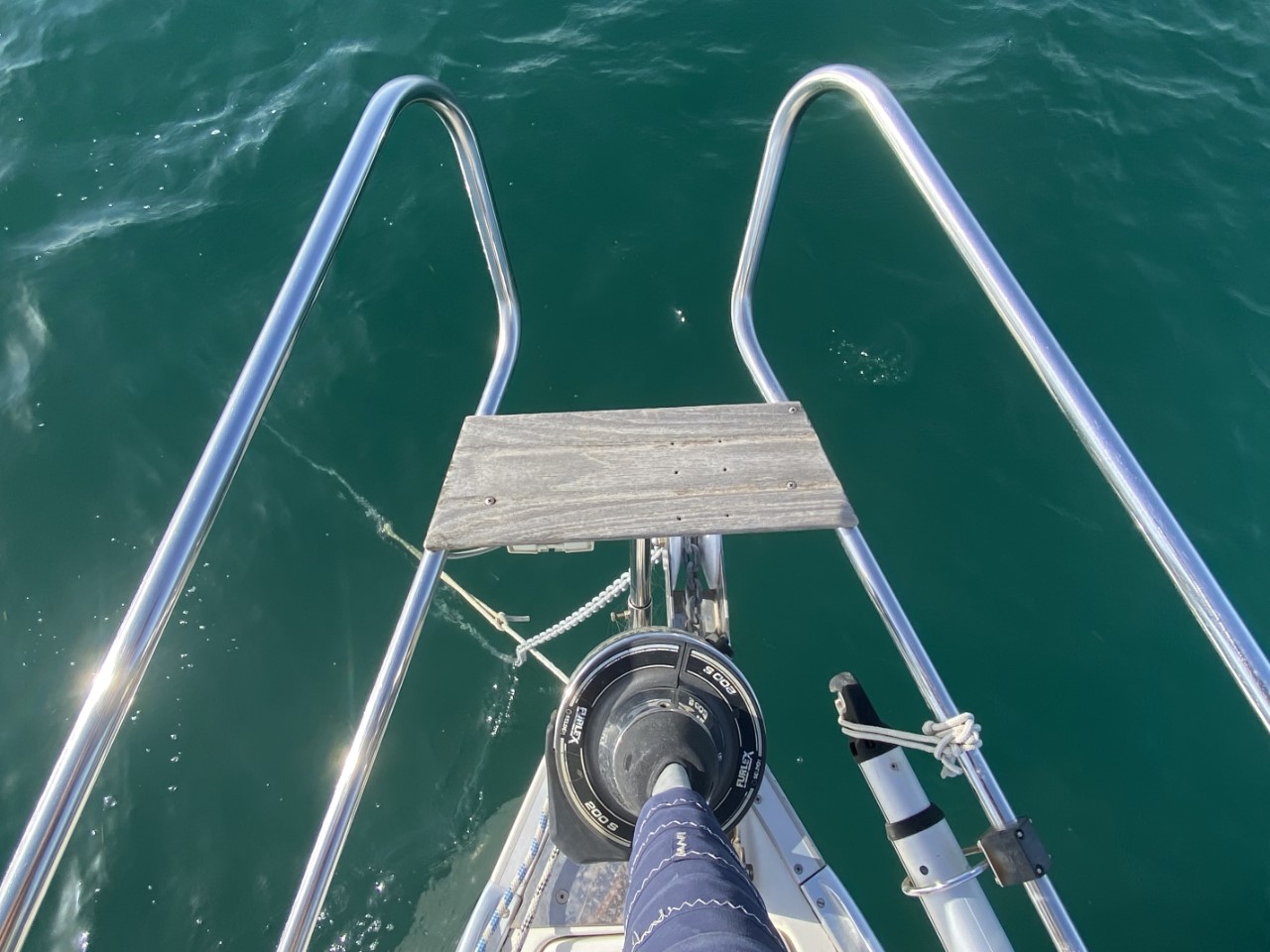 De behoefte om in deze Cala een duik te nemen, hebben we niet. In plaats van mooi, helder, turquoise water is het hier Noordzee-groen en kan je maar een 1 meter diep kijken. We nemen dan ook af en toe een verfrissende douche op het zwemplatform.