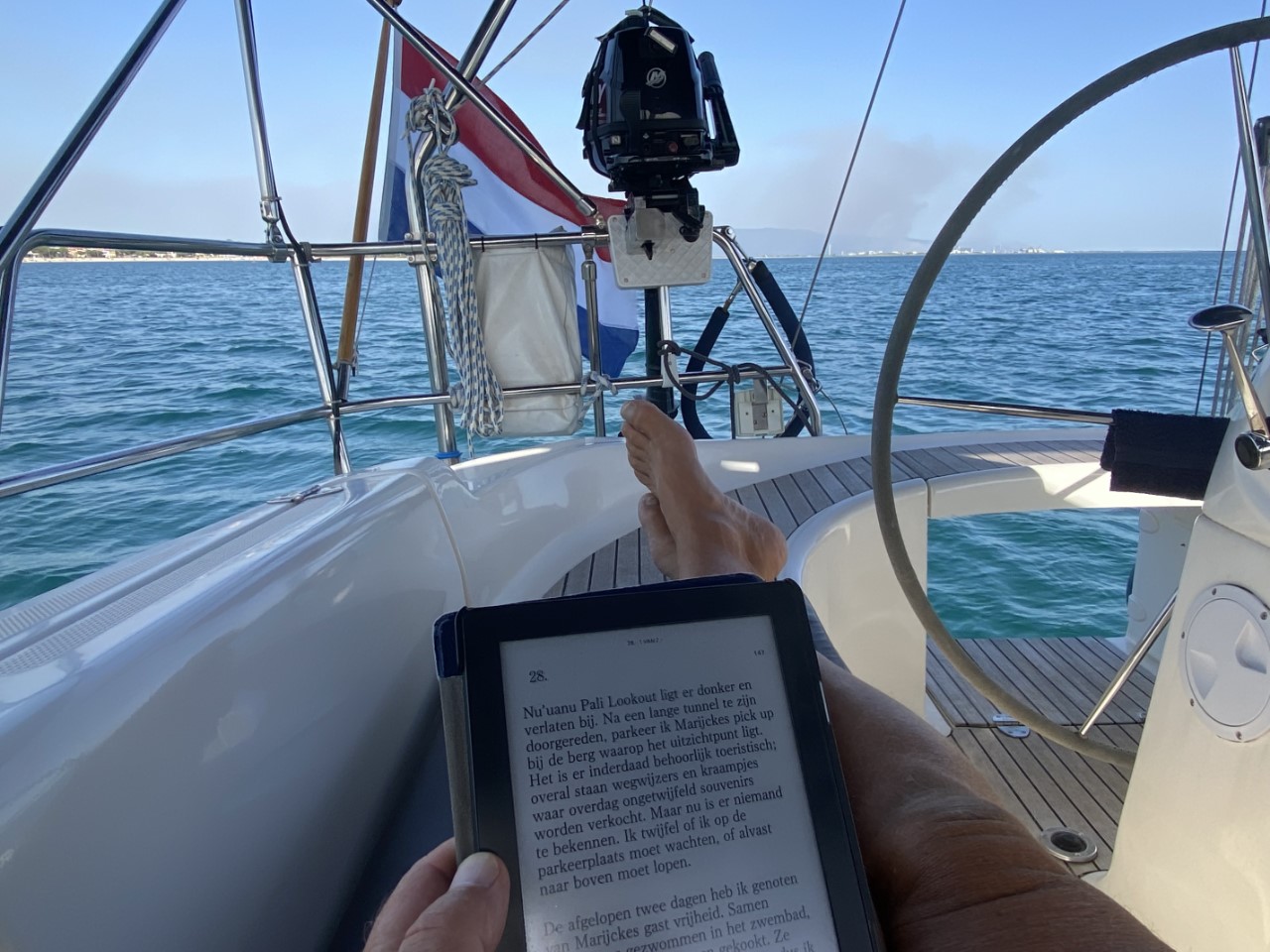 De rest van de dag doen we weinig. Net wanneer Marianne rond 14:30 uur gaat koken, steekt er een windje op, wat vrij snel een kleine storm wordt. Er ontstaan flinke golven met witte koppen op het water. Met vereende krachten kunnen we de pannen op de glasplaat houden. Dat stormpje is van korte duur. 2 uurtjes later is het weer nagenoeg windstil en bijna spiegelglad.
