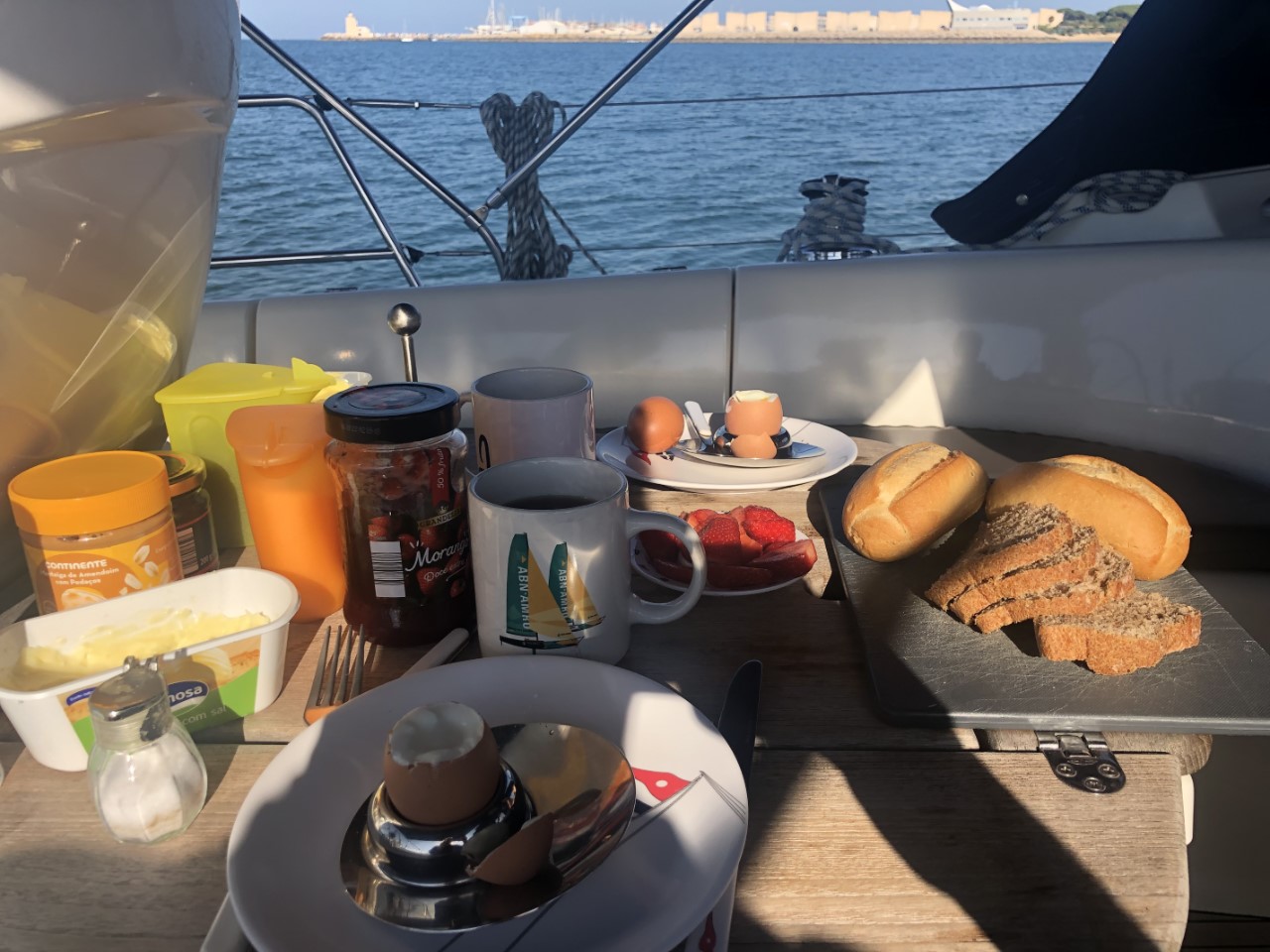 Tja, wat is er te vertellen over vandaag? Het was nagenoeg windstil vanmorgen en een helder blauwe lucht. Het zondagsontbijtje werd geserveerd in de kuip. We wanen ons al op Ibiza.
