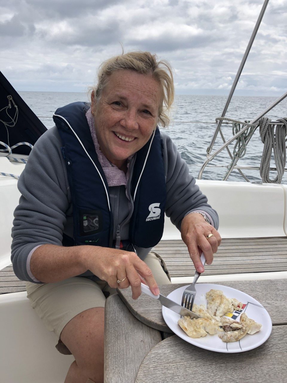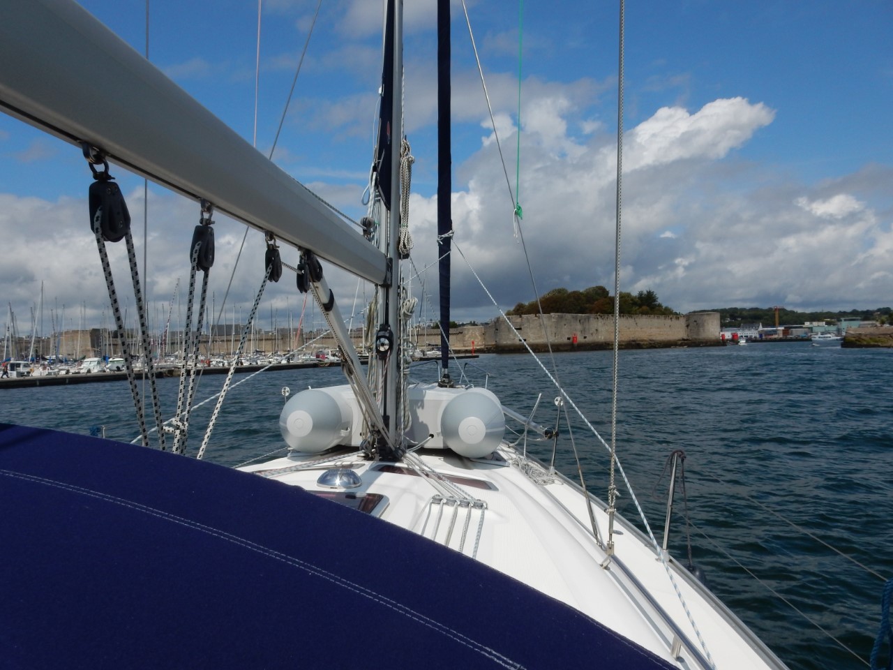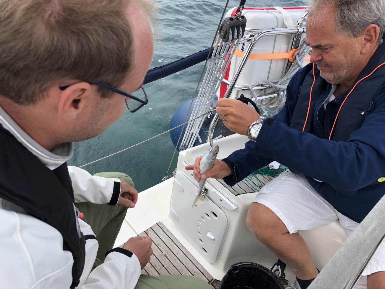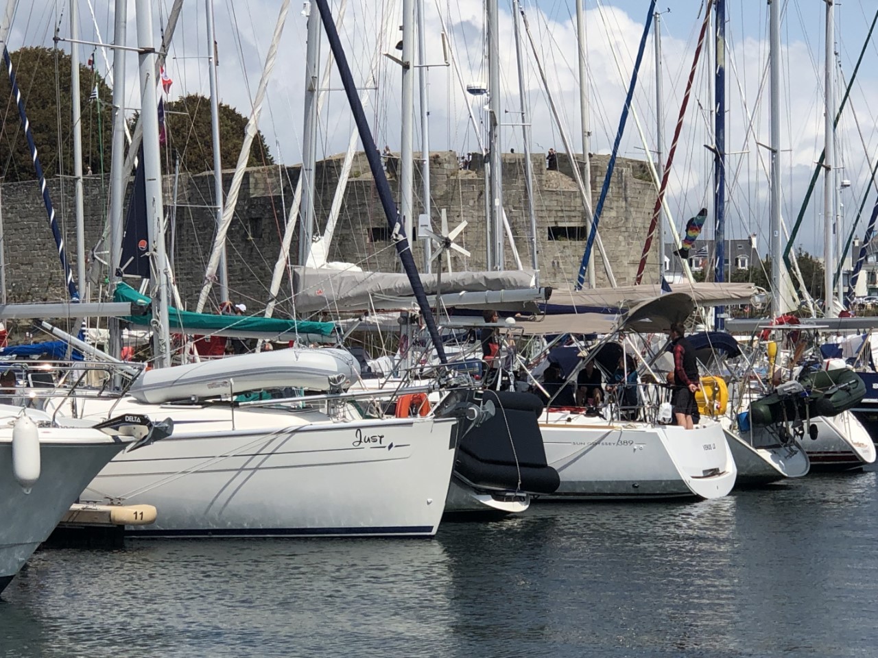 Vannacht heeft het alweer geregend, maar vanmorgen was het bewolkt. Er waren geen dreigende regenwolken meer. Dus we vertrekken op tijd. We gaan eerst naar de eilandengroep Iles de Glénan, ongeveer 10 mijl van Bénodet. Het wordt de Caribbean van Bretagne genoemd. Jammer genoeg was het nog bewolkt en zijn we er alleen langs gevaren. Daniel vroeg om de paravaan te lanceren voor een lekker visje tijdens de lunch. We zeilden eerst te hard, bijna 7 knopen. Maar toen we eenmaal voor het windje vaarden, met 3 tot 4 knopen hadden we al snel beet. Maar wat nu? Ik was het haasje en moest de vis bevrijden van z’n haakje. Marianne en Daniel keken toe hoe dat mislukte en de makreel zijn vrijheid herwon. Ik opgelucht dat het visje weer mocht zwemmen. Maar die twee hongerige crewleden gooiden snel de paravaan weer uit en binnen 5 minuten hadden ze weer beet. Poging 2 lukte beter. Gewapend met handschoen en hamer deed ik de makreel in een emmer. De emmer was Daniels idee, ik vroeg nog of die de vis wilde verzuipen. Maar ik kreeg al snel een scherp mes van Marianne en die wilde niet kijken en Daniel idem dito. Ik wilde de makreel nog bevrijden, maar dat had zeker geleid tot muiterij. Eindelijk de kop is er af, ik kon aan de slag om de makreel te fileren, ook toen spartelde die nog. De bakpan ging op het vuur en het verse makreeltje lag te zwemmen in de bakboter. Zo de crew was tevreden en de honger was gestild, waarna het zonnetje doorbrak. Na een heel mooie zeiltocht zijn we in Concarneau gelijk de kade opgegaan. We belanden in de drukte van het centrum. Het lijkt hier een beetje op St. Malo. Een stadswal met daarin allemaal leuke winkeltjes en restaurants. Heel gezellig en misschien wel authentieker dan St. Malo. Aan het eind van de wandeling gingen we een paar pizzeria’s af voor vanavond, maar de meeste waren een afhaaltent of het zag er niet gezellig uit. Dus Daniel opperde als pizzaliefhebber waarom gaan we ze niet halen en eten we ze lekker op de Just. Op de kade was er voorbereiding voor een Tour de Corcarneau. Ze begonnen te fietsen toen wij net klaar met de pizza waren. Met een druk Frans ventje die commentaar op de wedstijd gaf en de coureurs die een paar rondjes door Concarneau reden. Wij gingen lekker onderuit en maken een boodschappenlijstje voor morgen als we naar de markt gaan.