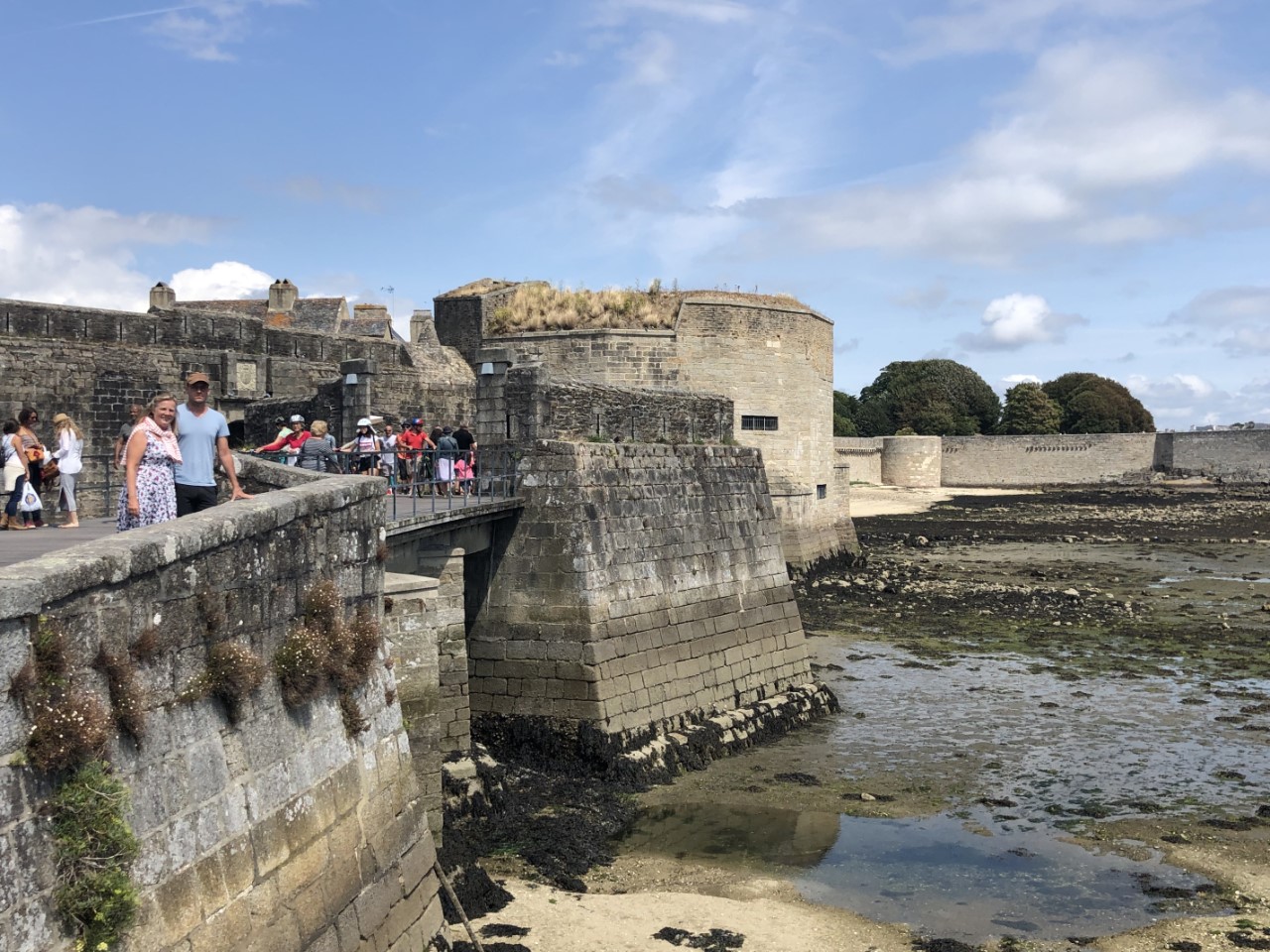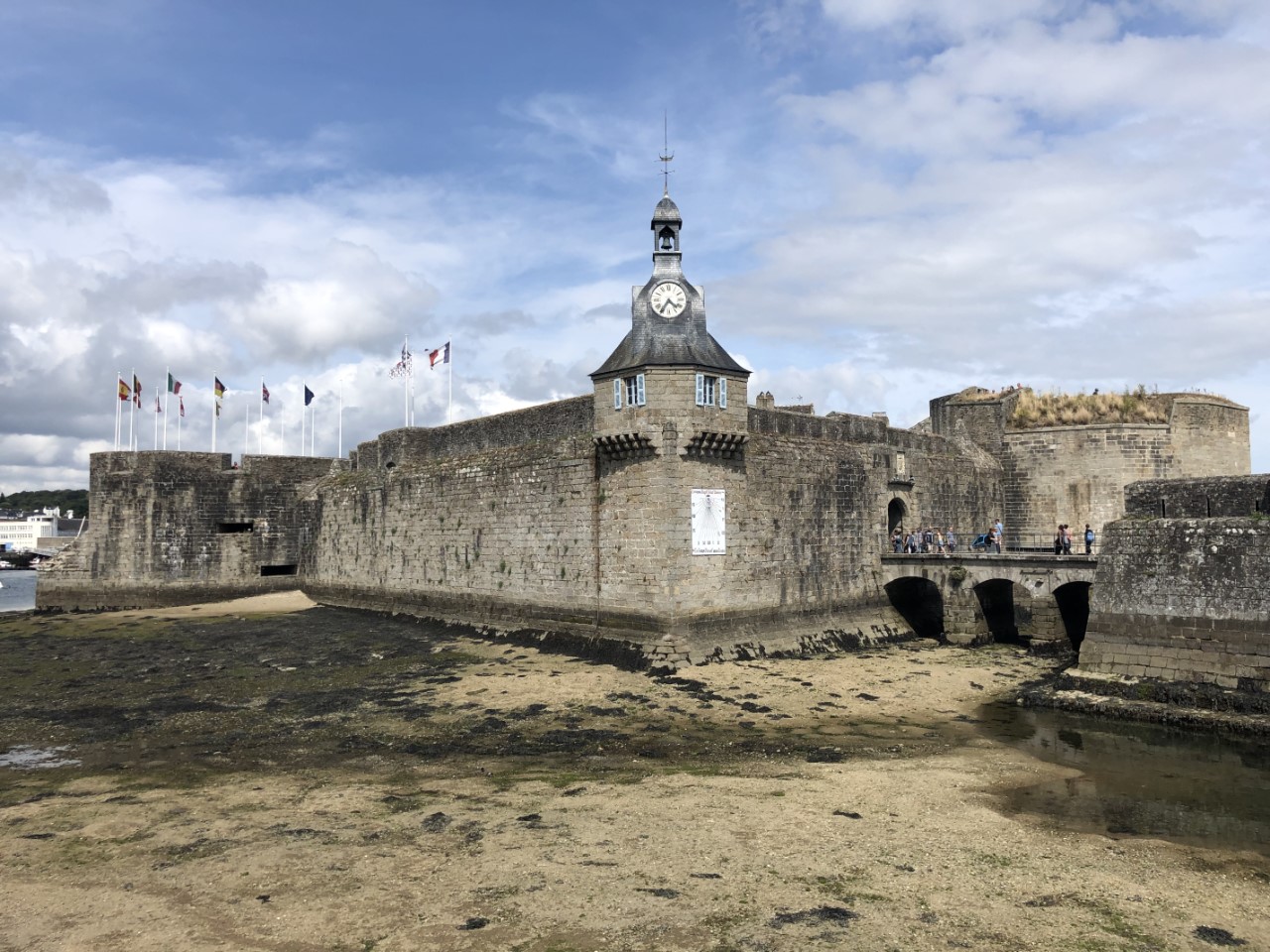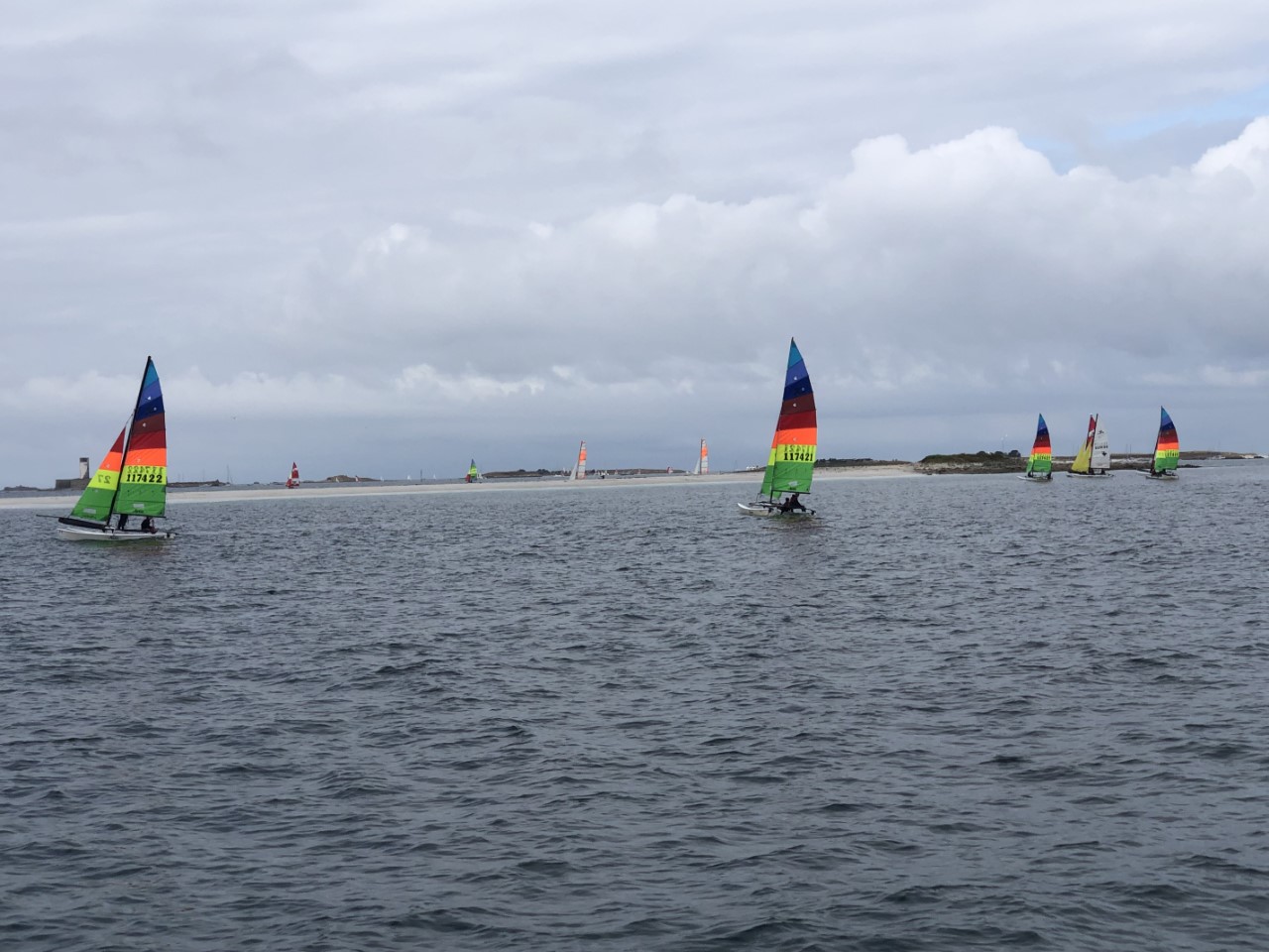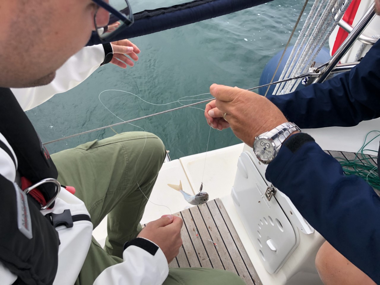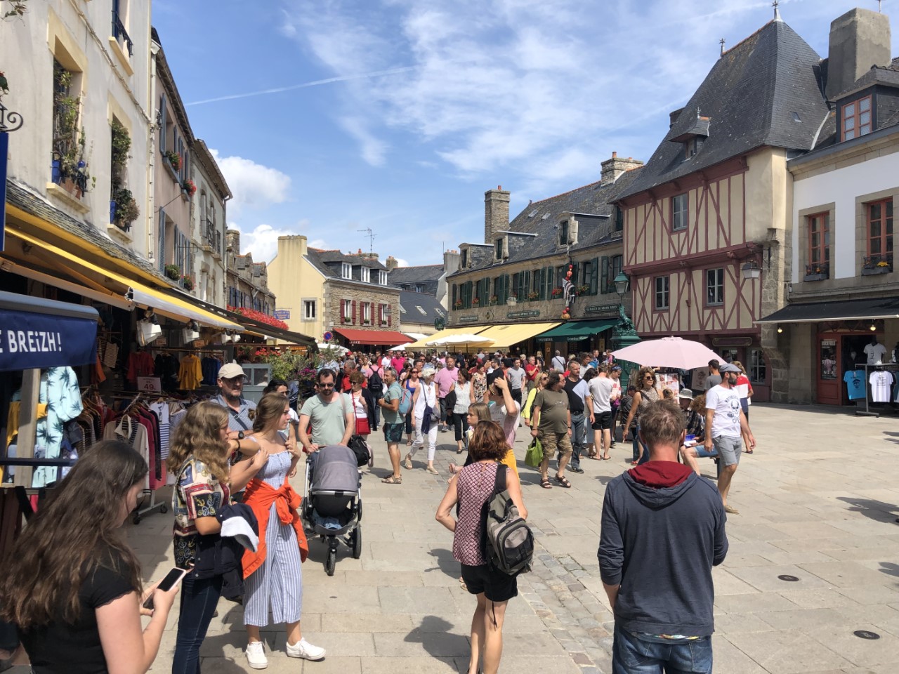 Vannacht heeft het alweer geregend, maar vanmorgen was het bewolkt. Er waren geen dreigende regenwolken meer. Dus we vertrekken op tijd. We gaan eerst naar de eilandengroep Iles de Glénan, ongeveer 10 mijl van Bénodet. Het wordt de Caribbean van Bretagne genoemd. Jammer genoeg was het nog bewolkt en zijn we er alleen langs gevaren. Daniel vroeg om de paravaan te lanceren voor een lekker visje tijdens de lunch. We zeilden eerst te hard, bijna 7 knopen. Maar toen we eenmaal voor het windje vaarden, met 3 tot 4 knopen hadden we al snel beet. Maar wat nu? Ik was het haasje en moest de vis bevrijden van z’n haakje. Marianne en Daniel keken toe hoe dat mislukte en de makreel zijn vrijheid herwon. Ik opgelucht dat het visje weer mocht zwemmen. Maar die twee hongerige crewleden gooiden snel de paravaan weer uit en binnen 5 minuten hadden ze weer beet. Poging 2 lukte beter. Gewapend met handschoen en hamer deed ik de makreel in een emmer. De emmer was Daniels idee, ik vroeg nog of die de vis wilde verzuipen. Maar ik kreeg al snel een scherp mes van Marianne en die wilde niet kijken en Daniel idem dito. Ik wilde de makreel nog bevrijden, maar dat had zeker geleid tot muiterij. Eindelijk de kop is er af, ik kon aan de slag om de makreel te fileren, ook toen spartelde die nog. De bakpan ging op het vuur en het verse makreeltje lag te zwemmen in de bakboter. Zo de crew was tevreden en de honger was gestild, waarna het zonnetje doorbrak. Na een heel mooie zeiltocht zijn we in Concarneau gelijk de kade opgegaan. We belanden in de drukte van het centrum. Het lijkt hier een beetje op St. Malo. Een stadswal met daarin allemaal leuke winkeltjes en restaurants. Heel gezellig en misschien wel authentieker dan St. Malo. Aan het eind van de wandeling gingen we een paar pizzeria’s af voor vanavond, maar de meeste waren een afhaaltent of het zag er niet gezellig uit. Dus Daniel opperde als pizzaliefhebber waarom gaan we ze niet halen en eten we ze lekker op de Just. Op de kade was er voorbereiding voor een Tour de Corcarneau. Ze begonnen te fietsen toen wij net klaar met de pizza waren. Met een druk Frans ventje die commentaar op de wedstijd gaf en de coureurs die een paar rondjes door Concarneau reden. Wij gingen lekker onderuit en maken een boodschappenlijstje voor morgen als we naar de markt gaan.