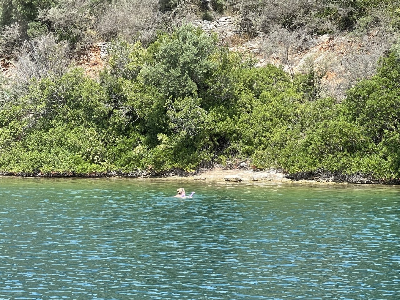 Helemaal niks gedaan is niet waar. Marianne heeft de kajuit schoongemaakt, toen ik een beetje in de kuip zat te dommelen. In de middag hebben we zeker een uurtje langs de kustlijn gezwommen. Moe en voldaan zijn we lekker onderuitgezakt.