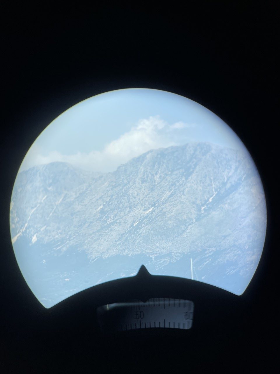 De krekels hebben ons niet gestoord tijdens de nacht. Het was een hele rustige nacht. Ook in de morgen is het windstil en kijken we uit op een spiegelgladde zee met in de verte hoge woeste bergen.
