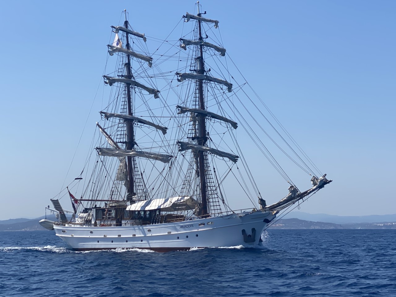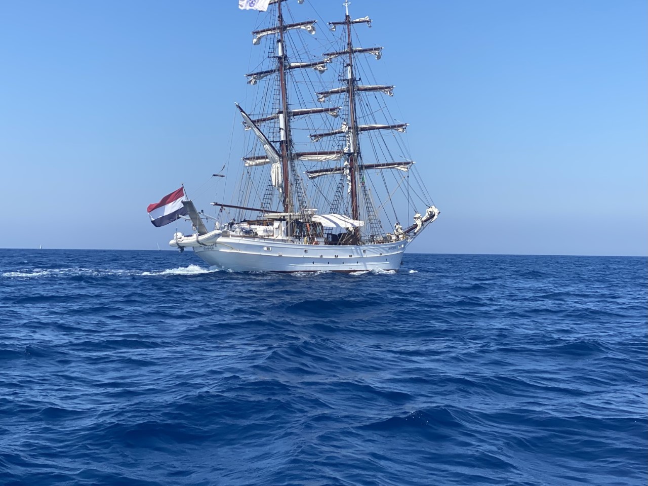 We hebben een mooi bezeild koersje naar Sardinië. Halverwege komen we een Nederlandse tweemaster tegen, de “Aphrodite”, een geheel dwars getuigd zeilschip met 17 zeilen en 30 meter lang. Wij worden begroet door de scheepshoorn en wij zwaaien terug. Geweldig om zo’n schip in zijn element te zien.