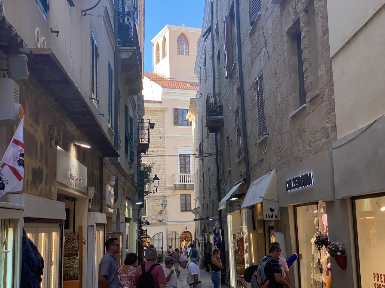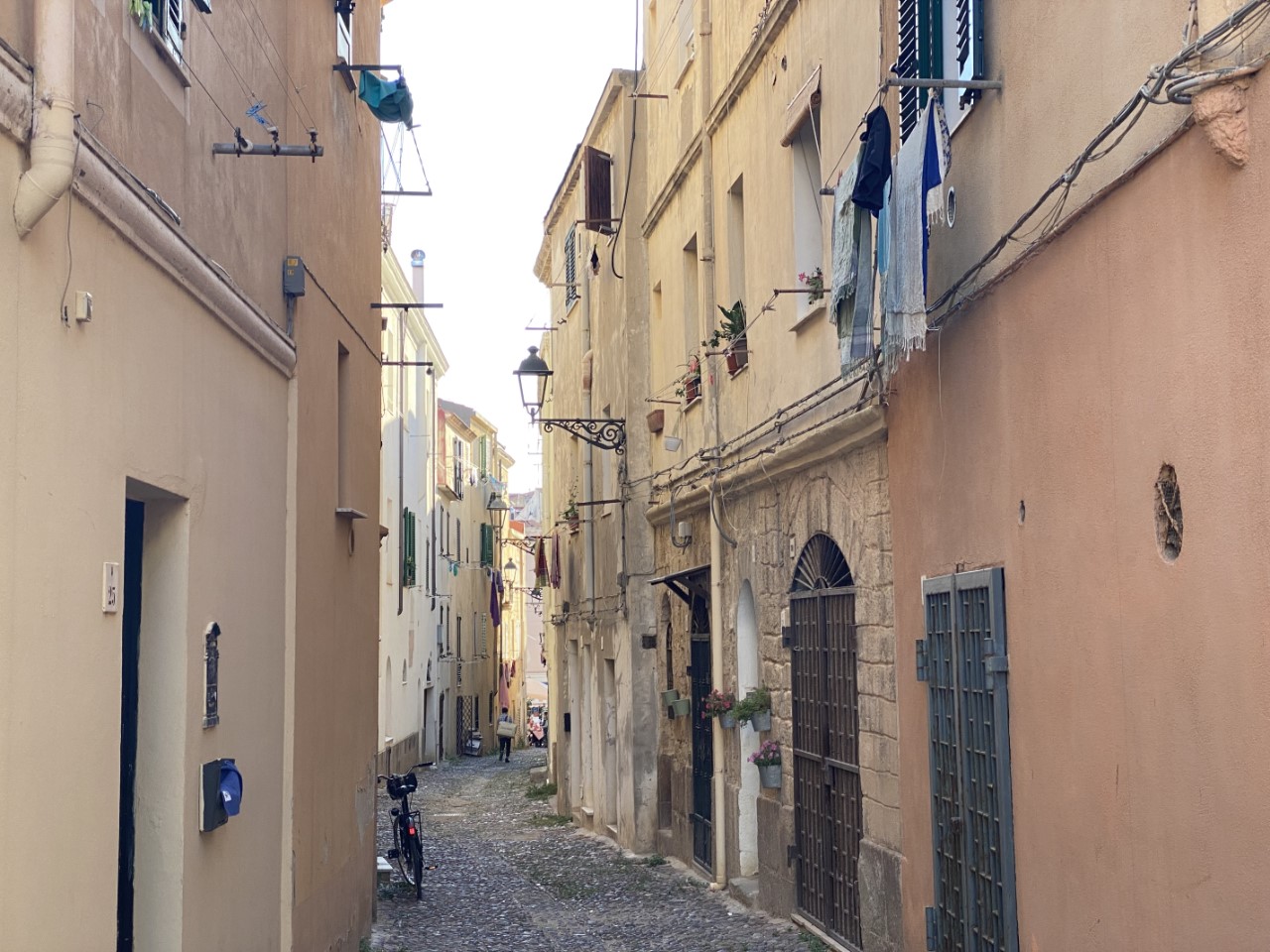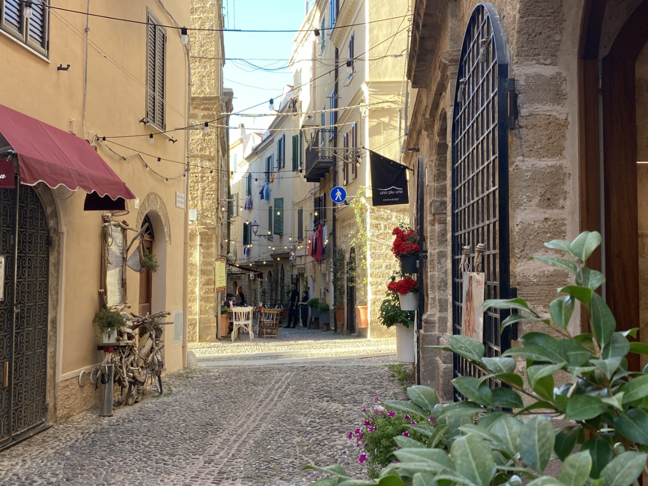 In het kuipje zitten we lekker te smikkelen van de Sardijnse specialiteiten, die we gisteren hadden ingeslagen. De temperatuur is in de namiddag nog steeds tegen de 33 graden, dus onze wandeling stellen we steeds iets uit. In de vooravond hebben we eerst de stadsmuur beklommen en bewandeld, voordat we wat gaan slenteren door de smalle winkelstraatjes met keitjes. Er zijn veel ijszaken, terrassen en sieradenwinkels met koraal en souvenirs. Hier en daar zien we in de zijstraatjes de was wapperen.