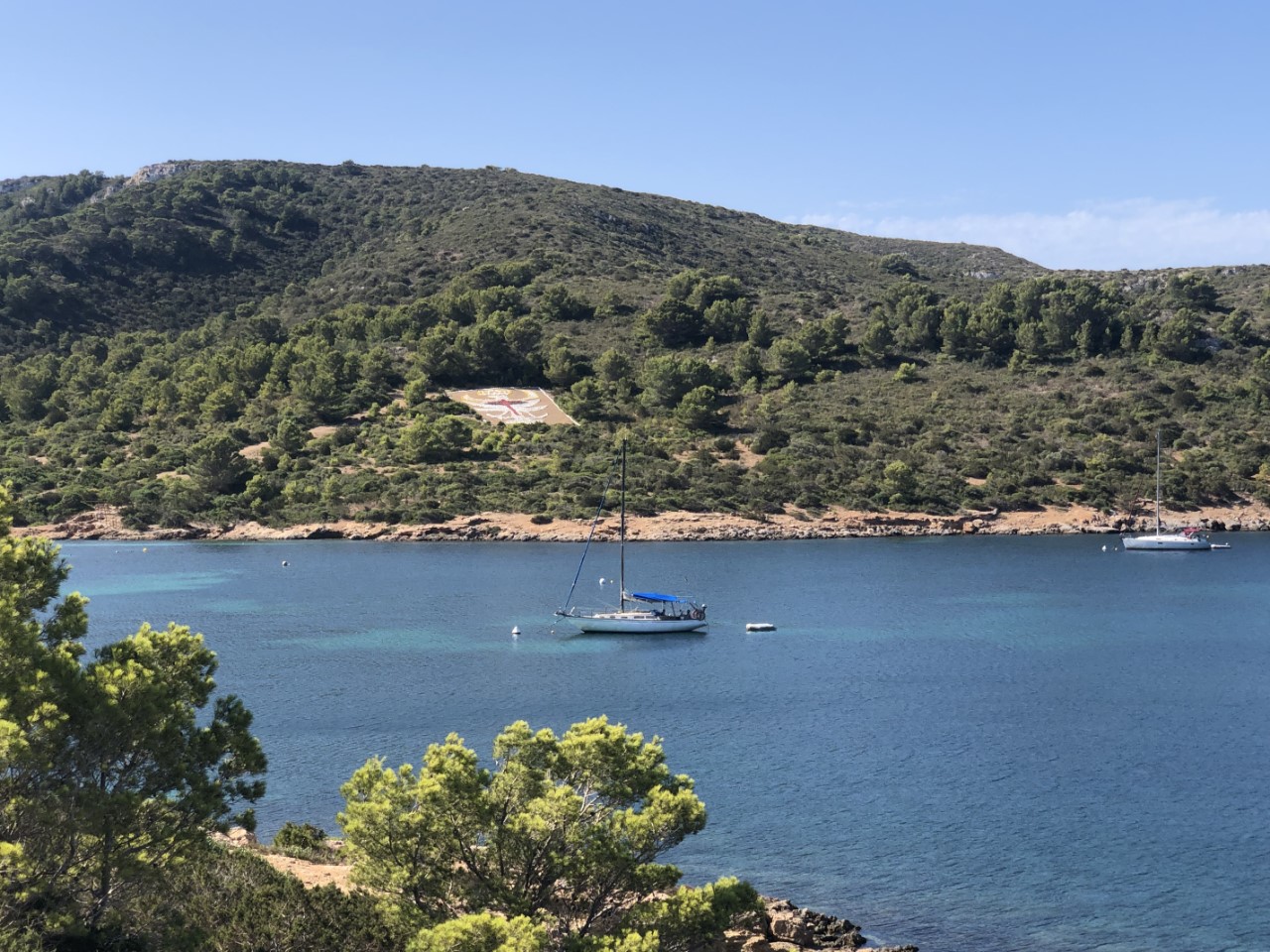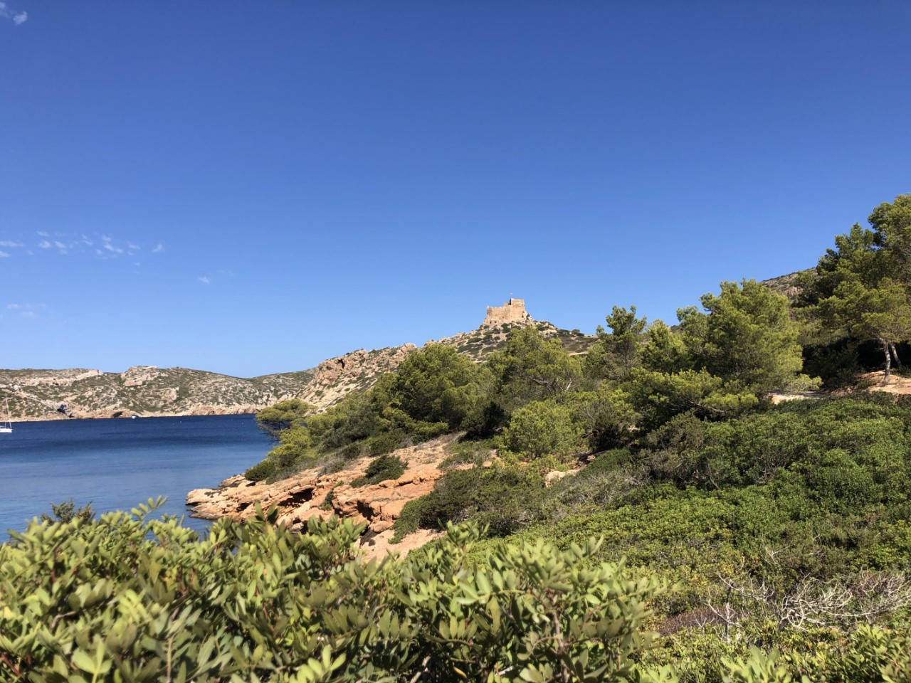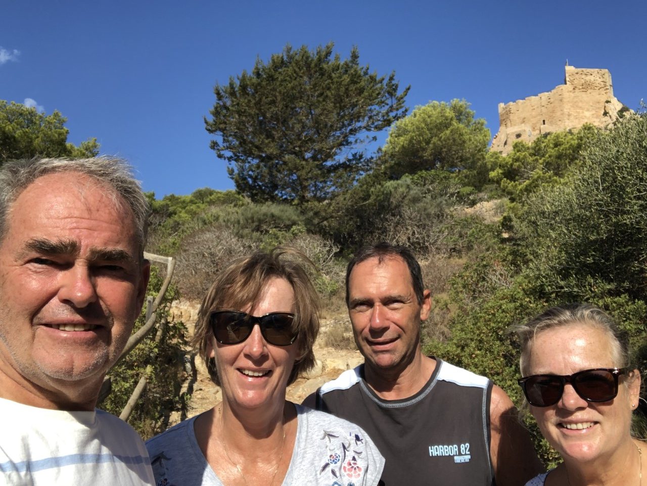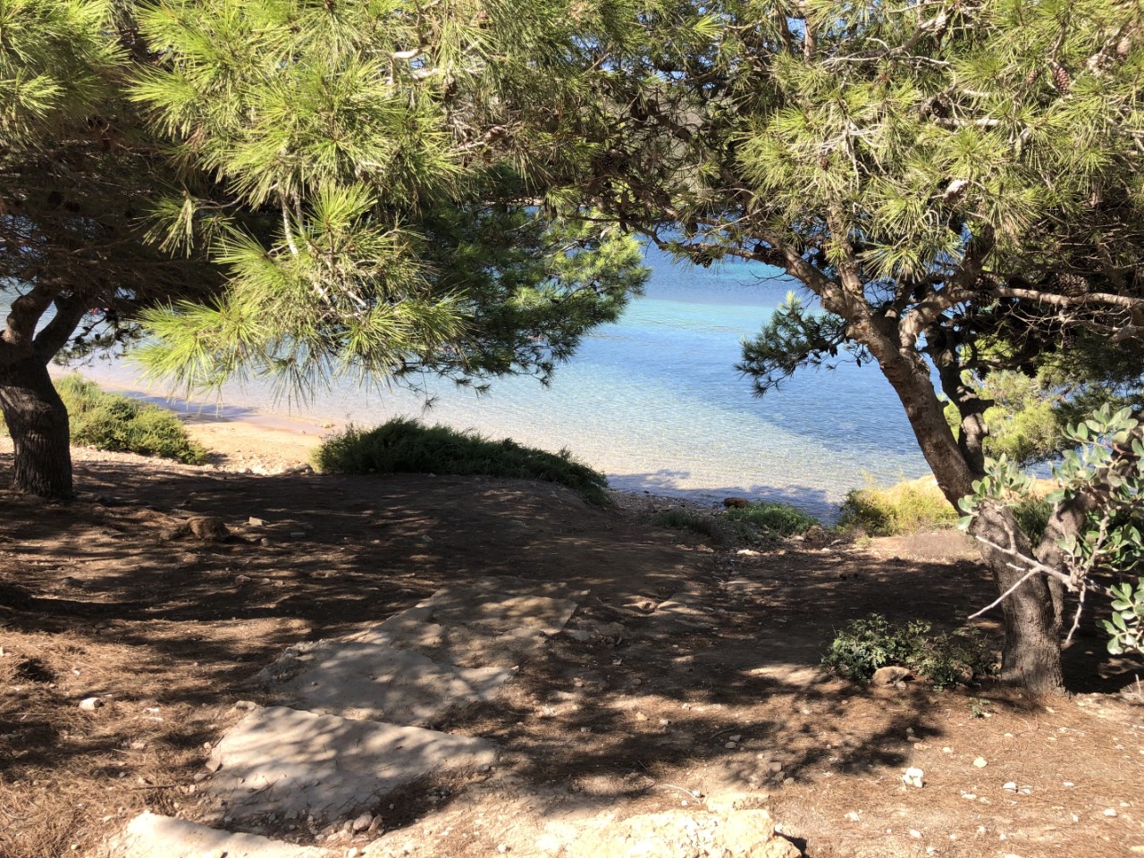 Na een vroege ochtendduik in het heldere water zijn we met het bijbootje naar de wal gegaan. We zijn als eerste naar het kasteel gelopen wat een warme klim was. Jammer genoeg is die niet te bezoeken (Covid), maar het blijft een mooi kasteeltje. Via het wandelpad rond de baai komen we bij de mozaïek, waar we na wat zoekwerk nog steeds niet achter zijn wat het voorstelt.