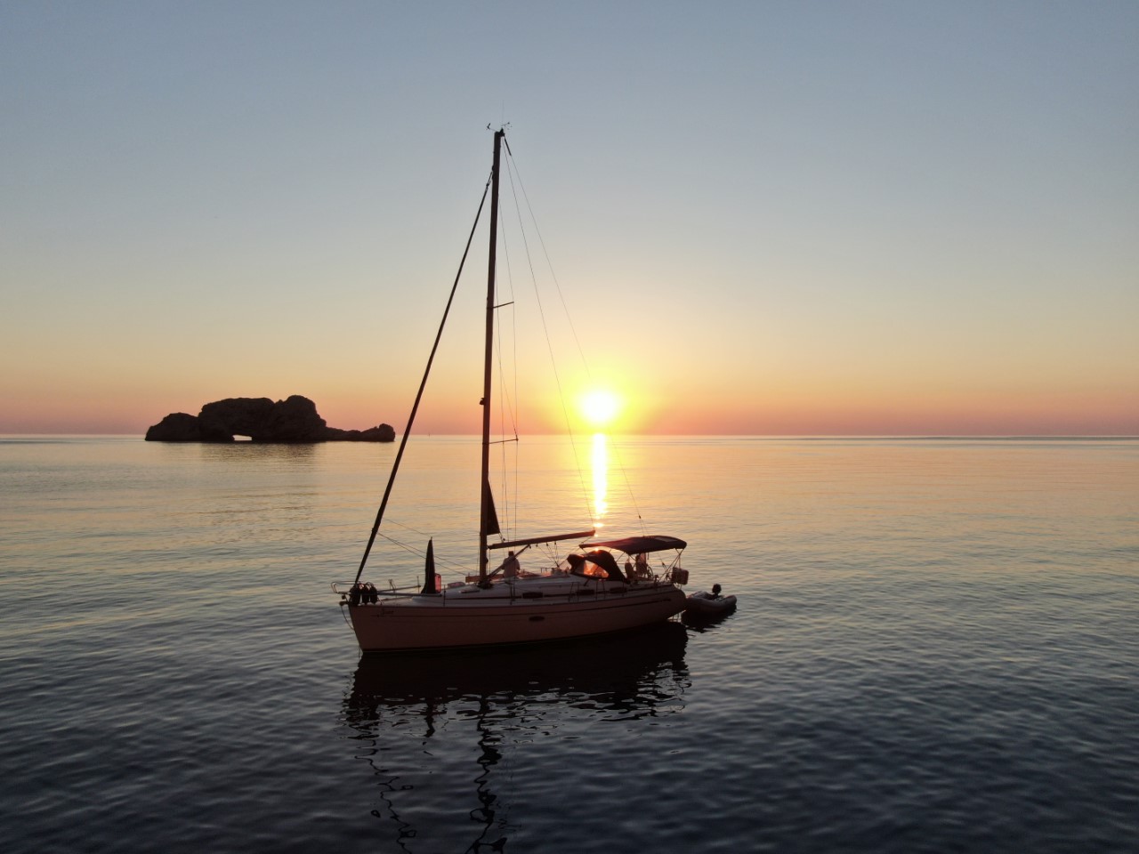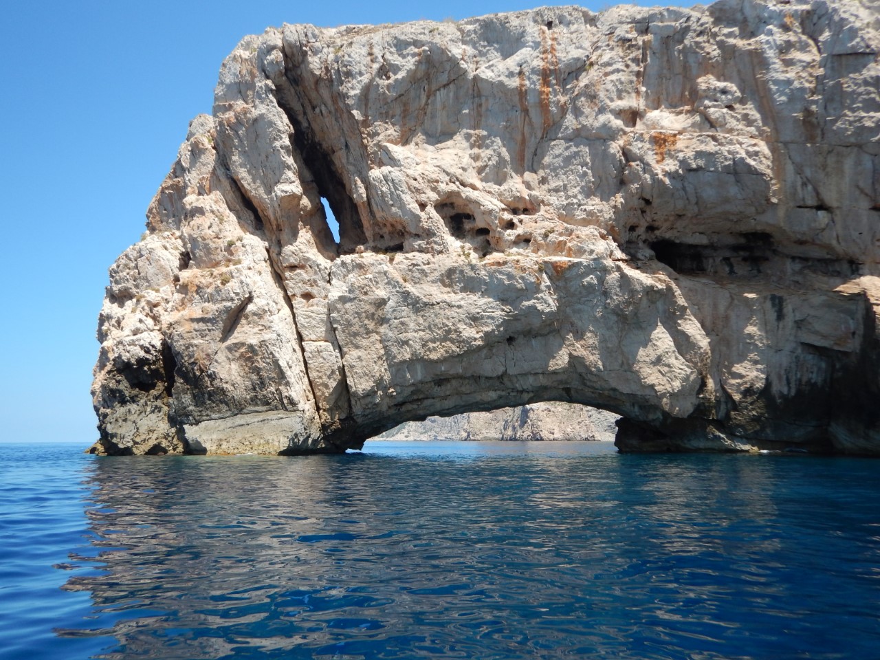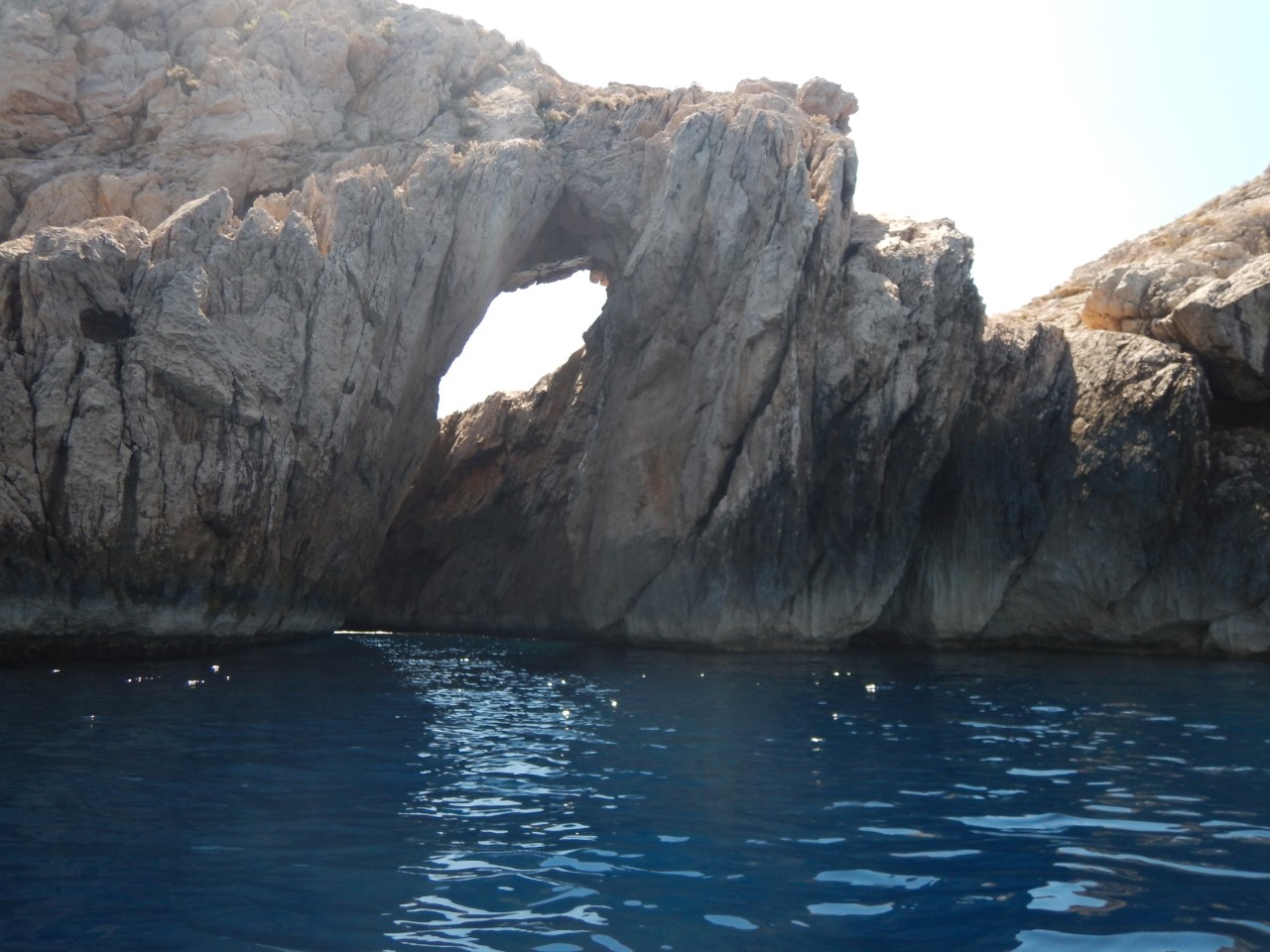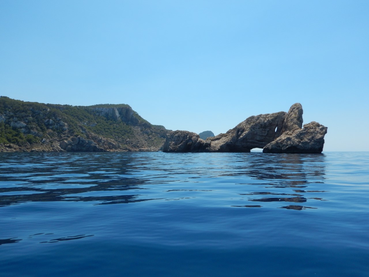 Dan komen we aan bij Ses Balandres. Deze heeft een paar voordelen, ligt aardig beschermd voor de wind en swell en er ligt maar één superjacht. Met enige twijfel zijn we omgedraaid en met lang zoeken vinden we een mooie zandplaat zonder zeegras voor ons anker. We liggen bijna omringd door steile rotsen en een mooi uitzicht op een apart gevormde rots met een leuk boogje. Ik heb gelijk een duik genomen om het anker te controleren. Gelukkig raken we geen zeegras met de ketting en we liggen stevig verankerd in de zandbodem. De Tiramisu met Natasja en Marcel kwamen ook aanvaren en hebben een poging gedaan om ook hier te ankeren, maar vonden geen goed plekje en gingen verder.