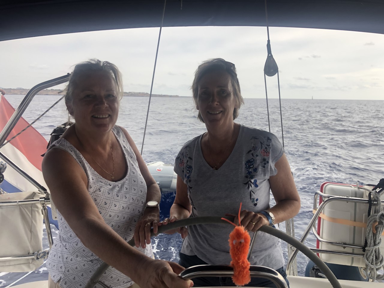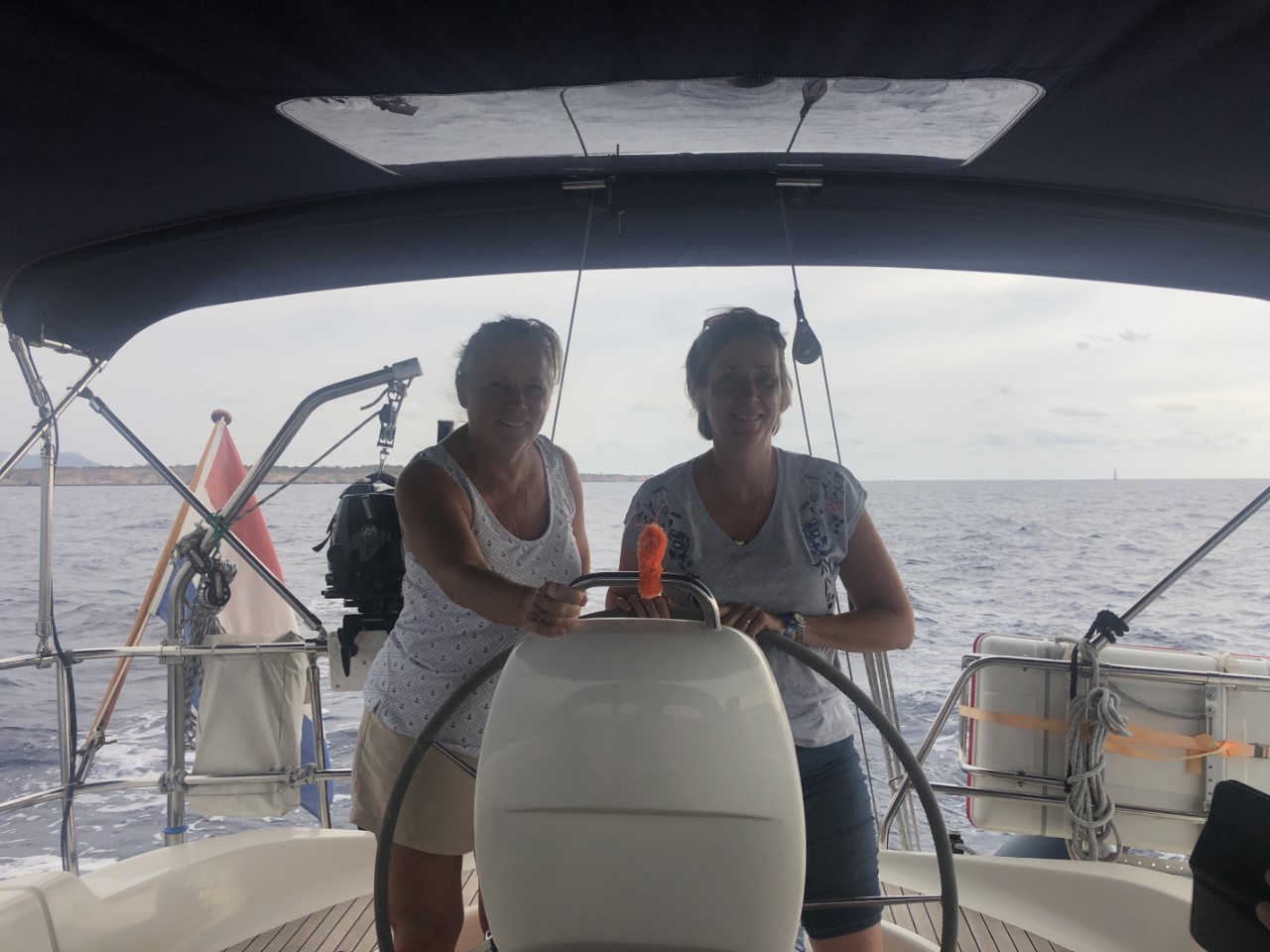 Bettina en Fred staan rond 09:30 uur op het strandje om opgehaald te worden met het bijbootje. We halen vrij snel het anker op. Varend langs de mooie kustlijn zijn we alle Cala’s ingevaren om hun een idee te geven hoe mooi ze zijn. De laatste is Cala Figuera de Santanyi . Vandaaruit hebben we koers gezet naar Cabrera. Er hing allang een dreigende lucht boven Mallorca, maar die komt steeds dichterbij en het duurt ook niet lang totdat de eerste druppels regen vallen. Niet veel later wordt het een flinke plensbui. Maar na regen komt zonneschijn en ook gelukkig vandaag, als we oversteken naar Cabrera, laat het zonnetje zich voorzichtig door de wolken zien. De laatste vijf mijl konden we heerlijk zeilen en na 4 uur vaarden we de baai in.