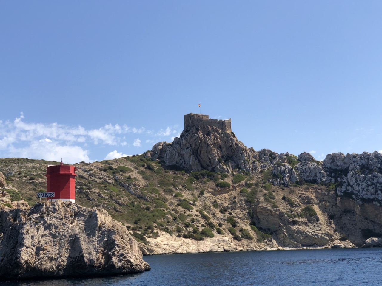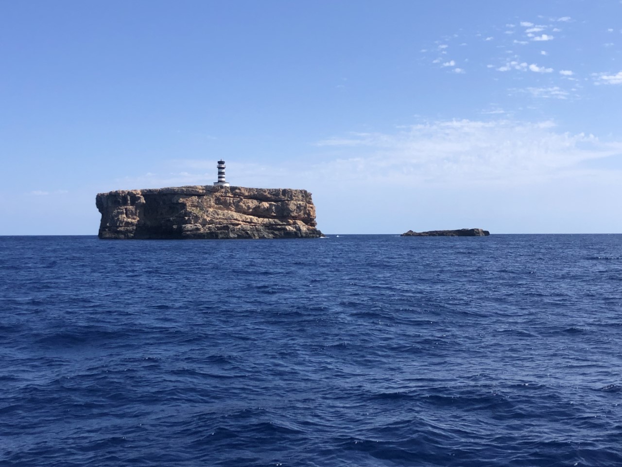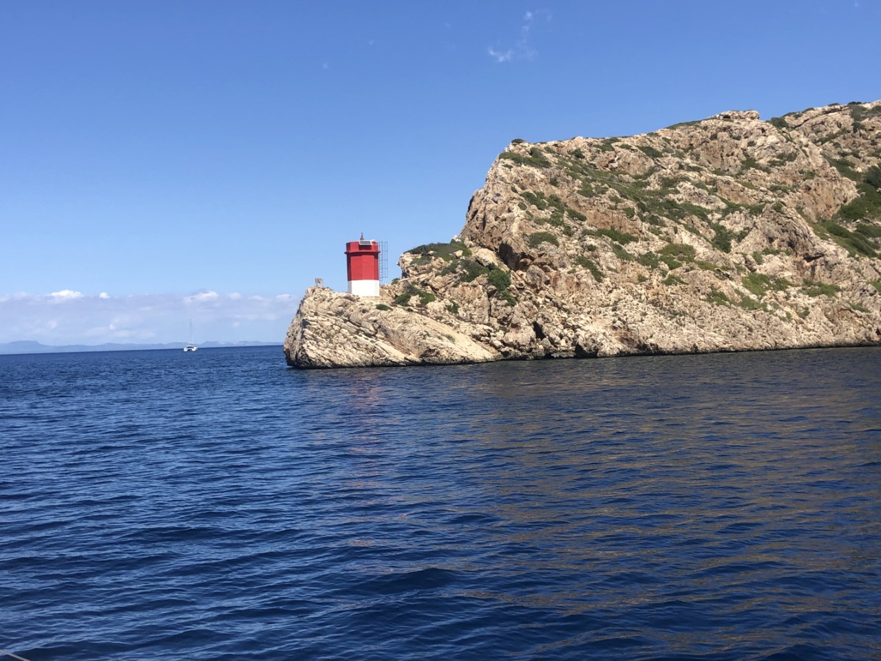 Aangekomen bij Cabrera hebben we eerst de “Blauwe Grot” bezocht. Althans Bettina, Fred en Marianne, want ankeren mag niet rond het eiland. Het is bovendien voor de grot rond de veertig meter diep. Ik blijf daarom op de Just en met het bijbootje gaan ze roeiend naar de grot. Door de weerkaatsing van de inmiddels stralende zon is er een mooie blauwe gloed in het water van de grot. Vandaaruit zijn we direct naar de geboekte mooringboei gegaan, die lastig op te pikken was.