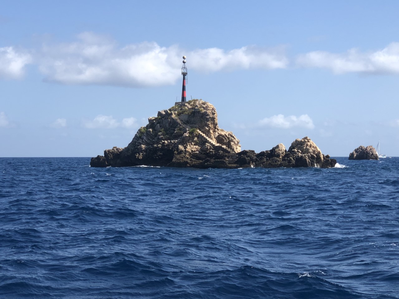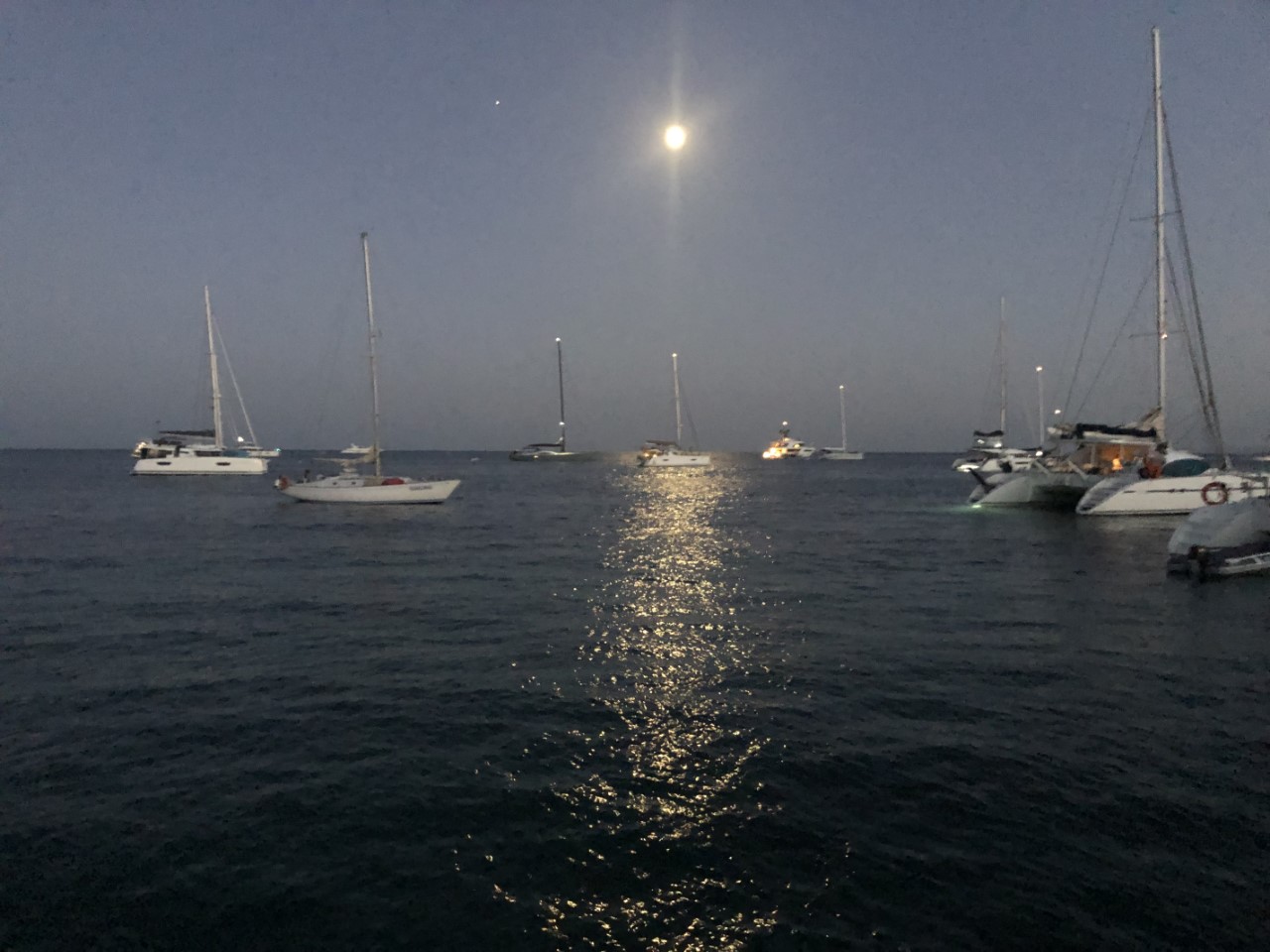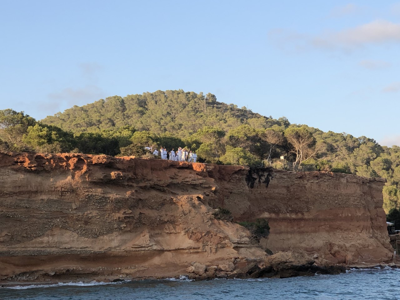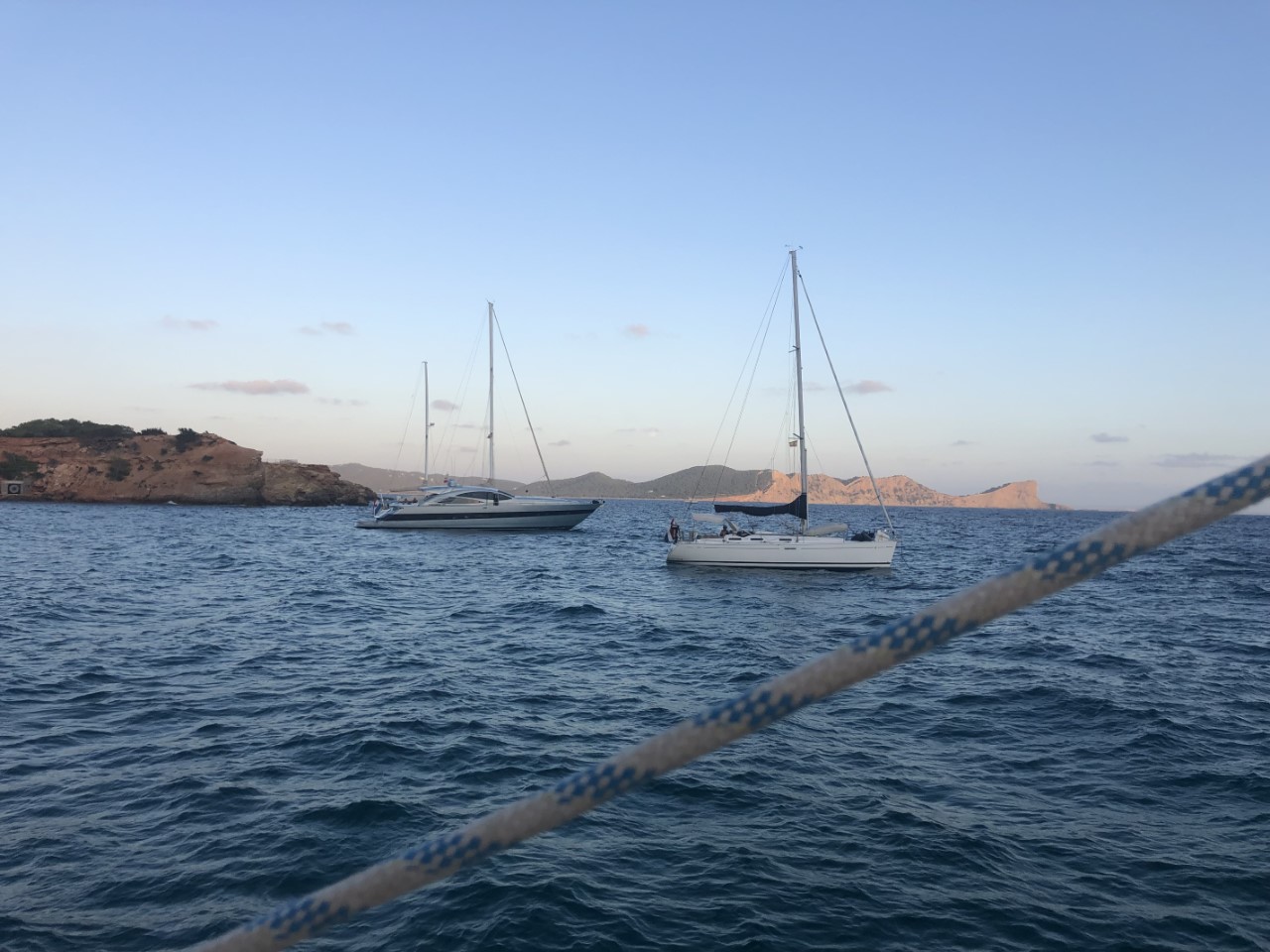 Het is ook niet druk bij Es Bol Nou. We liggen hier met totaal vier boten, waarvan één groot motorjacht met Ibiza-dancemuziek en nog een Nederlands zeiljacht. De dancemuziek heeft wel toeschouwers op de rotswand, waar een huwelijksplechtigheid aan de gang is. De Just hobbelt mee op de muziek en golven, maar we verwachten dat de hobbeligheid de komende uren gaat afnemen. Het is de bedoeling om vanaf hier Ibiza achter ons te laten en maandag de oversteek naar Denia te maken. Dan is het nog maar 45 mijl naar Valencia onze winterhaven.