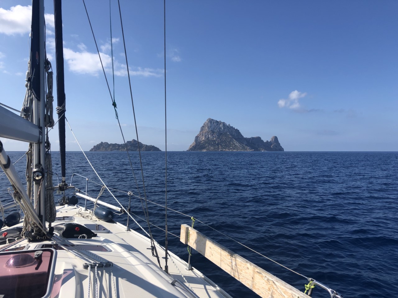 Zo, we hebben het anker opgehaald. Na een volle hectische week verlaten we Cala Tarida. Het is weer een hele puzzel, waar gaan we heen? Maar we hebben de knoop doorgehakt en gaan in de buurt van Ibizastad. Daar is het gunstig met de voorspelde wind en we kunnen gelijk een kijkje nemen voor als Daniel bij ons vanaf het vliegtuig aan boord stapt.