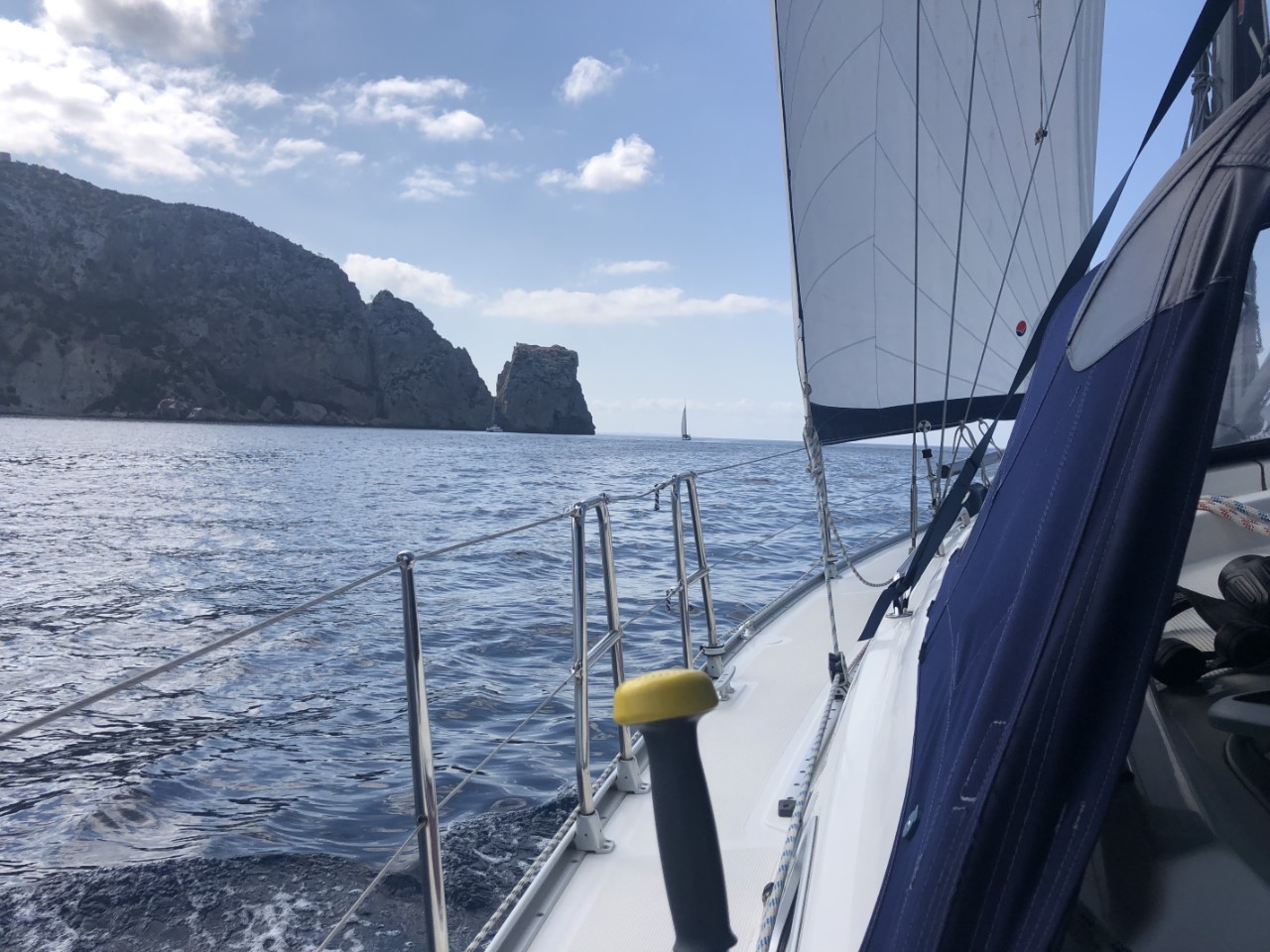 Het is een kort tochtje met alweer een mooie kustlijn. We worden aan beide kanten ingehaald door grote, snel varende superjachten. We twijfelen nog even om bij Es Torrent te ankeren, maar daar is veel zeegras en rotsen. Bij het aankomen in Cala Yondal vinden we het erg druk en alle superjachten die ons hadden ingehaald, vinden dit ook een mooi plekje en liggen al op anker. Maar wij vinden te midden van die jachten een plekje voor ons zeilbootje.
