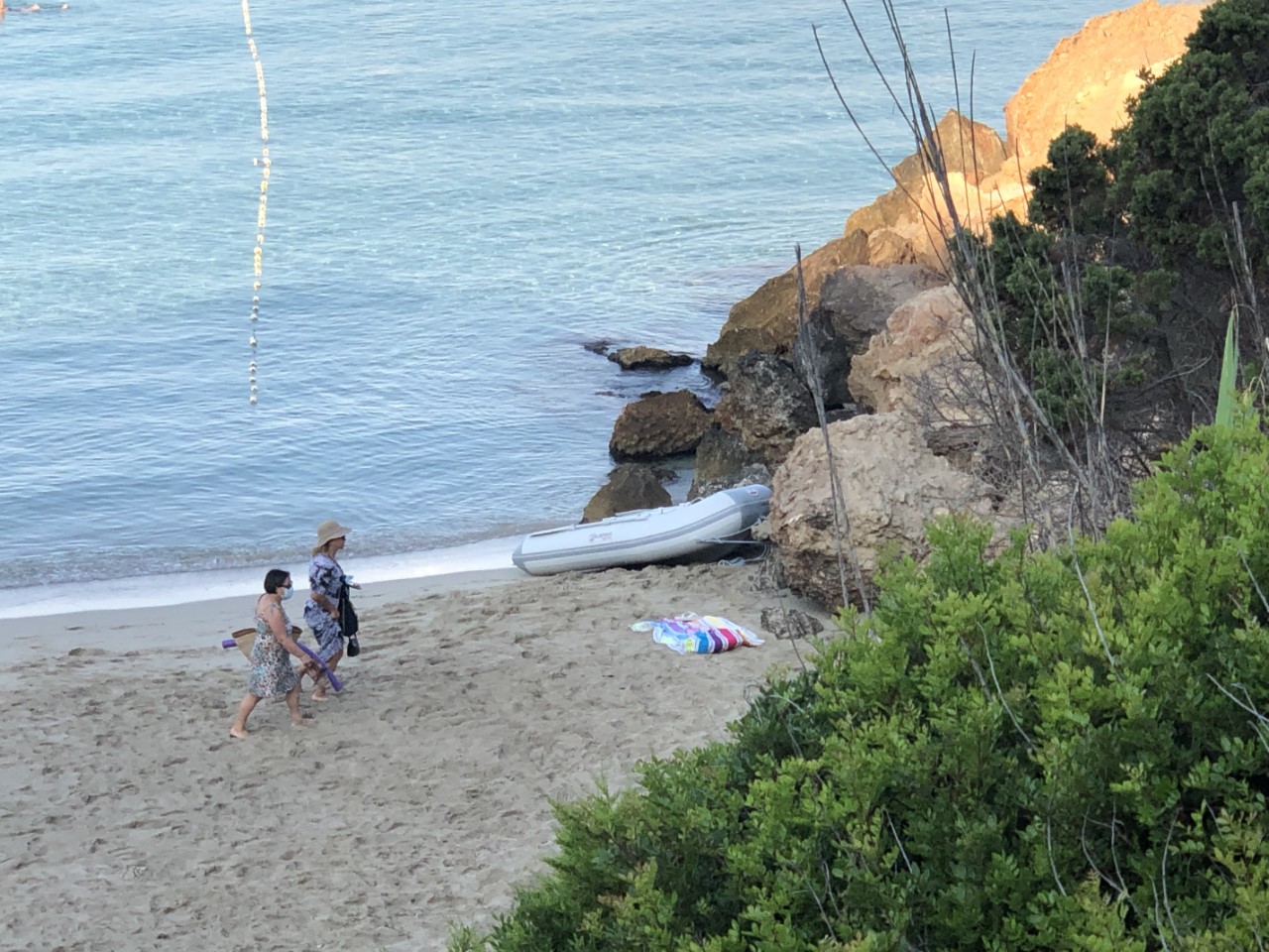 De bus terug gaat ieder half uur en dat gaat redelijk vlot. Maar in Sant Joseph gaat de volgende bus pas rond 17:00 uur en om nou weer twee uur te wachten zien we niet zitten. Op het moment dat Marianne een taxibedrijf belt, komt er toevallig eentje langs rijden. Zodoende zijn we toch snel bij het strandje, waar ons bijbootje is ingebouwd door badgasten. Even peddelen en we kunnen afkoelen in het water. Er ligt hier nog een Nederlandse boot waar we even langs gezwommen zijn. Die hebben goede verhalen over de haven van Valencia, een van de winterhavens die we op het oog hebben.