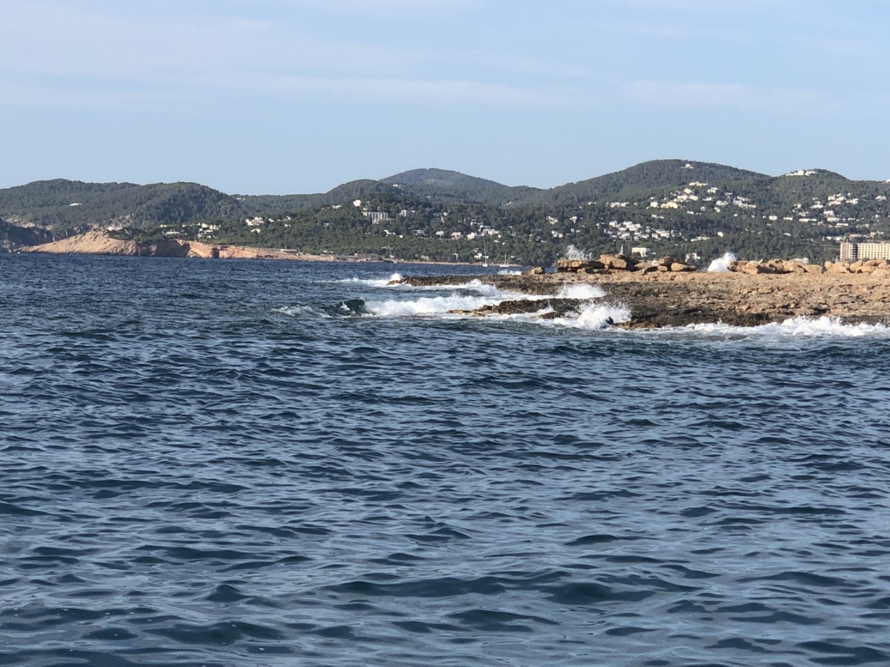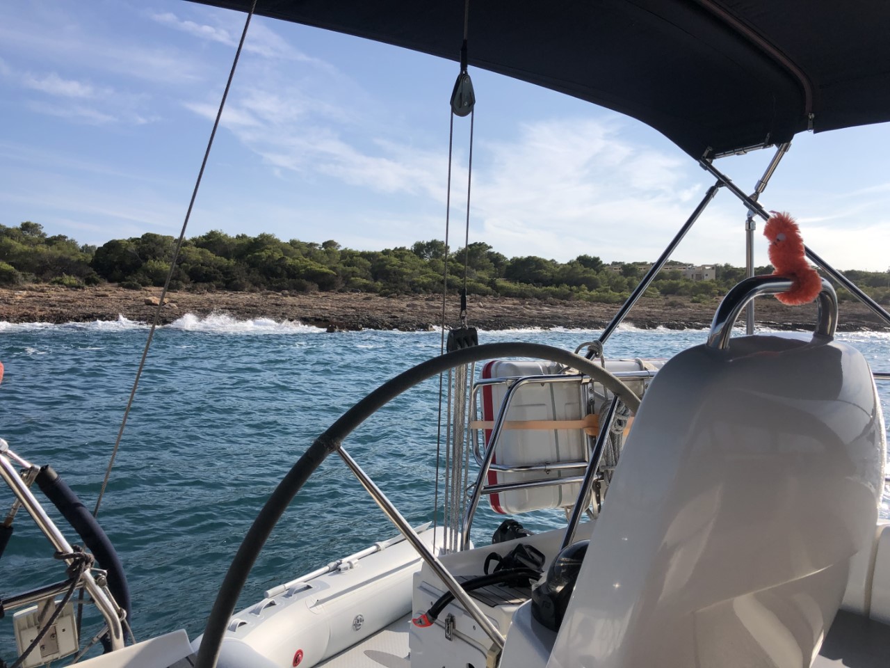 We zijn gaan zoeken, waar willen we heen? Moeilijk, moeilijk, moeilijk. Door de alsmaar draaiende wind en bijkomende swell denken we, dat Port Des Torrent met aan drie kanten beschutting na 14:00 uur een goede optie zal zijn. De beslissing is genomen en de koers uitgezet. Heel de route komen we alleen bootjes tegen, die ons tegemoet komen en in onze richting gaat niemand. We zijn toch maar stug doorgevaren. We zijn wel Port Des Torrent ingevaren en er lag een catamaran als enige, die aardig in de golven lag te deinen. Wat dan? Toch een boei in Port Antonio, die ook niet beschut is, of voor de haven ergens voor anker, We kozen voor het laatste. Links van de haven is een strandje en het is er redelijk druk met bootjes. Maar schijn bedriegt. Er zijn grote velden met zeegras en we zien niet een mooie zandplaat. Na twee keer langsvaren zien we vlakbij het strandje een plekje tussen twee andere boten. Er is hier geen swell en de wind wordt goed afgedekt door de kustlijn. Bij de tweede poging denken we vast te liggen met het anker, maar door een draaiende wind komen we na een tijdje dicht bij een van onze buren. Dan nog maar een keertje ankeren, maar de wind gaat draaien en het plekje is te smal, vinden wij. Jammer, want we kunnen hier makkelijk naar de kant voor boodschappen. Maar we halen ons anker in en gaan opnieuw naar Port Des Torrent. Alleen nog die catamaran ligt er en de golven zijn wel minder dan vanmorgen, maar niet heel veel. Toch maar het anker gedumpt. We zijn het gedein na twee dagen een beetje zat en gaan het hier maar proberen. De voorspellingen zijn goed, nu alleen nog de uitvoering “bijna windstil uit het oosten”, dan hebben we hier een prima plekje.