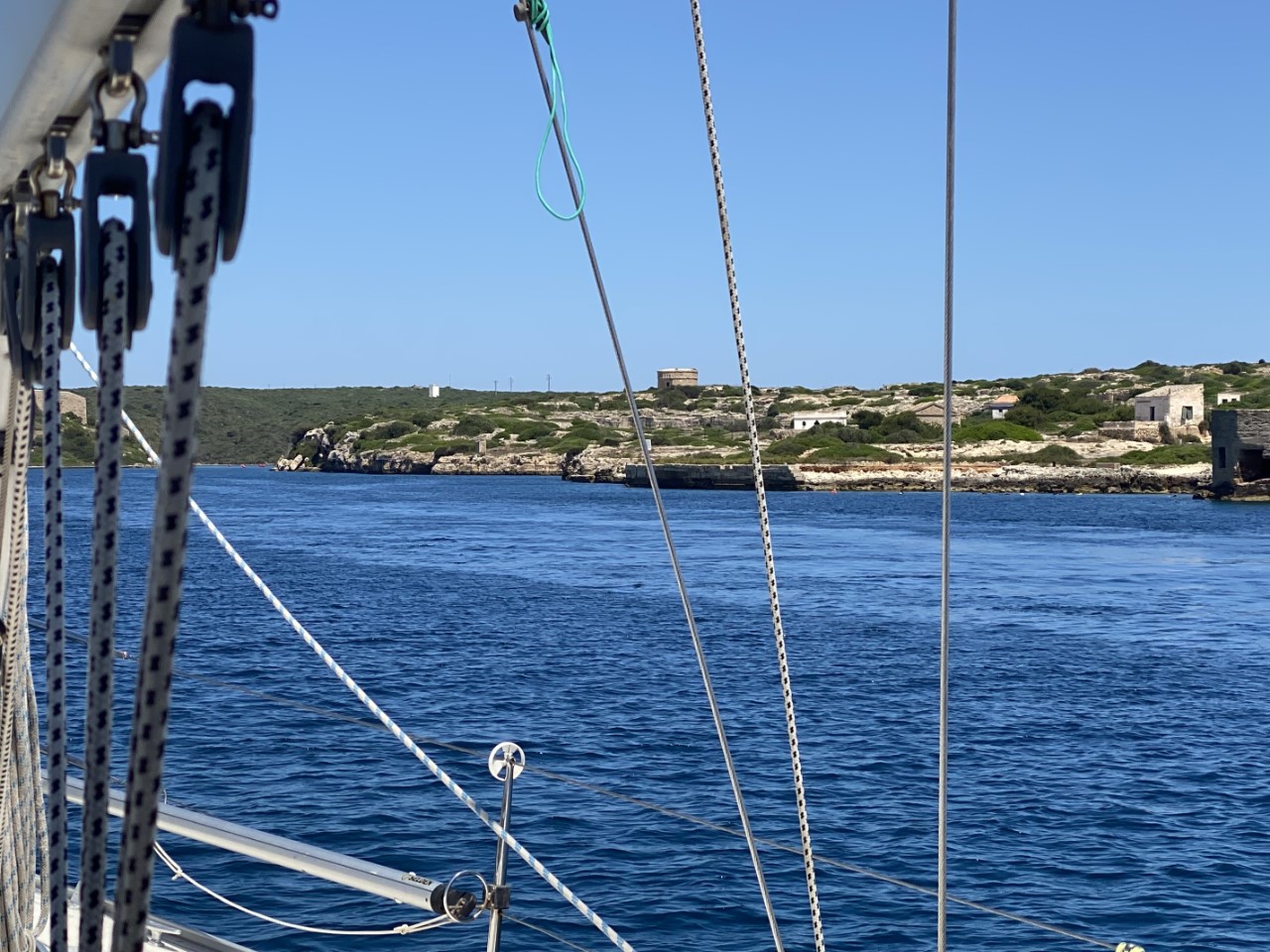 Daar zien we tot onze verbazing ook de Sans Souci liggen. Een vertrekkersboot waar we op YouTube weleens een filmpje van hebben gezien. Ik neem gelijk een duik om het anker te controleren en zwem een rondje om de Just. Na onze lunch roeien we naar een klein strandje om daar een wandeling te maken. Daar zijn we snel mee klaar. Er is een weg naar een fort wat je kan bezichtigen, maar daar hebben we geen zin in. Terug bij het bijbootje maken we een praatje met Frank en Jessica, de bemanning van de Sans Souci. Een beetje over hun ervaringen en die van ons. Zij willen morgen oversteken naar Sardinië en wij misschien vrijdag voor onze langste tocht ooit.