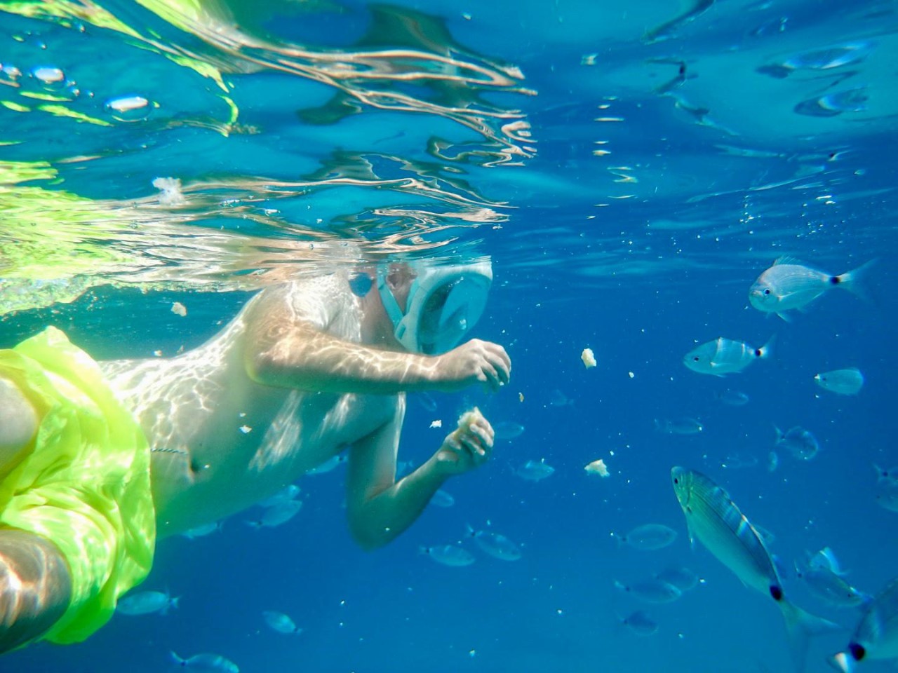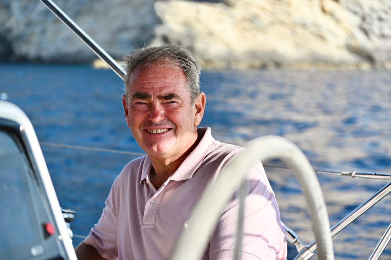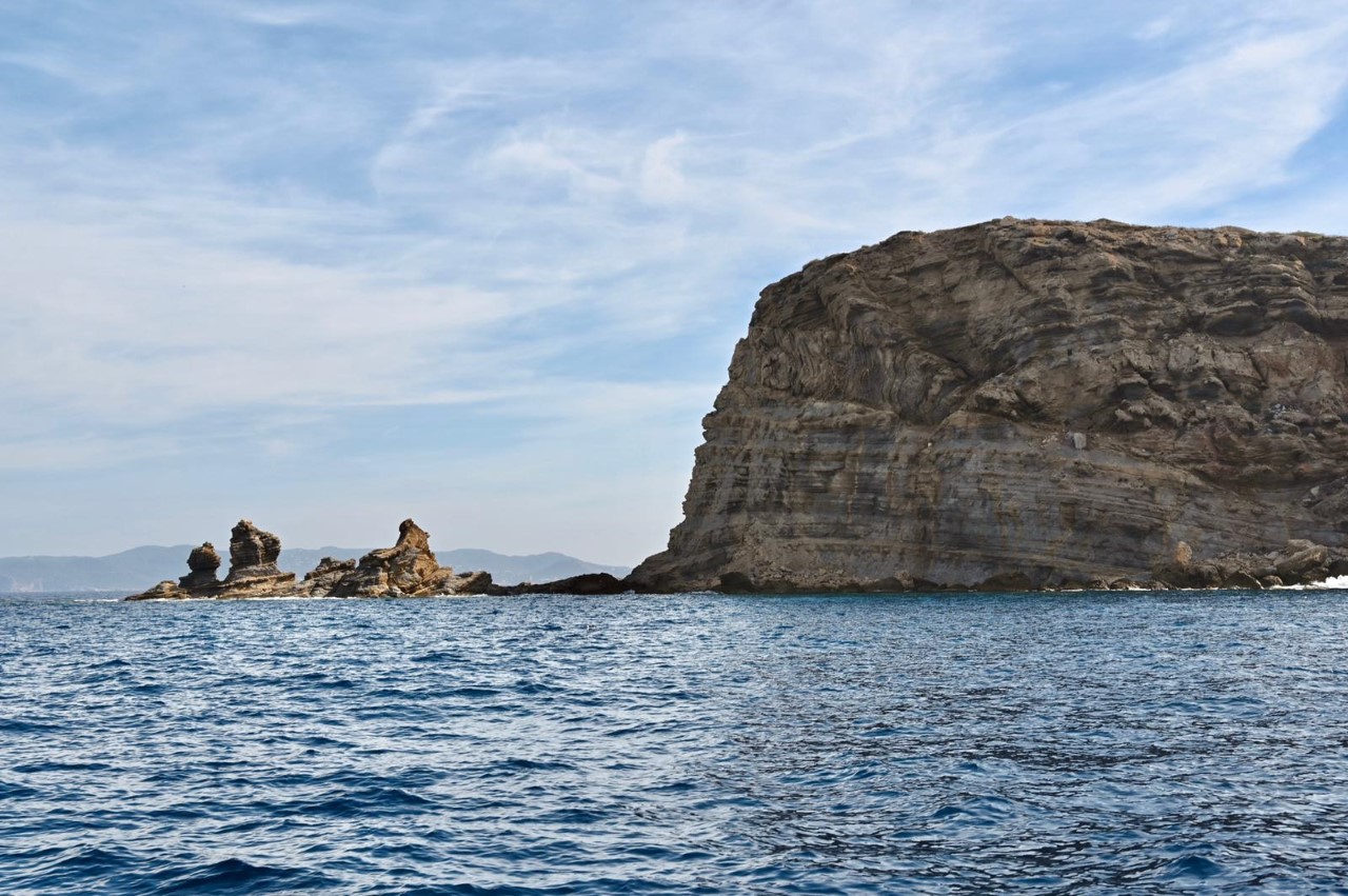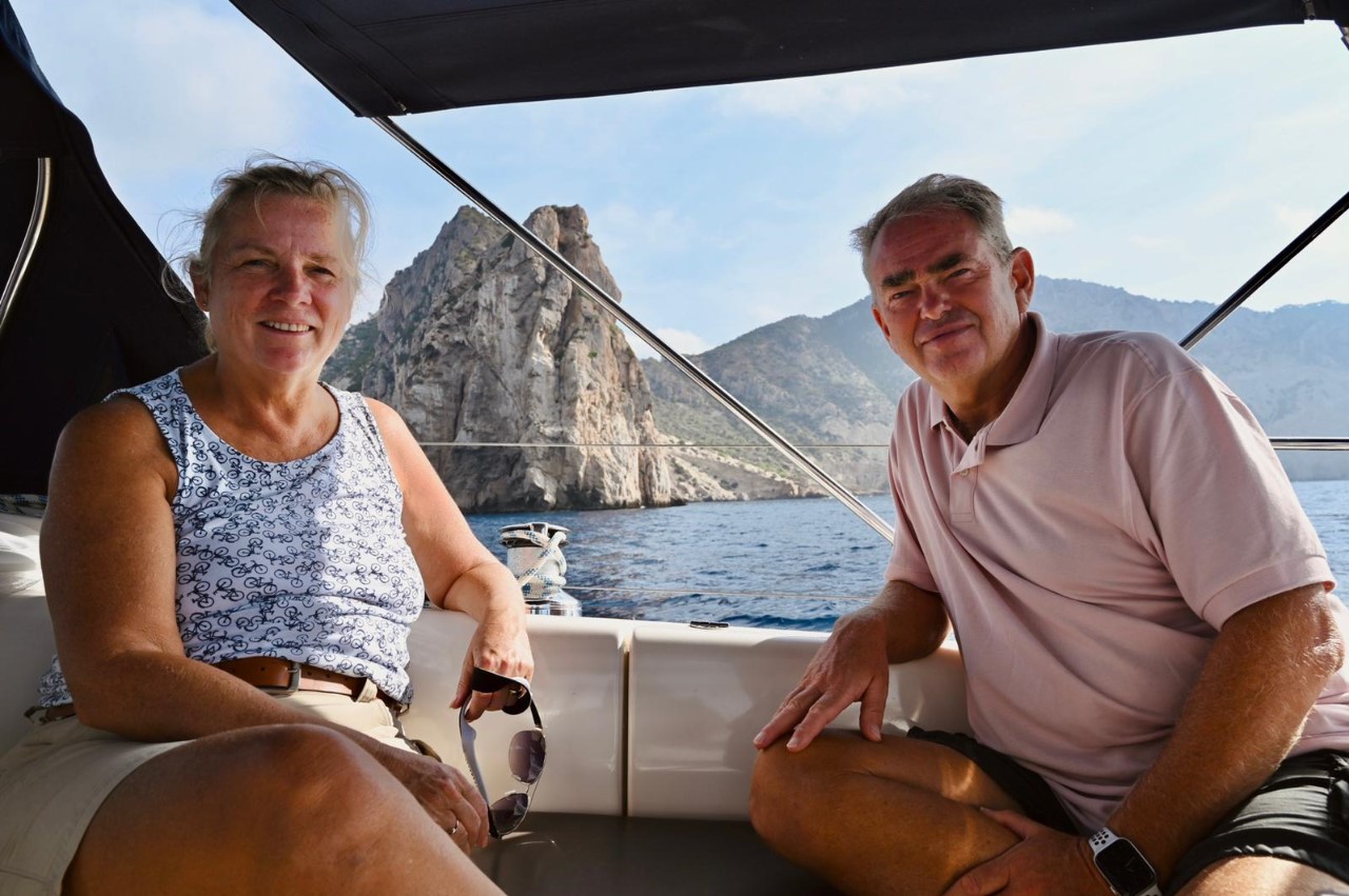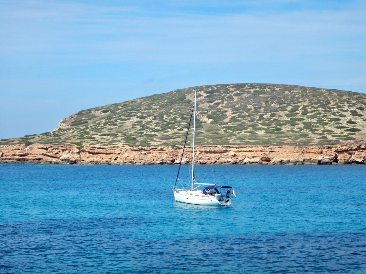 We zijn via een toeristische route via alle Cala’s uiteindelijk beland in Cala Comte, die was het gunstigst qua wind en swell en we verwachten hier een mooie zonsondergang. Na het ankeren liggen we snel in het heerlijke heldere water, waar we honderden visjes om ons heen hebben. Mark en Marianne gaan op excursie naar het strandje door eerst naar de rotsen te zwemmen. Daarna komen ze langs een aantal strandtenten op een smal strandje, dat aan beide zijden water heeft en vol ligt met zonaanbidders.