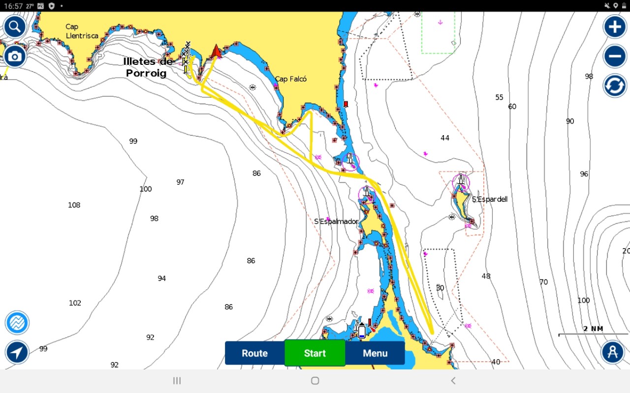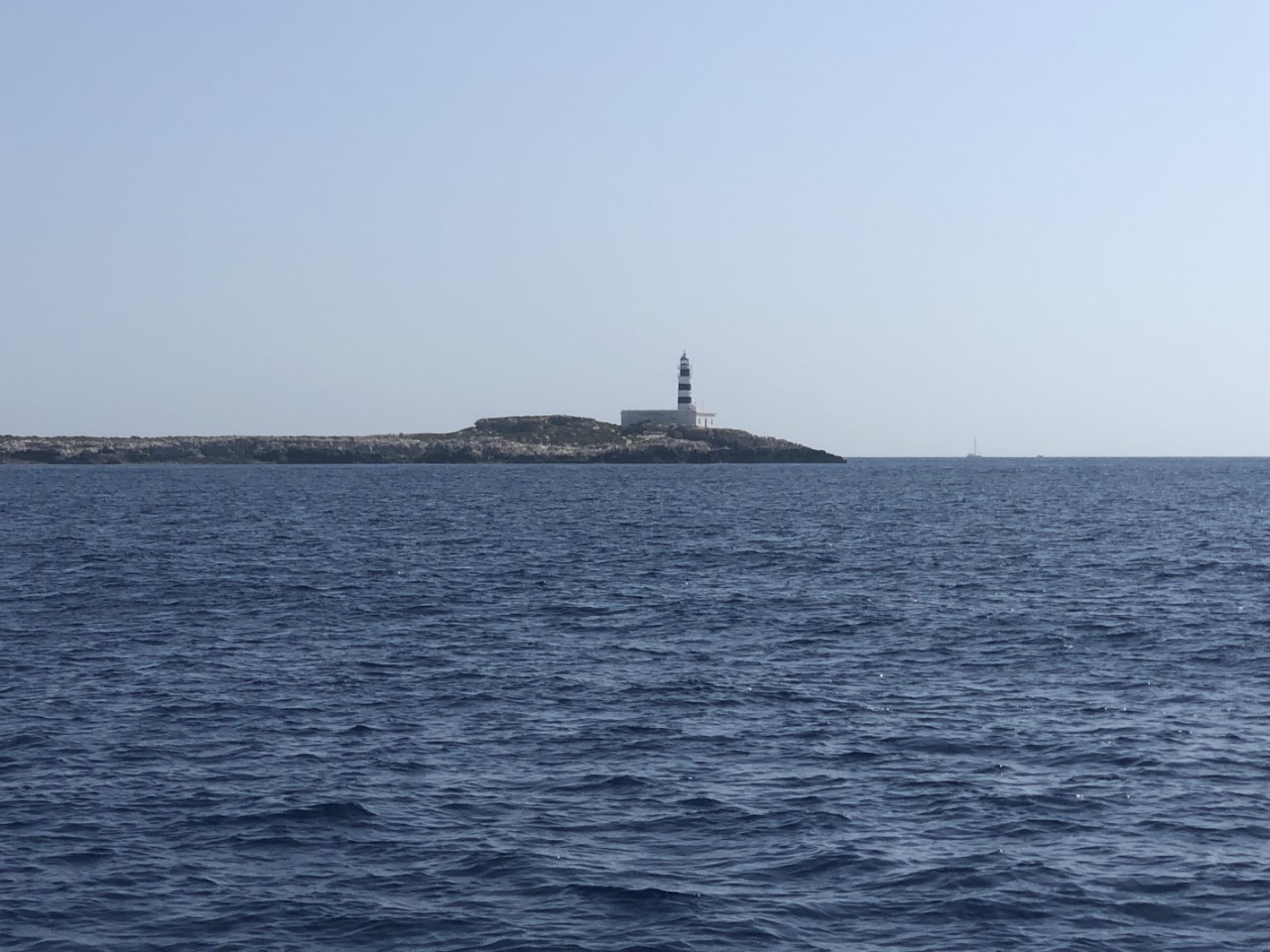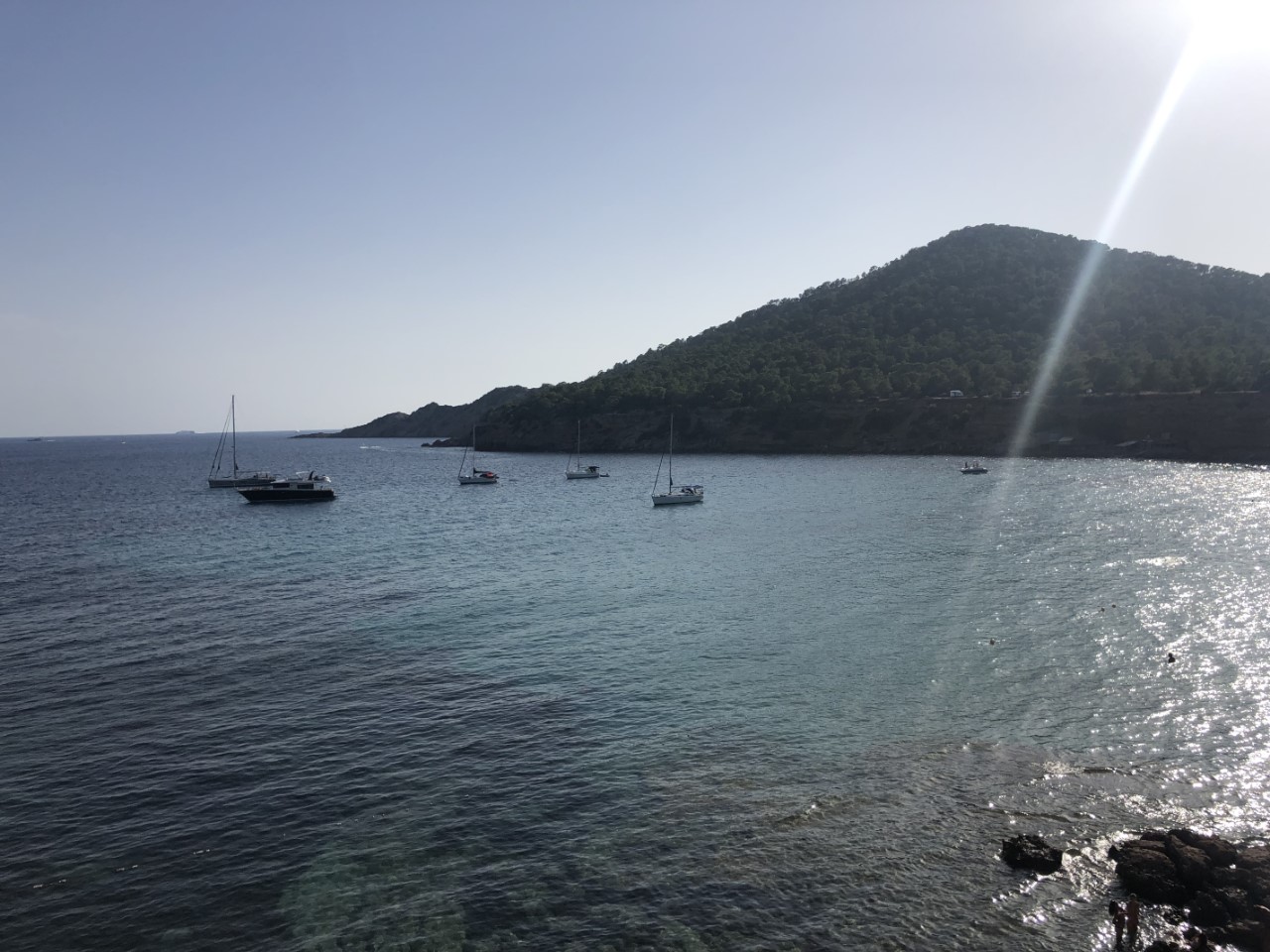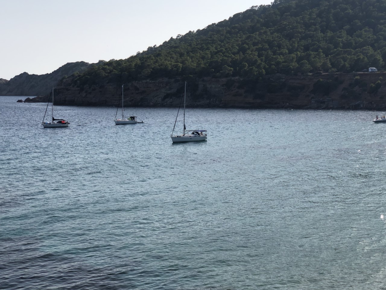 We nemen een kijkje in de eerste baai, die we tegen komen, maar die ligt bezaaid met moorings á € 50,-. Dat vinden we voor nu geen optie, dan maar naar Sa Caixata. Wel een beetje gekke beslissing, want dat is nog voor de baai waaruit we vanmorgen zijn vertrokken. Maar met de AIS zien we dat het daar erg druk is en de baai waar we nu voorbij varen, is stukken rustiger. Dus een flinke draai naar stuurboord naar Es Bol Nou. We vinden een mooi plekje in een rustige baai vlakbij een strandje met maar een paar andere bootjes. Uiteindelijk liggen we nu nog geen 1.8 mijl van ons vorige plekje, terwijl we de halve dag hebben gevaren.
