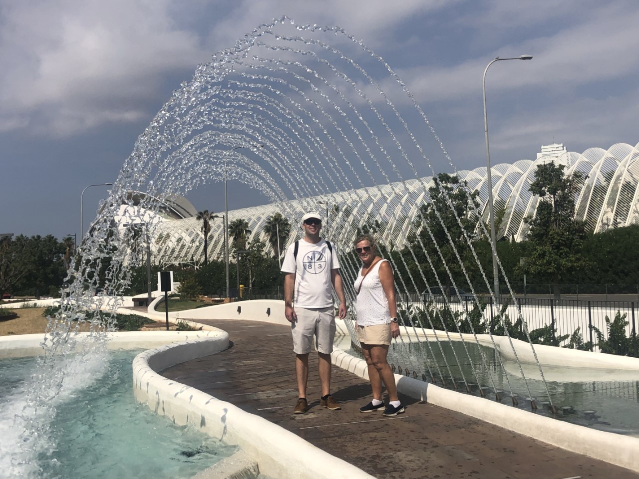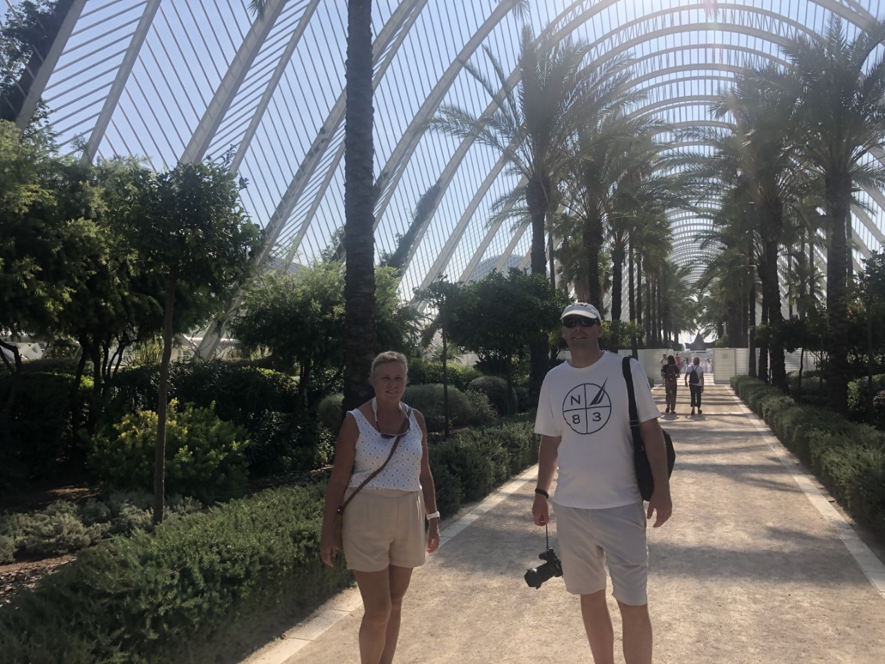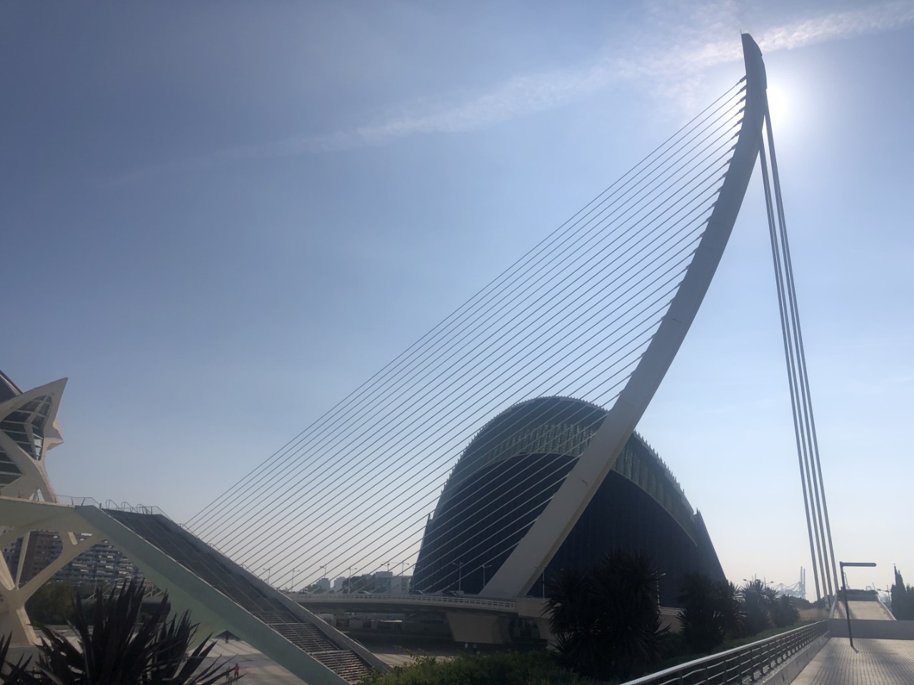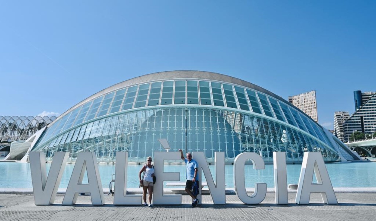 Ik was er vroeg uit, maar helaas… Even slenteren op zoek naar een bakkertje was er niet bij. Met het stepje is er sneller een bakkertje gevonden. Na ons ontbijt hebben we de fietsen ook tevoorschijn gehaald, de accu’s zijn volgeladen. Mark gaat als onze gids op het stepje naar ons eerste doel de “Stad van Kunst en Wetenschap”, waar naast een bijzondere brug ook de beroemde bouwwerken van Calatrava staan. We hebben daar ook het techniek museum bezocht. Na al dat moois zijn we een groot winkelcentrum ingedoken voor wat verkoeling en wat te drinken. Hier lopen we tegen een Mediterraans buffetrestaurant aan, waar we heerlijk hebben geluncht.