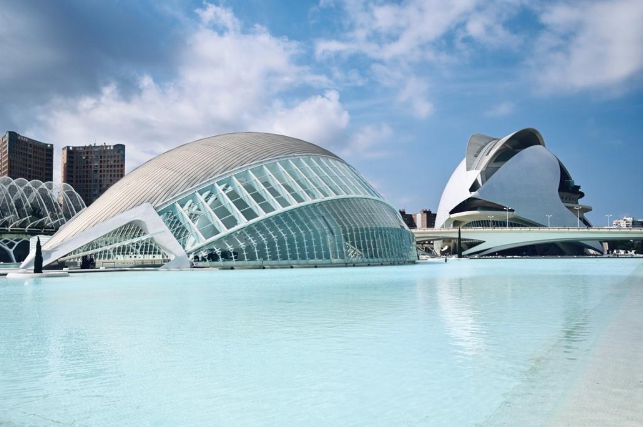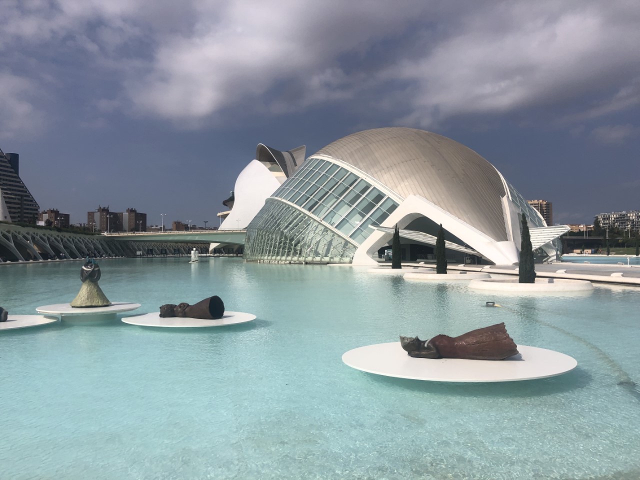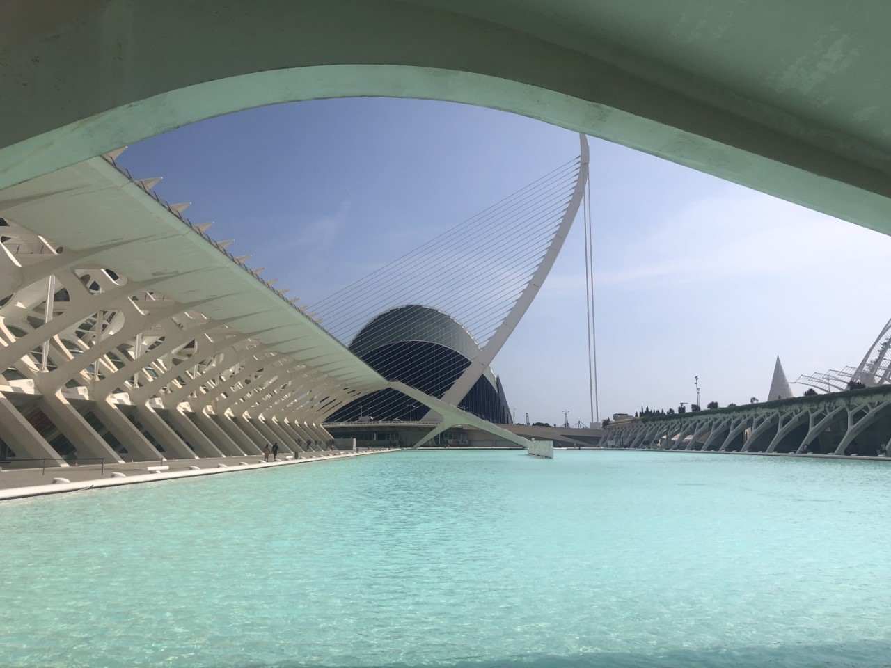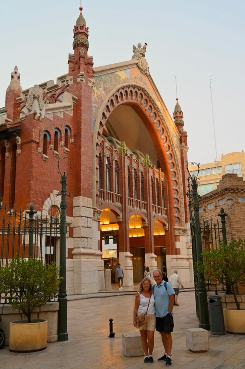 Ik was er vroeg uit, maar helaas… Even slenteren op zoek naar een bakkertje was er niet bij. Met het stepje is er sneller een bakkertje gevonden. Na ons ontbijt hebben we de fietsen ook tevoorschijn gehaald, de accu’s zijn volgeladen. Mark gaat als onze gids op het stepje naar ons eerste doel de “Stad van Kunst en Wetenschap”, waar naast een bijzondere brug ook de beroemde bouwwerken van Calatrava staan. We hebben daar ook het techniek museum bezocht. Na al dat moois zijn we een groot winkelcentrum ingedoken voor wat verkoeling en wat te drinken. Hier lopen we tegen een Mediterraans buffetrestaurant aan, waar we heerlijk hebben geluncht.