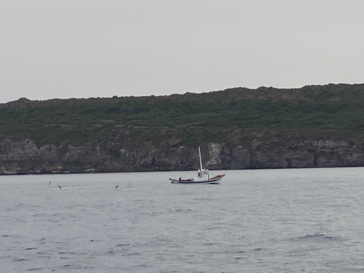 De wind en de golven vallen reuze mee, behalve dat we de wind weer op de boeg hebben. Iets na het passeren van de rotspartij I. Del Meli, zien we in de verte een lange rij meeuwen, denken we. Het blijkt een hele lange rij witte boeien te zijn van zeker 1,5 mijl, waar we een grote boog omheen moeten maken. Marianne gaat even languit en ik kijk of we een leuk, beschermd ankerplekje tegenkomen. Gisteren hadden we al gekeken naar Punto Di Masua, die redelijk afgeschermd ligt voor de noordelijke wind en de noord-westelijke swell.