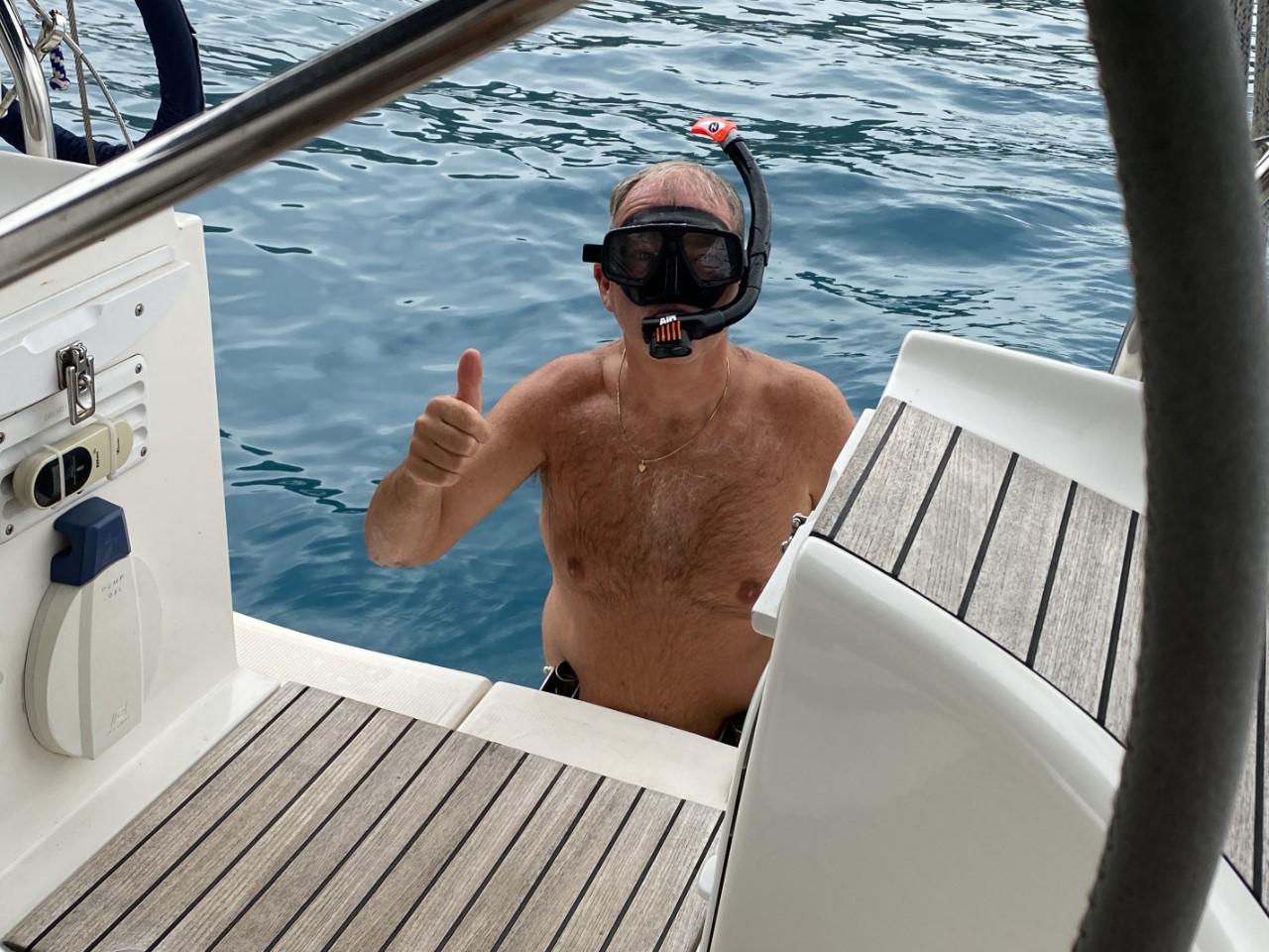 Marianne wordt gewekt en is het er mee eens om de koers te verleggen. Met de verrekijker zien we dat er nog 2 zeilboten voor anker liggen. Dichtbij het ankerplekje nemen de wind en golven af en straalt de warmte je tegemoet. Er liggen al wel 2 zeilboten, maar er is ruimte genoeg. Wij vinden een grote zandplaat op 7 meter diep. We denken dat we een goede keus hebben gemaakt, een mooie baai, uit de wind en swell en heerlijk helder zwemwater. Tegen 16:00 uur neemt de wind iets toe en de swell wordt hoger. We liggen nu best wel te schommelen en denken en hopen, dat die swell in de nacht weer gaat afnemen. Anders vertrekken we morgenochtend vroeg naar Golfo de Oristano, waar we misschien beter kunnen ankeren.