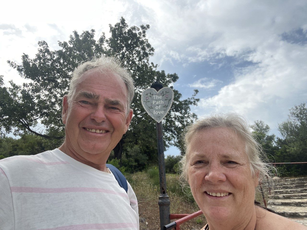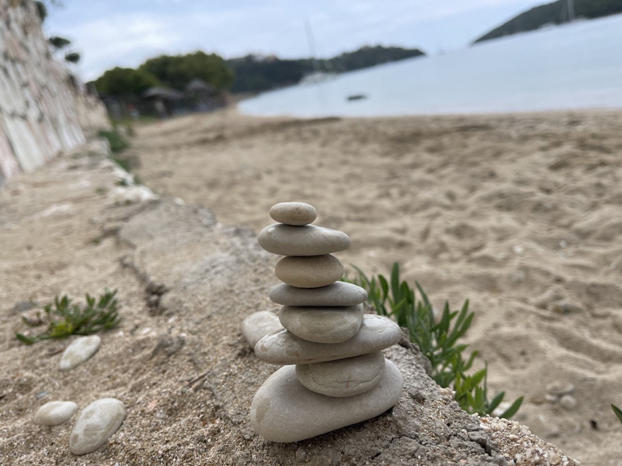 Eindelijk een wandeling naar een warme bakker voor lekker vers brood. Het zuurdesembrood van de Lidl was ook lekker, maar een wit puntje smaakt ook voor het ontbijt. Het is een beetje half bewolkt met een zwak zonnetje. Net voldoende om toch naar het strandje te wandelen. Het strandje bestaat merendeels uit kiezels en kleine stukjes zandstrand. Marianne is zo stoer om een duik te nemen en ik houd me bezig met het bouwen van een kiezelstenentoren. Jammer genoeg begint het zachtjes te regenen, dan willen we net het pad (The path of love) naar de Just oplopen en het zonnetje breekt weer door.