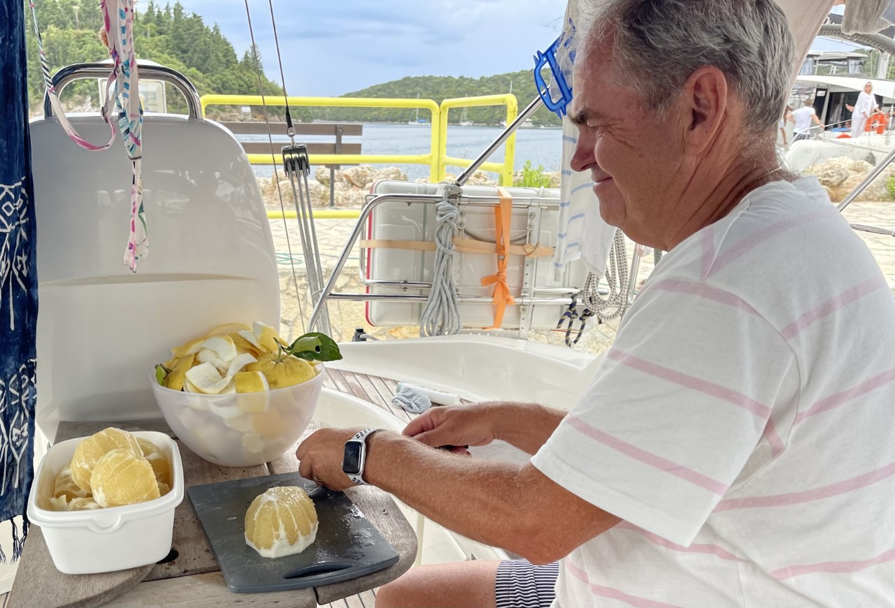Aangekomen op het haventerrein staat er een klein vrachtautootje, die uit z’n laadbak sinaasappels, grapefruits en citroenen verkoopt. Wij nemen een baal van vijf kilo grapefruits. Op de Just hebben we die schoongemaakt en van z’n vliesjes ontdaan.