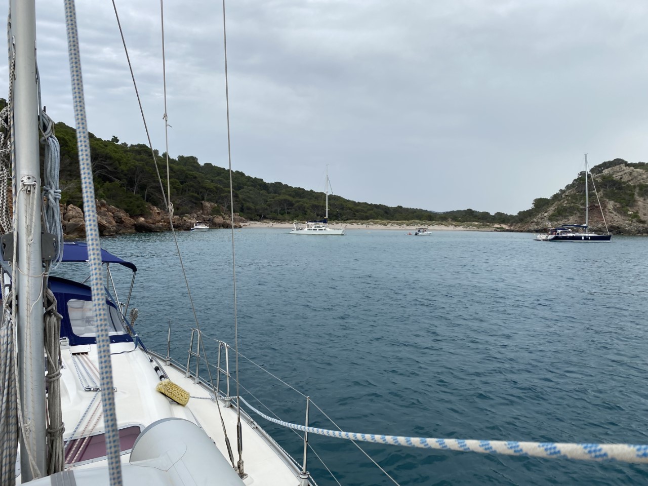 Het is een rustig zeil-motortochtje naar de Cala, die we op het oog hebben. Aangekomen in de Cala hebben we keus uit 3 ankerplekken, die allemaal een goede zandbodem hebben. In 1 van de Cala’s liggen 2 bootjes en we vinden het een beetje saai aanzien en de andere ligt niemand, maar daar is wat swell. De 3de ziet er erg druk uit. Toch nemen we maar een kijkje, want er is een prachtig strand en volop natuur. We vinden er toch een ruime ankerplek. De bedoeling was om te gaan BBQ-en, maar het is heel de dag al bewolkt. We hebben daarom het menu omgewisseld. Marianne maakt 2 luxe stokbroodjes gezond met veel kip en wat bacon. We zijn net klaar met de afwas als Trudi en Arno van de Maat met het bijbootje komen aanvaren. Met een luxe glaasje water hebben we gezellig zitten kletsen.