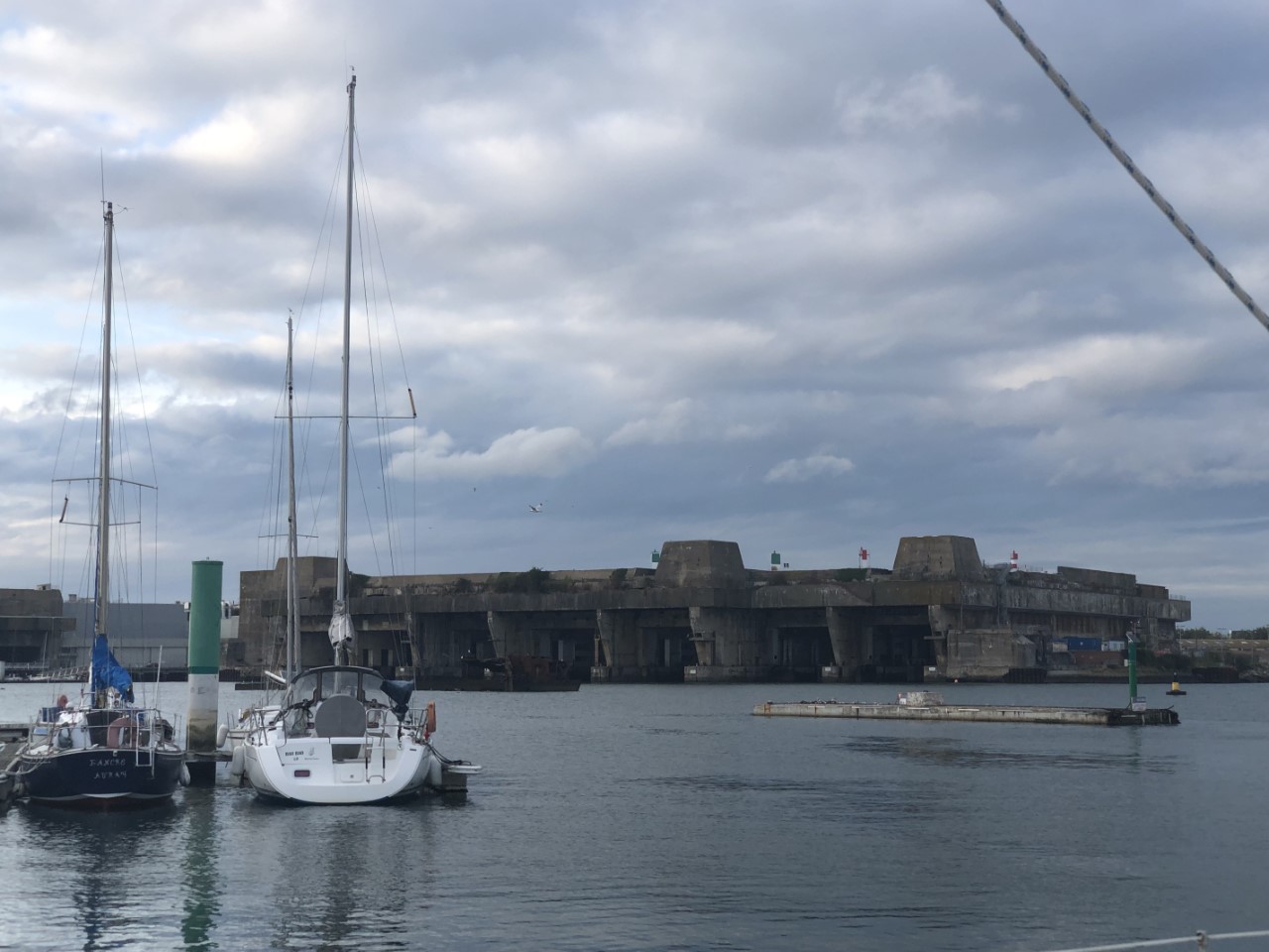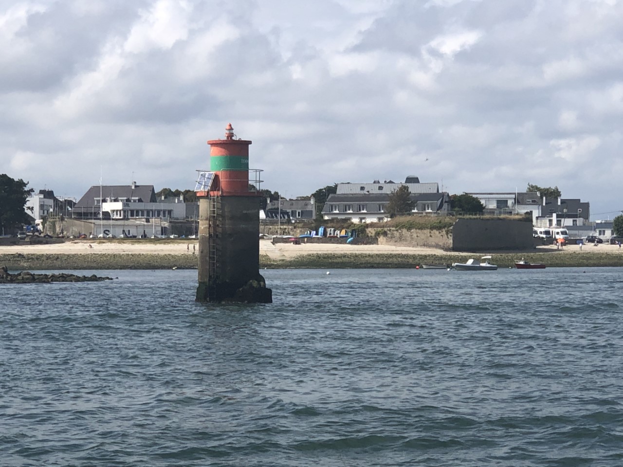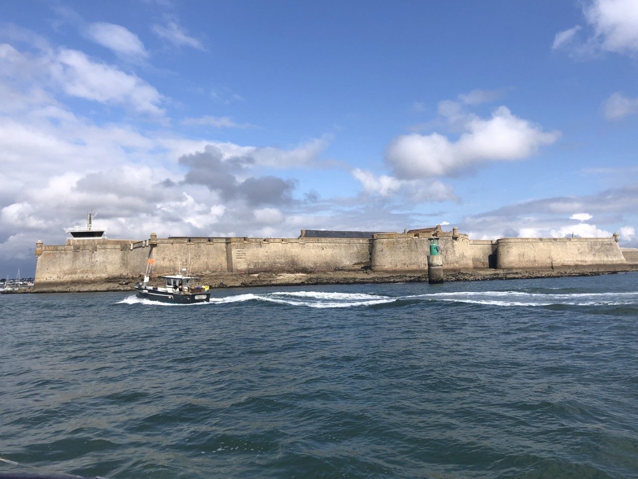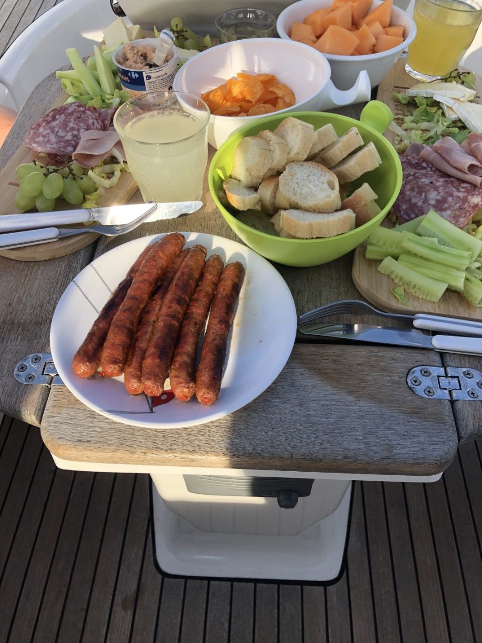 Met een boodschappenlijstje bij ons gingen we naar Les Halles, om daar inkopen te gaan doen. Maar het was iets kleiner en minder gesorteerd dan we hadden verwacht. Er waren wel drie viskramen waar ik in een grote boog omheen liep. Marianne en Daniel waren toch benieuwd welke vis we hadden gevangen. We vroegen een visboer welke vis het was. Aan de hand van onze foto’s werd het lijk werd geïndentificeerd als een Chinchard oftewel een Horsmakreel. We gingen daarna snel richting Carrefour, want ik had het wel gehad met het mortuarium. Ik overweeg echter niet om vegetariër te worden. Om de hoek hebben we de inkopen gedaan voor onze Tapas maaltijd voor vanavond. Terug op Just zijn we na Marianne’s Nespressootje uitgevaren. Na die perfecte zonnige zeildag van gisteren hadden we weer op een complete zeiltocht gerekend. Maar na 10 mijl was de wind op en dreven we meer achter- dan vooruit. Om beurten deden we een klein tukkie op dit motortochtje. Er werd nog voorzichtig gevraagd of er nog gevist gaat worden. Maar na mijn eerste moord wilde ik eerst een behandeling PTSD om dit trauma te verwerken. Maar ik had steun aan de crew en de paravaan bleef in de doos. Ze namen een broodje. Toen we vlakbij Lorient waren, leek het wel de Solent, zoveel zeilbootjes op het water en veel voor anker bij Ile de Groix. Op het marifoonkanaal van de haven hoorden we constant aanvragen voor een box en ook voor meerdere dagen. Maar gelukkig was er ook plek voor ons. Marianne heeft gelijk de haven in het centrum gereserveerd, omdat we vandaar uit makkelijk de auto kunnen ophalen, die we voor het weekend gehuurd hebben. En vooral ook omdat er weer een storm verwacht wordt op vrijdag. Als alles is geregeld bij de capitainerie, kunnen we de Tapasplankjes gaan opmaken voor ons maaltje. Je hebt in deze streek heel veel crêpes restaurants, maar zelf een dun pannenkoekje bakken kunnen we ook op de Just en zo hadden we een lekker toetje. Morgen hebben we een heel klein tochtje naar Lorient Centre of als er toch een zonnetje staat, eerst even naar Ile de Groix.