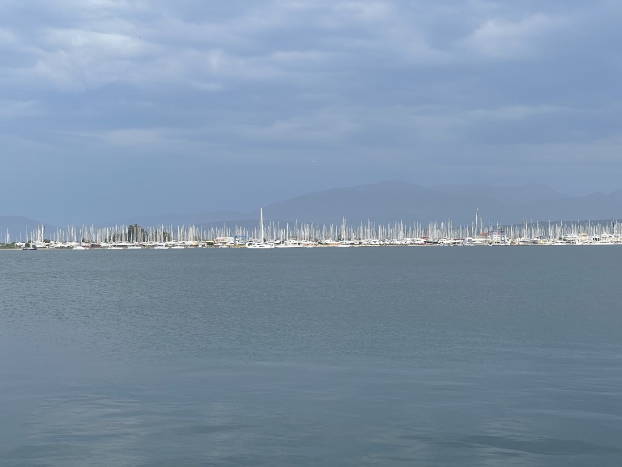 Terug op de stadskade is het weer omgeslagen. De golven klotsen tegen de kade en we liggen aan lager wal. Per half uur verslechtert de situatie. Er is steeds meer wind en deining. We beginnen te twijfelen of het wel een goed moment is om uit te varen. Eerst maar ontbijten. Rond 10:00 uur vertrekt er een zeilboot. Dat lijkt goed te gaan, totdat hij z’n anker niet meer verder kan ophalen. Wat daarna gebeurt, is “crazy”. Als een boer die z’n akkers ploegt, gaat hij vlak langs alle andere boten, die hun ankers hebben uitstaan. De wind blaast hem dwars op de boegen van de schepen aan de kade. We horen een klap en een harde klap van het geraakte schip dat naar achteren op de kade botst. Nog steeds haakt het anker dat nu omhoog is, in de ketting van een ander en een van de schippers stapt in een rubberbootje om de ketting er af te tillen. Hij valt in het water, samen met zijn buitenboordmotor. Ik haal hem op de kant. Twee andere boten zijn genoodzaakt om hun anker op te halen, omdat ze geen grip meer hebben. Zij meren opnieuw aan. Wij blijven gelukkig gespaard.